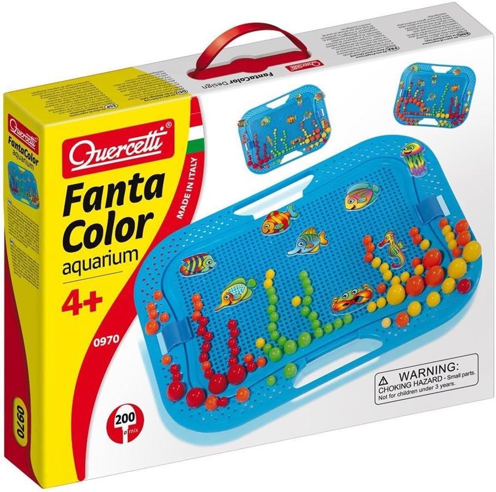 I nuovissimi Fantacolor Aquarium e Garden fanno parte dell'intramontabile linea dei chiodini Quercetti che ha divertito generazioni di bambini I fantastici ambienti marini faranno da sfondo al nuoto simpatici pesciolini, meduse, granchi e cavallucci marini Questi simpatici animaletti cambiano colore, si muovono e fanno l'occhiolino grazie alla speciale stampa lenticolare con cui sono realizzati Il cestino-cornice traforato con i bordi arrotondati e i pratici ganci di chiusura, come la tavoletta senza spigoli, assicurano lunghe ore di gioco in piena sicurezza e con la massima funzionalità La confezione contiene: 200 Chiodini in 3 diametri diversi (5, 10, 15 mm) in 4 colori, 1 tavoletta traforata senza spigoli, 1 Cornice-cestello con maniglie, 1 piedino, 8 pesciolini in plastica