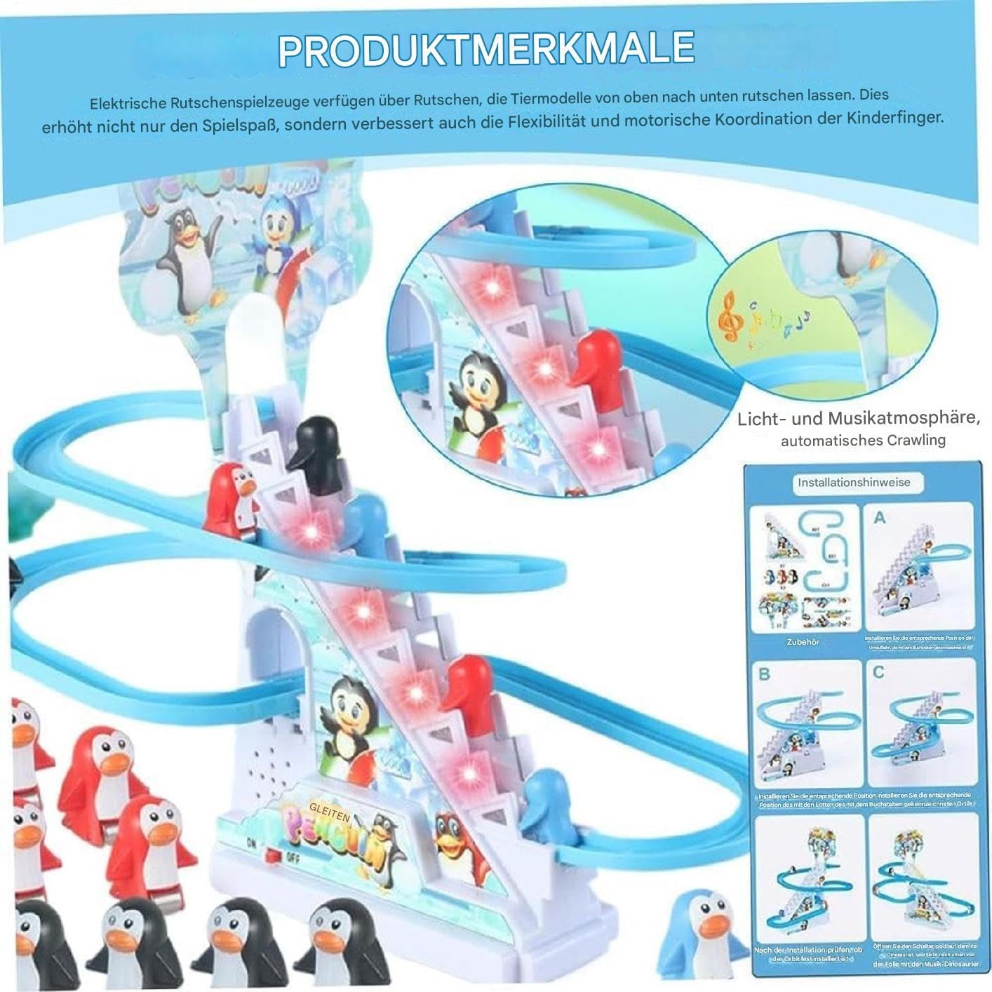 Esperienza interattiva emozionante: eccitante giocattolo da corsa con pinguini che offre ore di divertimento a bambini e bambini e fa ridere e partecipare in ogni gioco emozionante Ravviva le tue occasioni: il giocattolo scivolo pinguino è un complemento perfetto per qualsiasi celebrazione e aggiunge tensione con musica vivida e LED lampeggianti. Mentre i pinguini scivolano, suoni vivaci e allegri creano un'atmosfera festosa che tiene tutti occupati e intrattenuti Incoraggia l'interazione sociale: aumenta il divertimento del tuo bambino guardando i pinguini correre, scivolare e scivolare lungo la pista. Questo stimolante giocattolo antiscivolo a forma di pinguino è perfetto per sviluppare la coordinazione occhio-mano indispensabile e promuovere l'interazione sociale Aggiornamento senza soluzione di continuità: grazie al suo design semplice a batteria, alla facilità di installazione e all'uso con 2 batterie AA (non incluse), il giocattolo da pista pinguino assicura che il divertimento inizi rapidamente. Da gustare ovunque, a casa o all'aperto Outlet creativo: questo giocattolo scivolo pinguino con il suo circuito colorato e le accattivanti funzioni interattive è un regalo perfetto per la stagione invernale. Delizia i bambini di tutte le età ed è il modo perfetto per aggiungere allegria e divertimento in ogni occasione