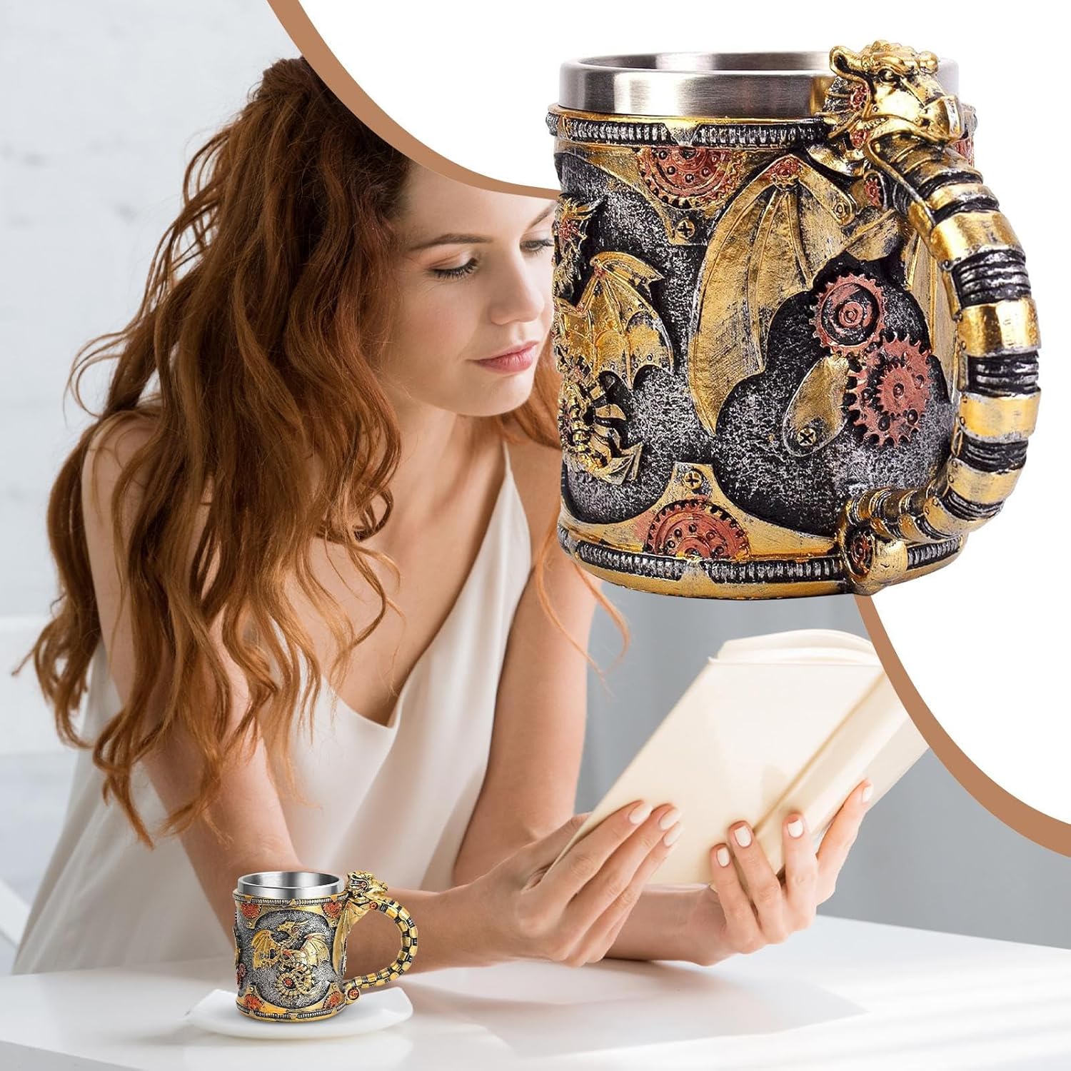 Fantasy Art Decor: combinando ispirazione steampunk e lavorazione meccanica in rilievo, questa tazza con drago dorato presenta un tema fantasy, ideale per gli appassionati di decorazioni artistiche Presa comoda: il design di questa tazza resistente alla temperatura e al sudore presenta un esterno in resina testurizzata con un inserto in acciaio inossidabile per prestazioni durature e distinzione visiva Il comfort incontra la funzionalità: la tazza con drago presenta superfici antigraffio e una finitura opaca per una maggiore durata, completata da un comodo design della maniglia che garantisce un consumo senza soluzione di continuità con il suo bordo adatto alle labbra garantisce un'esperienza senza sforzo Molteplici occasioni: ideale per bicchieri da festa e uso quotidiano a casa casa o lavoro. Questa tazza da 400 ml supporta la compatibilità multi-bevanda, rendendola una soluzione per tutte le bevande per caffè, tè o altre bevande. Ottimo regalo: un must per i collezionisti, questa tazza con drago combina il fascino dei bicchieri cerimoniali con il suo ruolo di decorazione per feste a tema, rendendola una scelta eccellente per gli amanti del fantasy immersi nella cultura geek