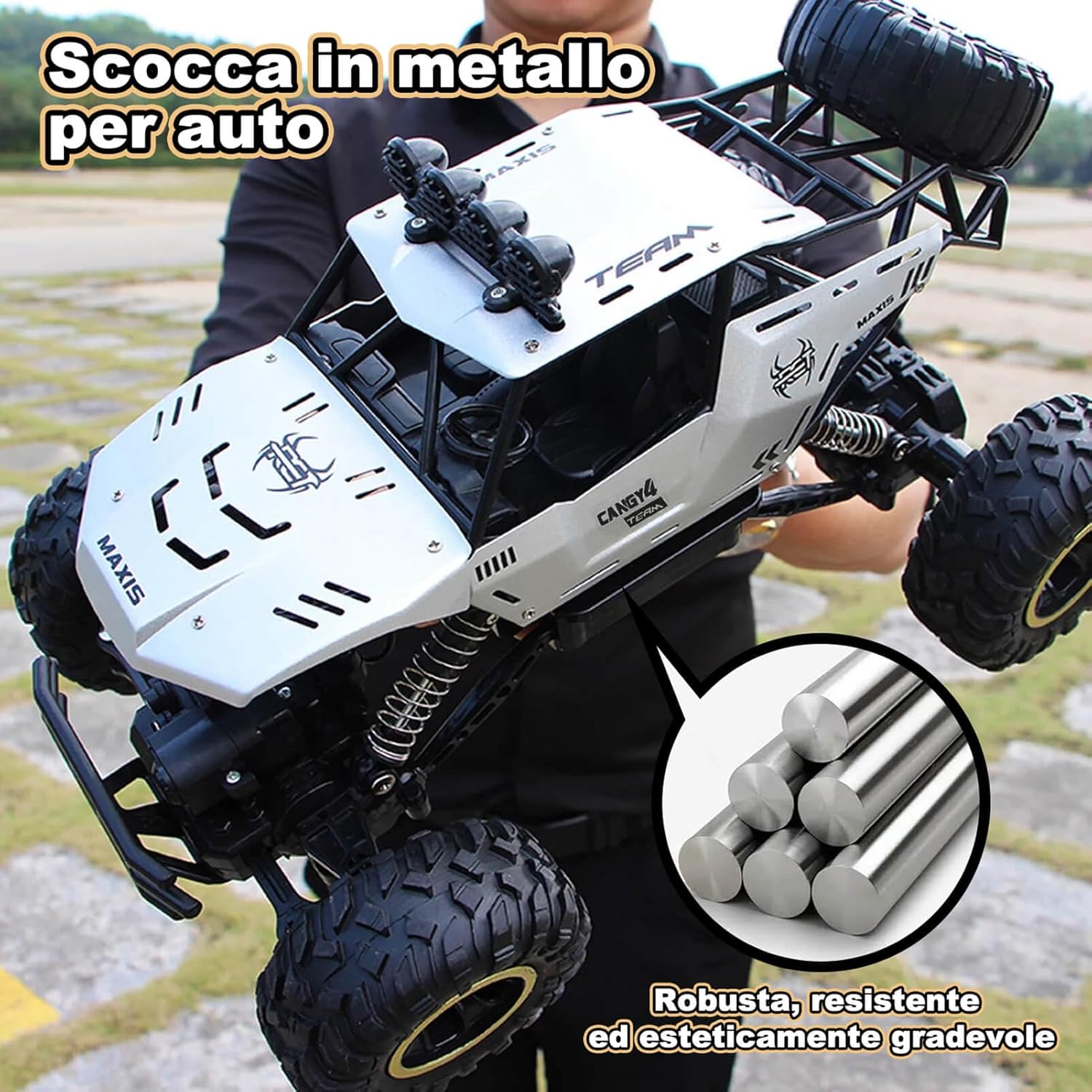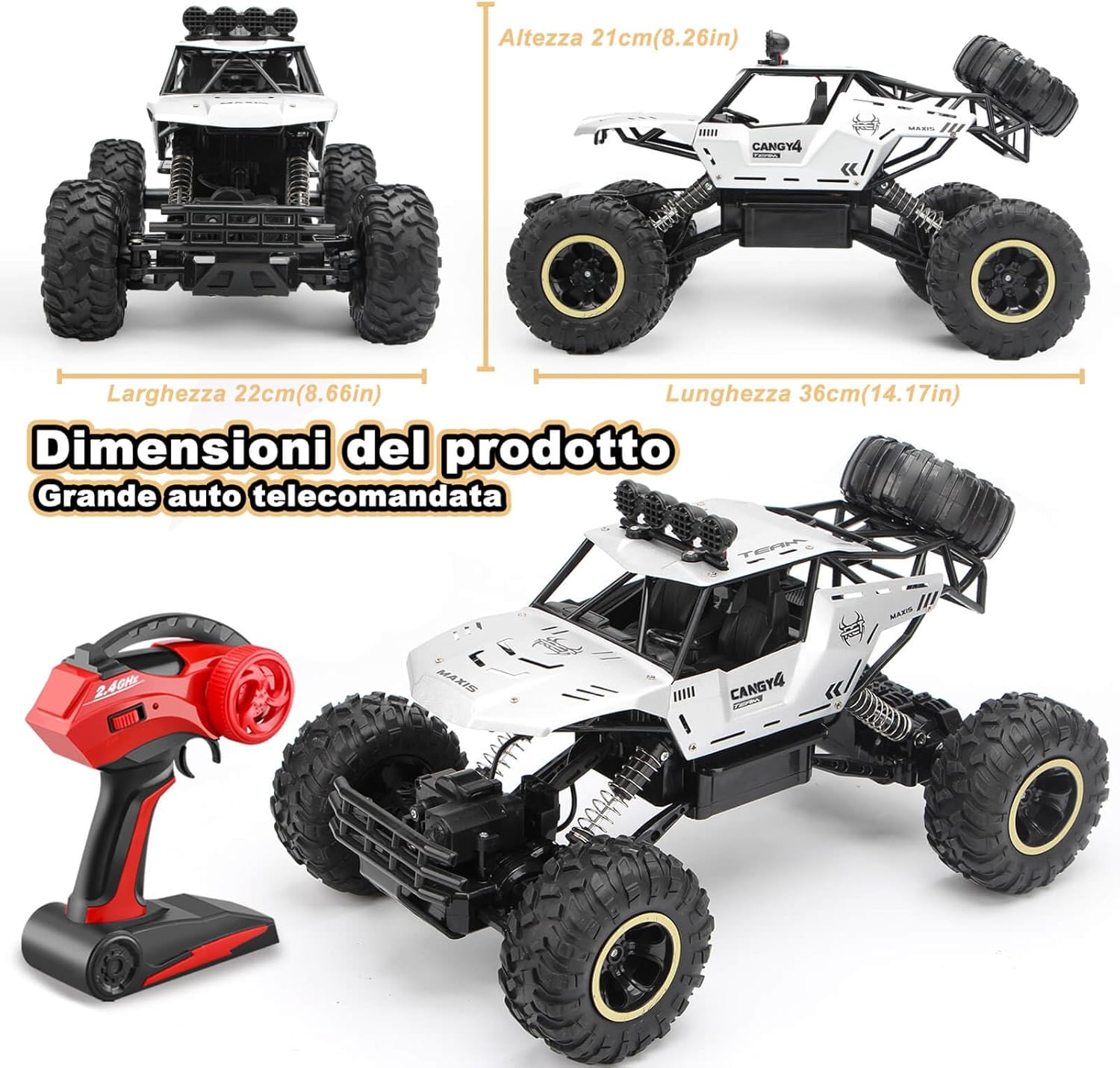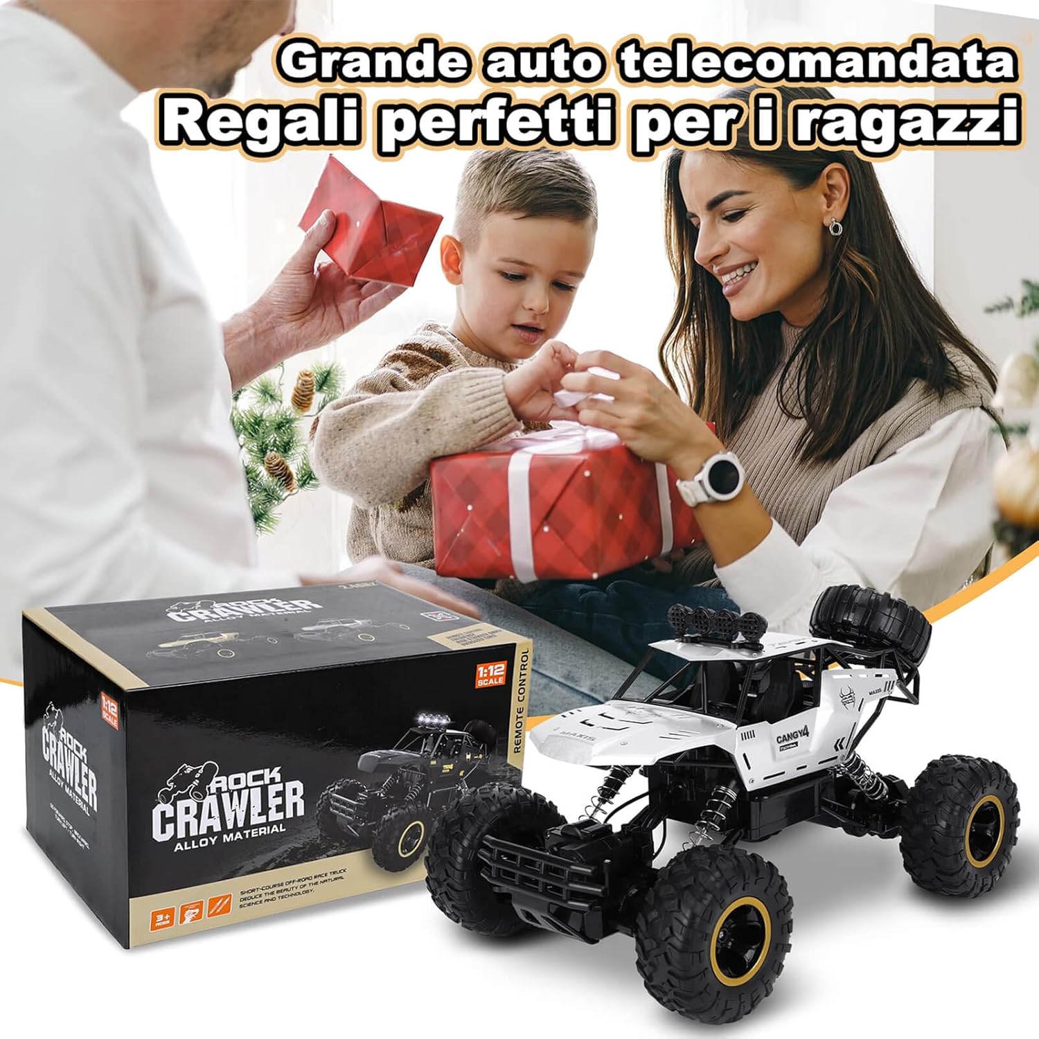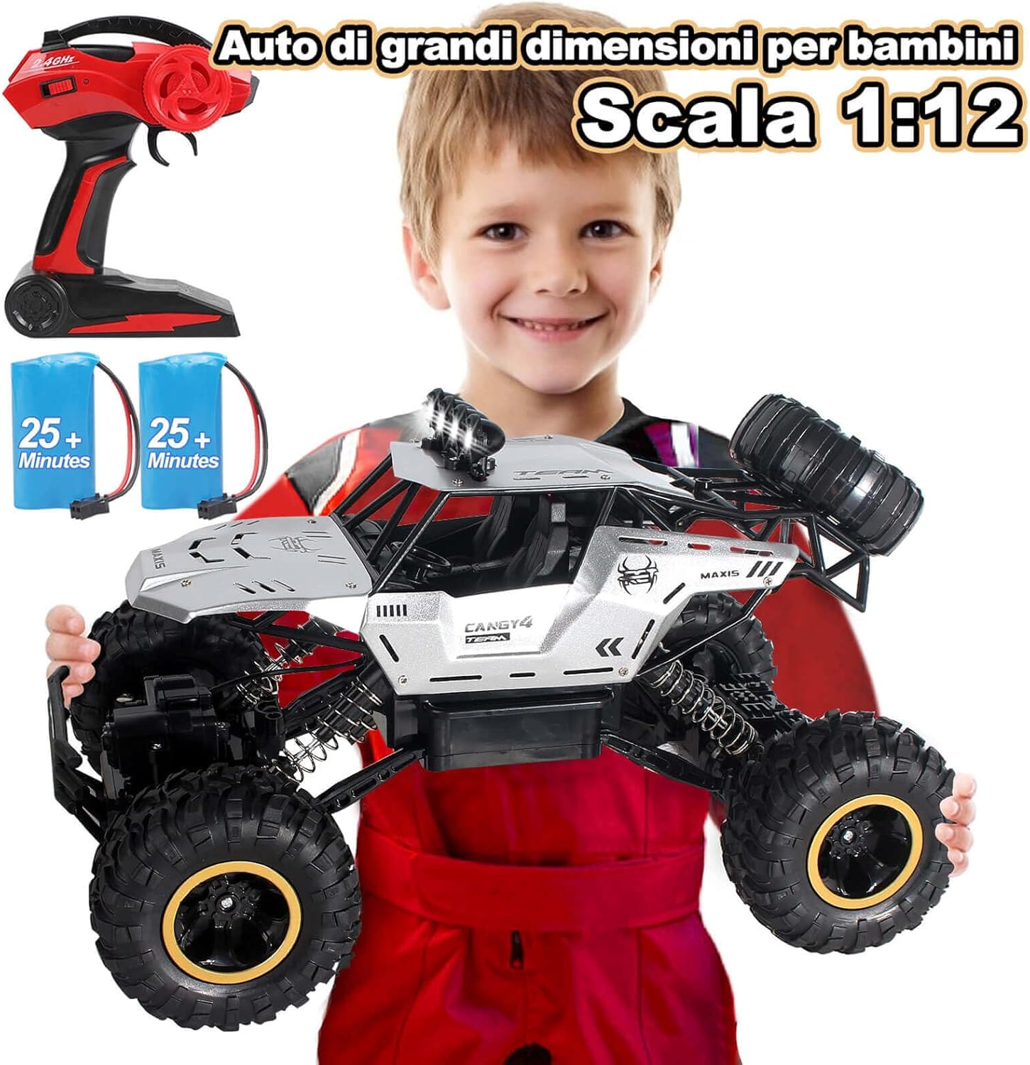 Auto telecomandata da 2,4 G a lunga durata: la tecnologia radio a 2,4 GHz offre un controllo stabile ed è resistente alle interferenze. Macchina telecomandata alimentato da 2 batterie ricaricabili che consentono una durata di oltre 50 minuti, ideale per un lungo divertimento. Grande auto telecomandata con design realistico: il modello 1:12 di un fuoristrada è lungo 36 cm e dispone di caratteristiche dettagliate come fari illuminati, una vera attrazione e perfetto per collezionisti e giocatori. Macchina Telecomandata per Bambini Giochi 6 7 8 9 10 11 12 Anni. Forte capacità fuoristrada per qualsiasi terreno: Auto telecomandata è dotata di un potente motore a quattro ruote motrici che offre una forte potenza, combinata con pneumatici da 9,5 cm con una trazione eccellente. Perfetto per sabbia, erba, ghiaia e molto altro ancora: una vera esperienza fuoristrada. Può offrire ai vostri bambini una ricca esperienza di guida. Giocattoli per macchina telecomandate di materiali resistenti: il telaio in plastica ABS ad alta resistenza e la carrozzeria in metallo sono durevoli e resistenti agli urti. Le sospensioni su tutte e quattro le ruote assorbono gli urti e i materiali durevoli di alta qualità prolungano efficacemente la durata auto telecomandata. Regalo ideale del giocattolo dell'auto: sia per avventure all'aperto che per divertirsi al chiuso, questa potente auto telecomandata offre un divertimento unico, ed è un regalo ideale per compleanni o natale.