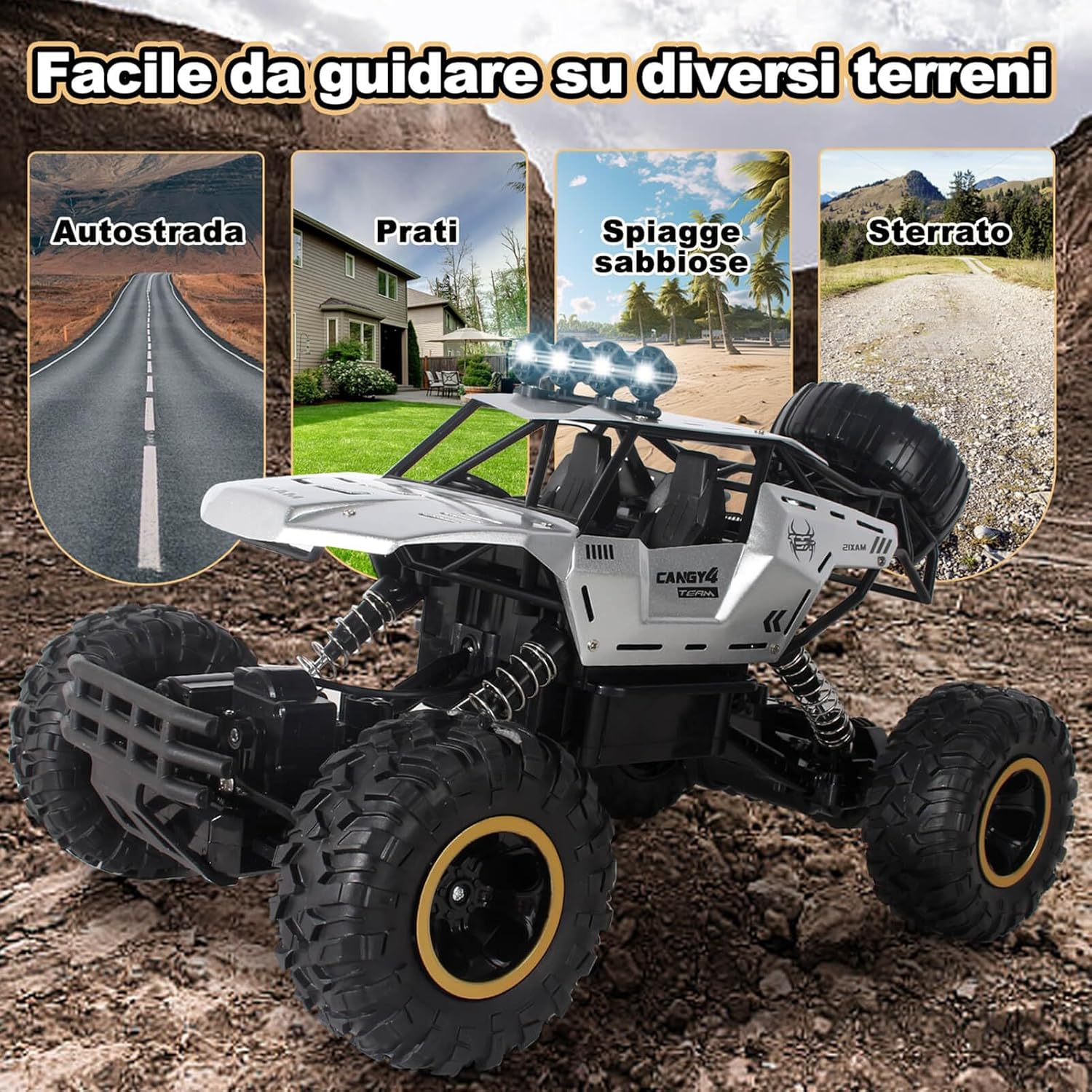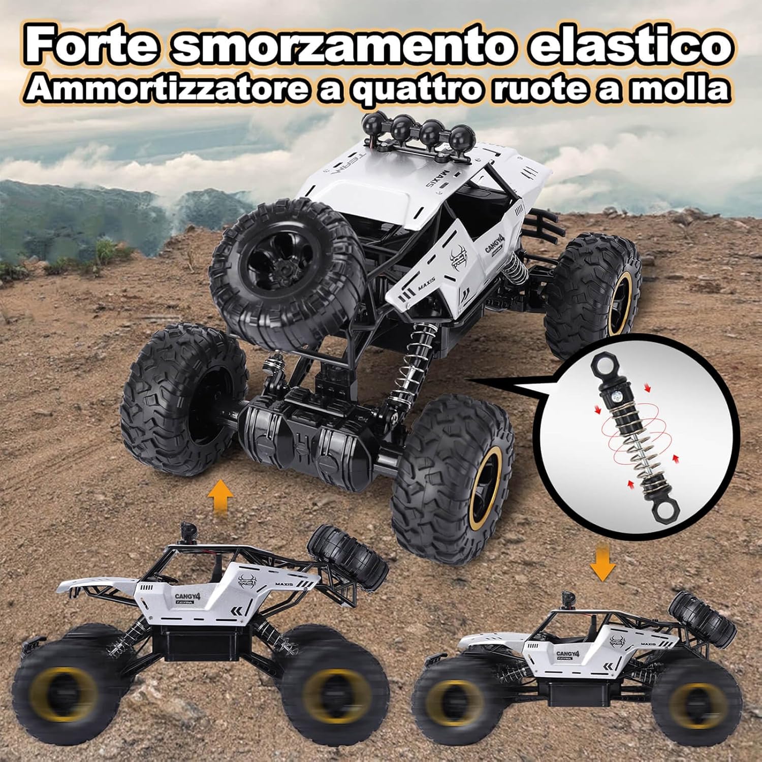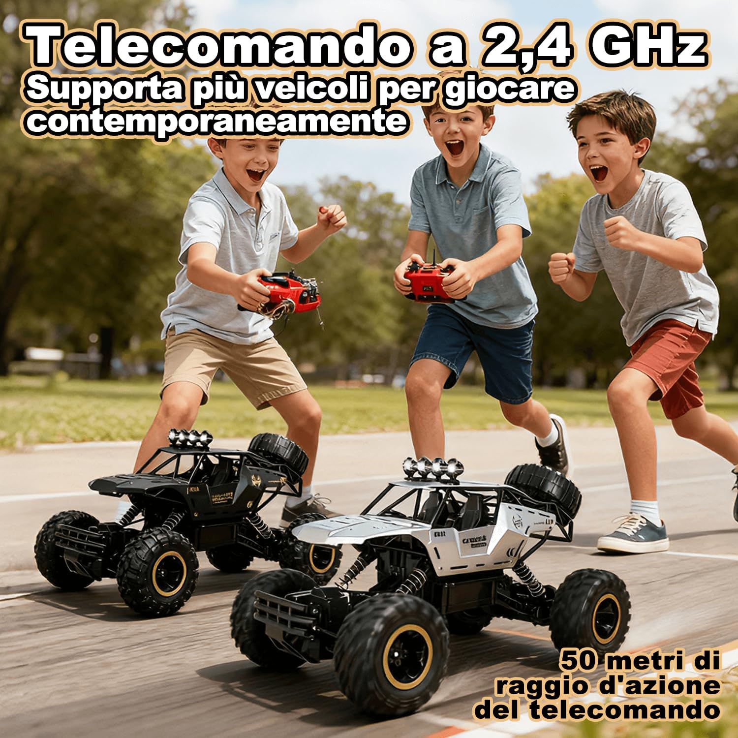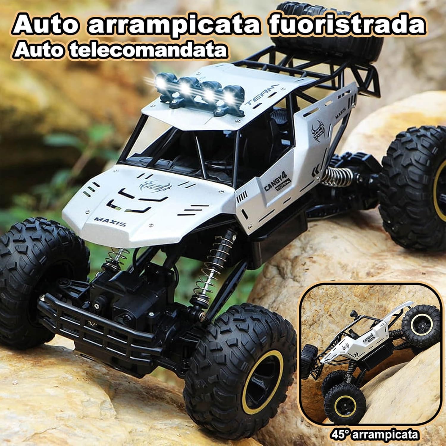 Auto telecomandata da 2,4 G a lunga durata: la tecnologia radio a 2,4 GHz offre un controllo stabile ed è resistente alle interferenze. Macchina telecomandata alimentato da 2 batterie ricaricabili che consentono una durata di oltre 50 minuti, ideale per un lungo divertimento. Grande auto telecomandata con design realistico: il modello 1:12 di un fuoristrada è lungo 36 cm e dispone di caratteristiche dettagliate come fari illuminati, una vera attrazione e perfetto per collezionisti e giocatori. Macchina Telecomandata per Bambini Giochi 6 7 8 9 10 11 12 Anni. Forte capacità fuoristrada per qualsiasi terreno: Auto telecomandata è dotata di un potente motore a quattro ruote motrici che offre una forte potenza, combinata con pneumatici da 9,5 cm con una trazione eccellente. Perfetto per sabbia, erba, ghiaia e molto altro ancora: una vera esperienza fuoristrada. Può offrire ai vostri bambini una ricca esperienza di guida. Giocattoli per macchina telecomandate di materiali resistenti: il telaio in plastica ABS ad alta resistenza e la carrozzeria in metallo sono durevoli e resistenti agli urti. Le sospensioni su tutte e quattro le ruote assorbono gli urti e i materiali durevoli di alta qualità prolungano efficacemente la durata auto telecomandata. Regalo ideale del giocattolo dell'auto: sia per avventure all'aperto che per divertirsi al chiuso, questa potente auto telecomandata offre un divertimento unico, ed è un regalo ideale per compleanni o natale.