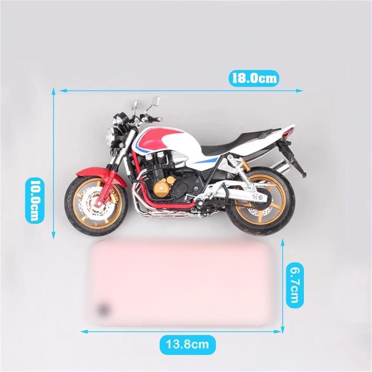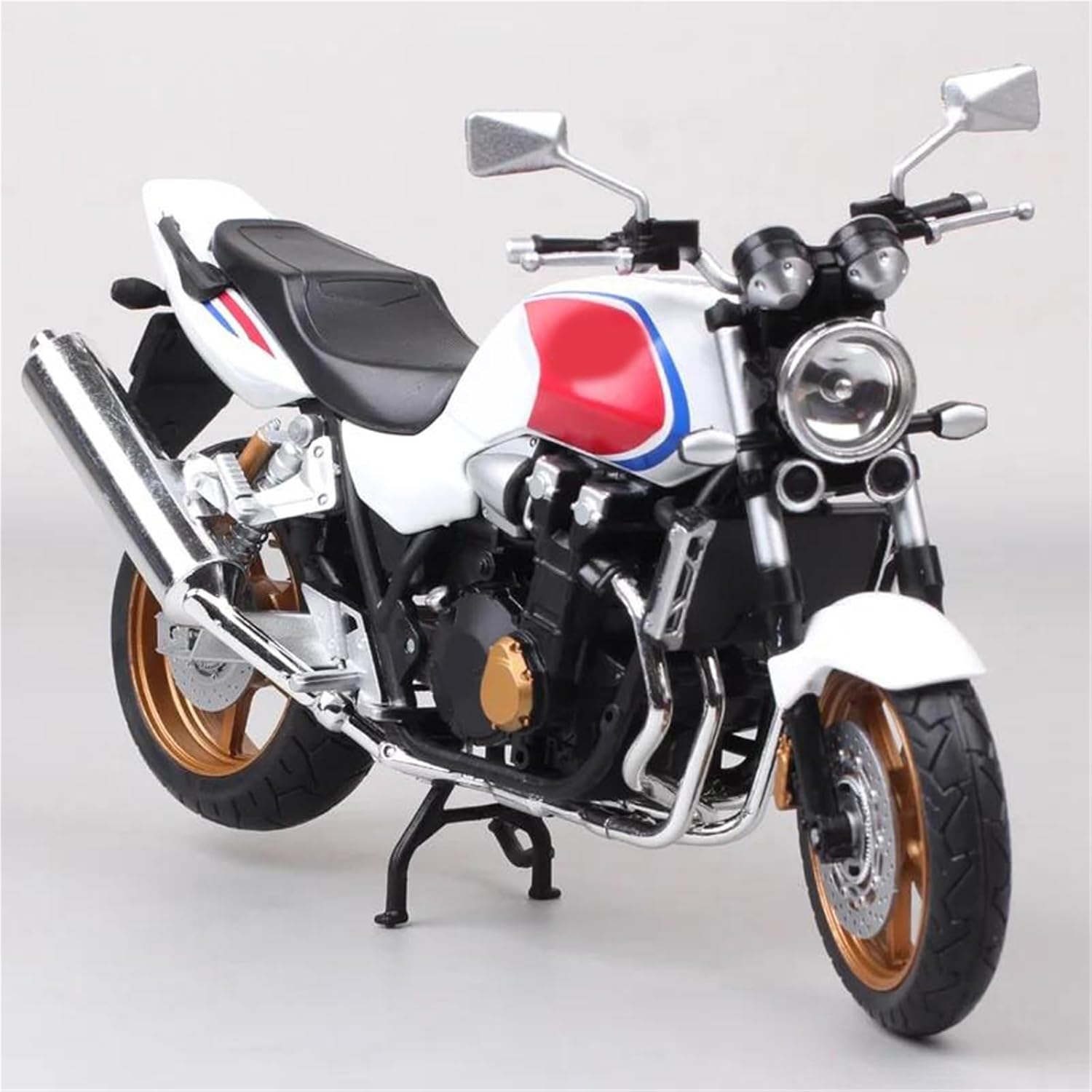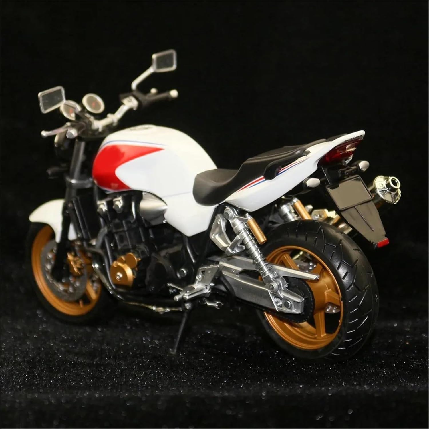 Modello di motocicletta per CB1300SF Modello di auto giocattolo in scala 1:12, parti squisite progettate secondo le proporzioni originali dell'auto, cruscotto, pedali del freno e dell'acceleratore sono progettati per essere realistici e precisi. Il modello di motocicletta è un modello squisito realizzato in stretta conformità con la forma, la struttura, il colore, gli interni e altre proporzioni del veicolo originale. È un modello in miniatura del veicolo originale ed è progettato per riprodurre l'aspetto del veicolo originale. Modello di auto di simulazione La finitura liscia e senza sbavature e la vernice lucida e uniforme dimostrano una maestria artigianale eccezionale. Questo modello incarna lo stile di una motocicletta, soddisfacendo l'amore degli appassionati per i modelli nostalgici.