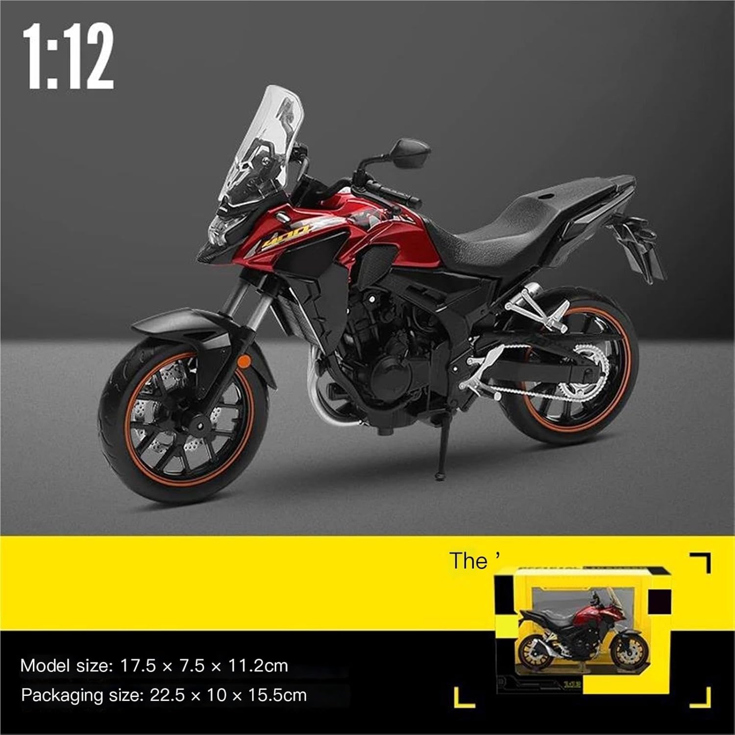 Per CB400X CB 400 X, modello di motocicletta, parti squisite progettate secondo le proporzioni originali dell'auto, cruscotto, pedali del freno e dell'acceleratore sono progettati per essere realistici e precisi. Modello di auto giocattolo per motociclette in scala 1:12, il modello è durevole e duraturo. La costruzione robusta consente di esporlo con orgoglio anno dopo anno senza rompersi. Il modello di motocicletta è un modello squisito realizzato in stretta conformità con la forma, la struttura, il colore, gli interni e altre proporzioni del veicolo originale. È un modello in miniatura del veicolo originale ed è progettato per riprodurre l'aspetto del veicolo originale. Modello di auto di simulazione Realizzato in resistente lega di zinco, è resistente alle cadute e all'usura, garantendo la durevolezza del modello e la sua lunga conservazione. La finitura della vernice è uniformemente liscia, con colori vivaci e duraturi che resistono allo sbiadimento e alle scheggiature, garantendo un aspetto costantemente brillante.