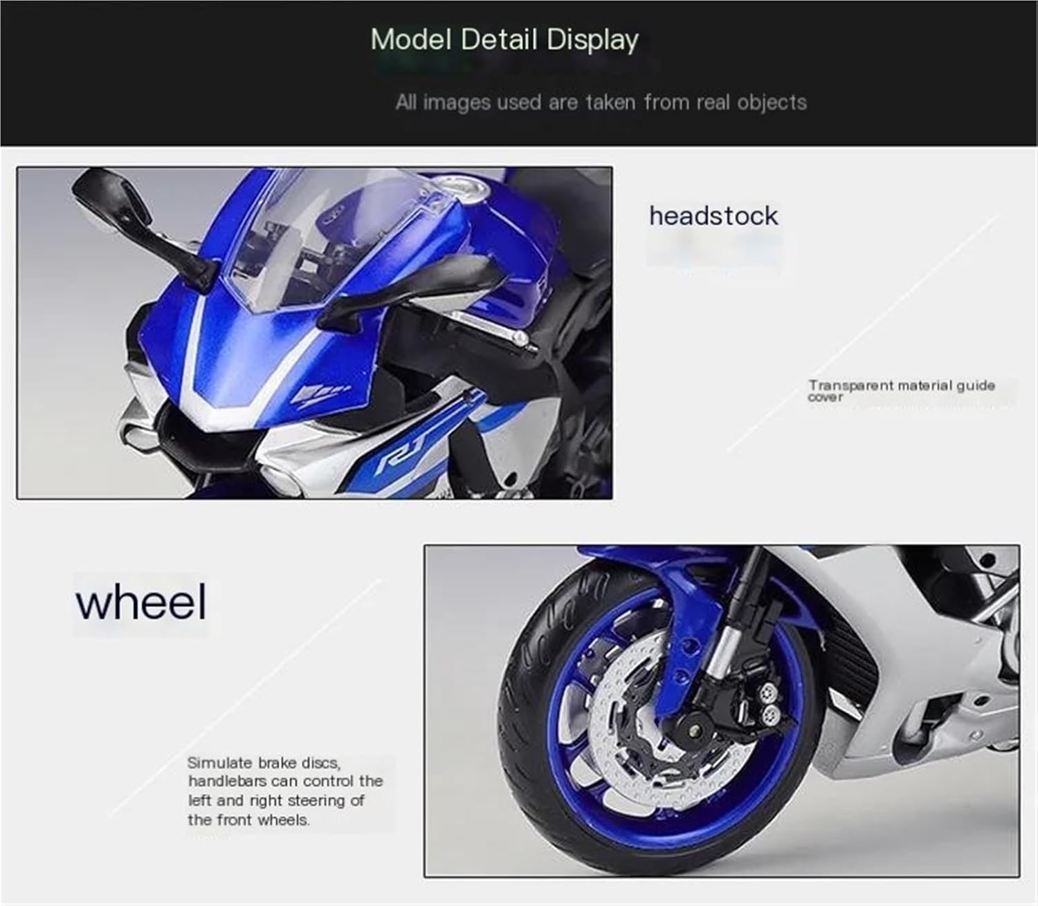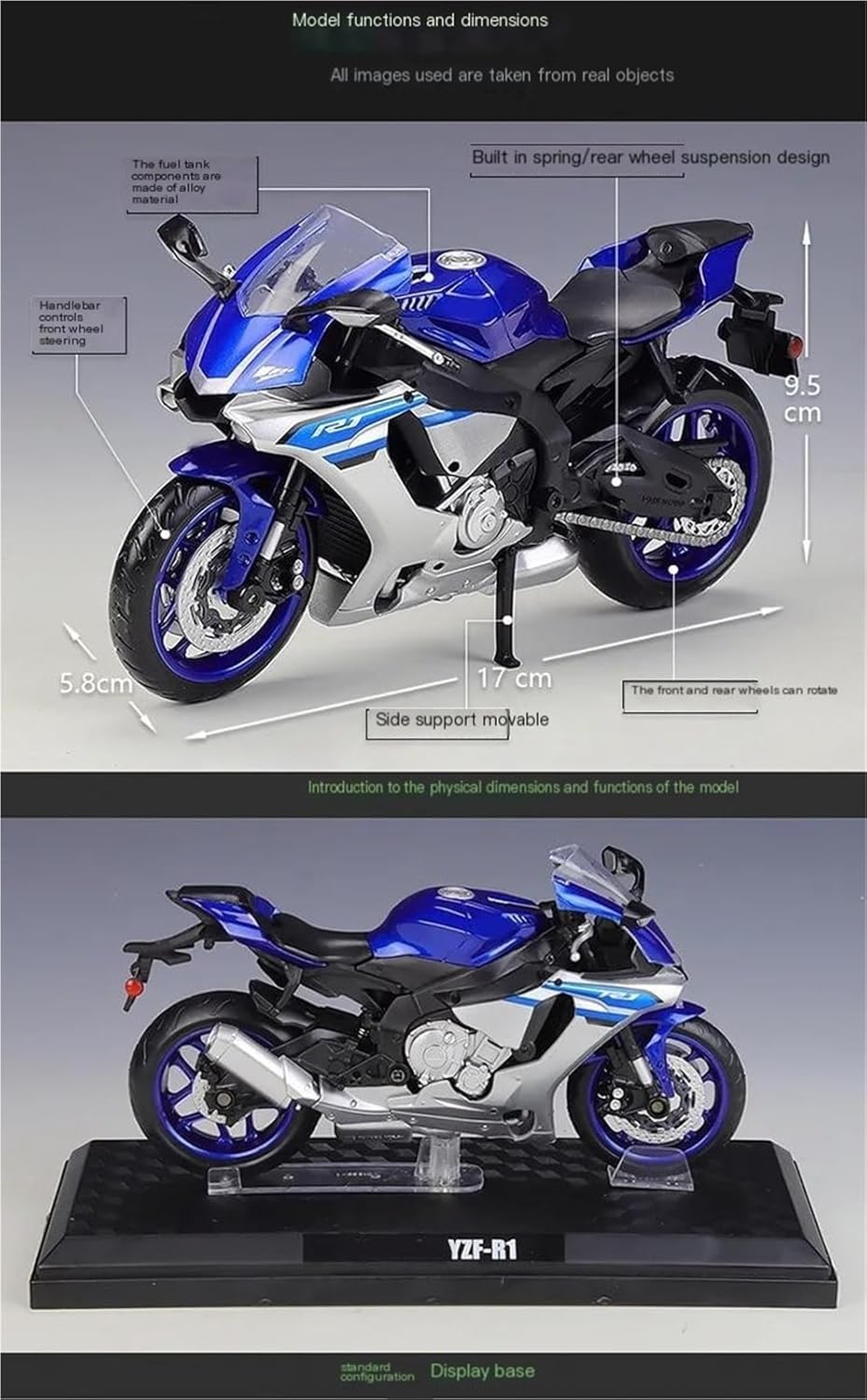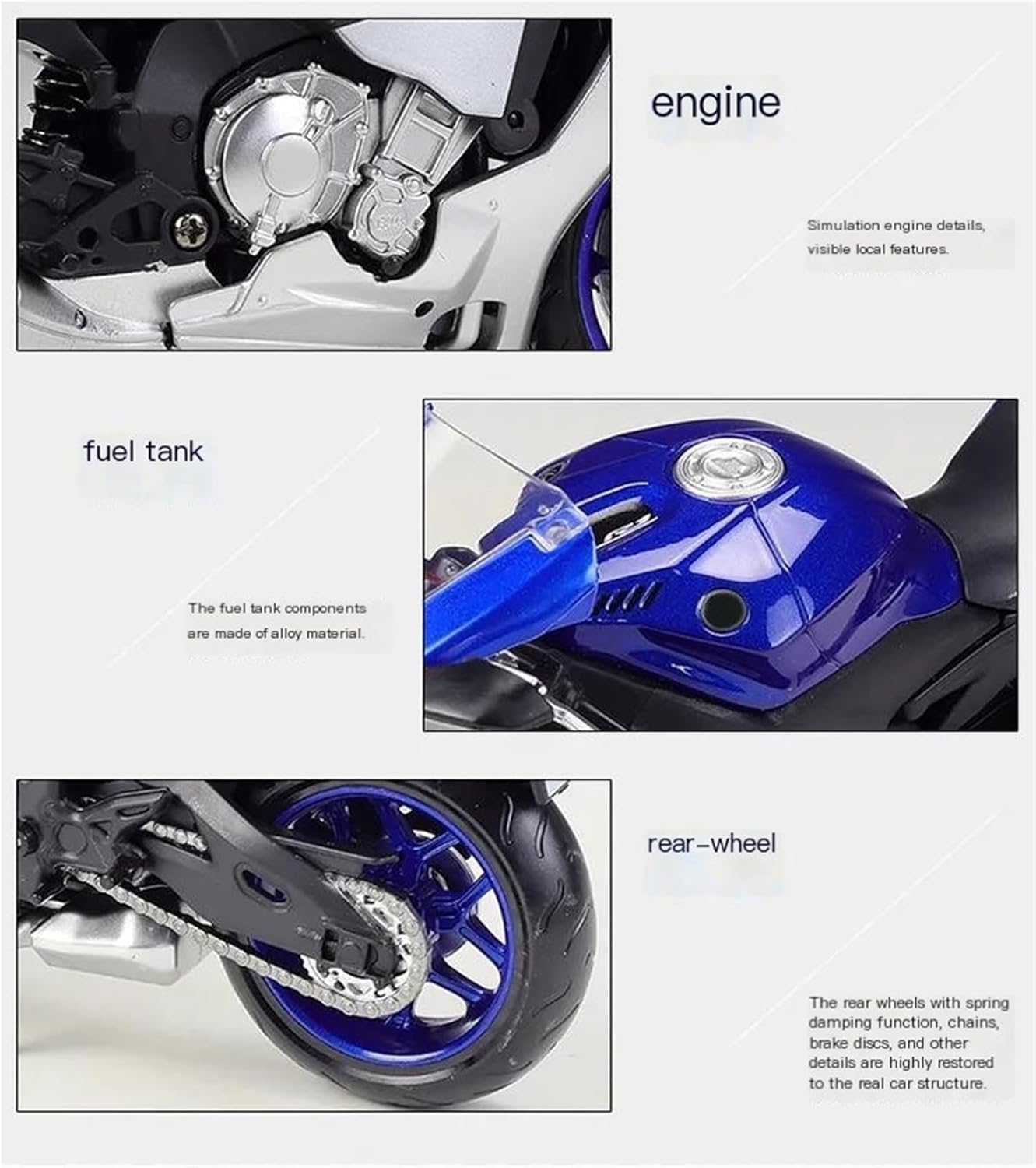 Modello di moto per Yzf-r1 Yzf R1 Modelli di moto giocattolo in scala 1:12, parti squisite progettate secondo le proporzioni originali dell'auto, cruscotto, pedali del freno e dell'acceleratore sono progettati per essere realistici e precisi. la modalità di simulazione della motocicletta è piena di personalità, così bella. Il modello è durevole e duraturo. La costruzione robusta consente di esporlo con orgoglio anno dopo anno senza rompersi. Realizzato in resistente lega di zinco, è resistente alle cadute e all'usura, garantendo la durevolezza del modello e la sua lunga conservazione. La finitura della vernice è uniformemente liscia, con colori vivaci e duraturi che resistono allo sbiadimento e alle scheggiature, garantendo un aspetto costantemente brillante.