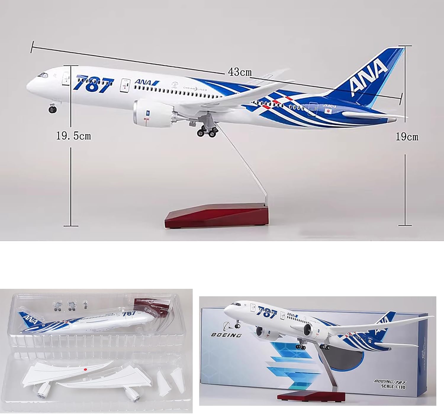 Boeing 787 All Nippon Airways: il modello adotta la tecnologia di ultima generazione, dotato di carrello di atterraggio staccabile, finestrino del pilota e finestrino dell'aereo realizzati secondo l'effetto vetro trasparente del vero aereo e dotato di luci LED a comando vocale for un maggiore effetto visivo, il corpo è dotato di alimentazione e interruttore e il jack di ricarica Android può essere caricato in qualsiasi momento Rapporto di riduzione 1:130: ripristino della scala dell'aereo 1:130, ogni modello è squisito, produzione di stampi 3D NC, in stretta conformità con la scala uguale, la lunghezza è 43 cm, la dimensione complessiva è 45,5 cm × 46,5 cm × 25 cm. Squisita fattura del modello: il carrello di atterraggio è rimovibile, la cabina di pilotaggio e la cabina sono dotate di luci, il motore è scavato e le pale del motore possono essere girate dal vento, è facile installare il modello. Durante il processo di installazione, non esercitare troppa forza. Allo stesso tempo, non spingere il modello a terra, altrimenti si danneggerà il carrello di atterraggio Modello ricaricabile: può essere caricato con il cavo dati Android e la batteria al litio integrata può essere caricata for 1 ora. Luce LED incorporata, accendi immediatamente la luce del corpo dell'interruttore, più esperienza visiva, Un interruttore è impostato sotto il coda dell'aereo for controllare la luce for un facile utilizzo. Nota: questo modello non è un giocattolo! Il carrello di atterraggio è realizzato in scala ridotta della macchina reale ed è facile da rompere se viene applicata troppa forza durante il processo di installazione. Allo stesso tempo, non spingere il modello a terra, ciò causerebbe gravi danni al carrello di atterraggio.