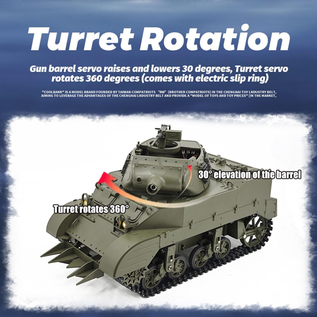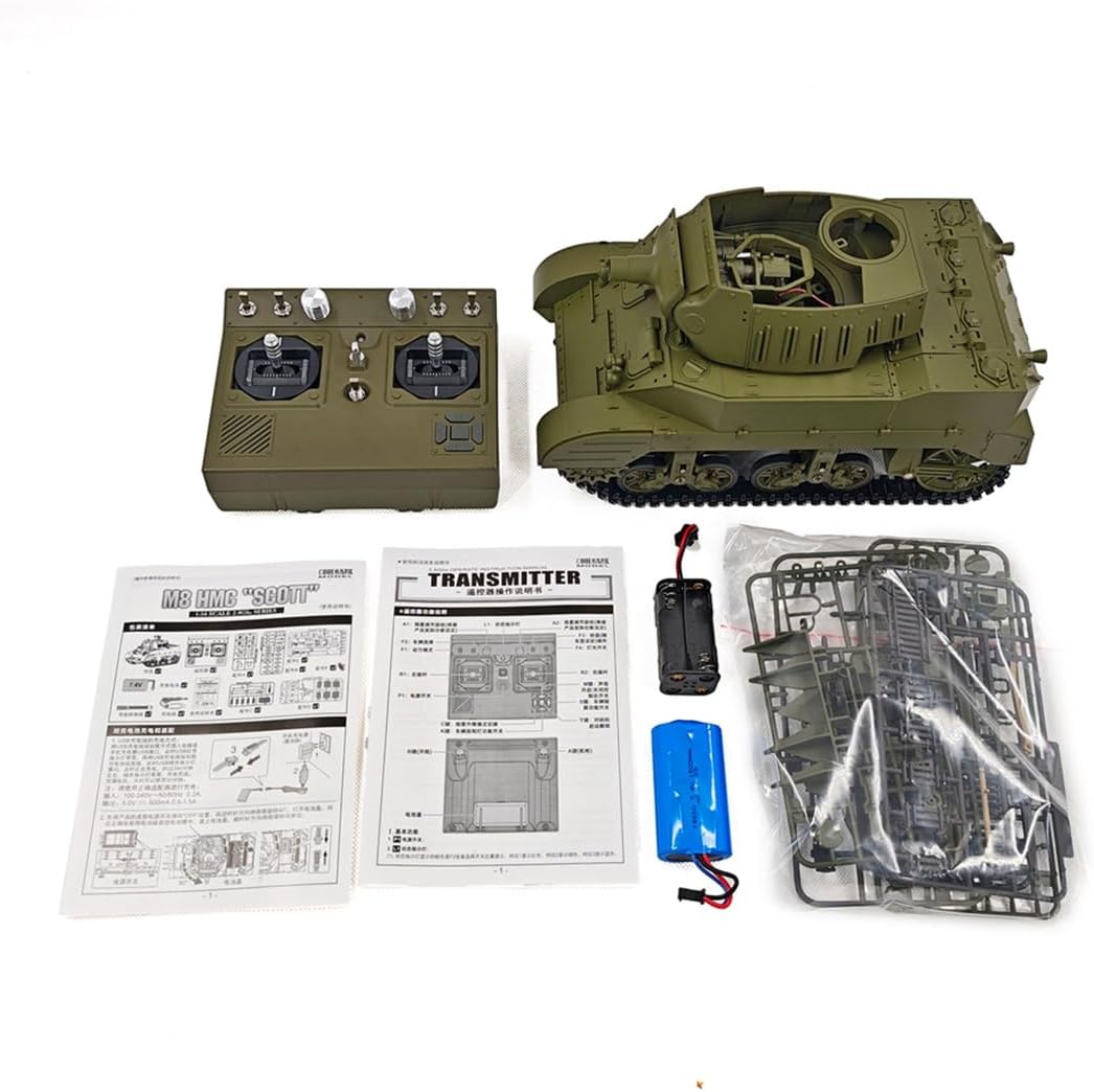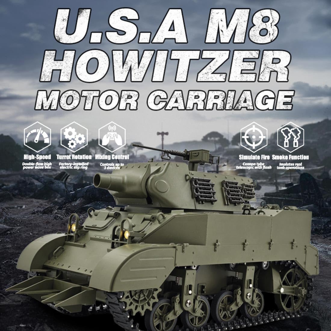 Funzioni avanzate di controllo remoto 2.4G: dotato di un telecomando di frequenza a 2,4 GHz, il serbatoio può muoversi in avanti, indietro, accelerare, girare sul posto ed estendere o rinculare la canna con shock simulato. Dispone inoltre di un'elevazione della canna di 30° e di una rotazione della torretta di 350°. Suoni, luci e effetti di fumo realistici danno vita al funzionamento del telecomando su vasta scala. Più unità possono funzionare contemporaneamente con canali commutabili. Costruzione robusta e giocabile: costruito con parti in plastica e metallo di alta qualità, questo serbatoio combina durata con alto valore di gioco. La torretta ruota e si eleva come un vero carro armato e si possono aprire vari portelli, migliorando l'interattività e il realismo. Telecomando ricco di funzioni: il telecomando include indicatori di funzione, avvisi di batteria scarica, corrispondenza manuale della frequenza e impostazioni di memoria per un massimo di 3 serbatoi. Con un design a 15 canali e opzioni di controllo espandibili, dispone anche di un joystick con indicatori di stato LED a colori. Precisione storica e design realistico: il carro armato obice semovente M8 è stato ampiamente utilizzato dagli Stati Uniti durante la seconda guerra mondiale ed è un derivato del carro armato leggero M5Stuart. Questo modello presenta un design dinamico della canna scavato visivamente, con simulazione di fuoco potenziata da effetti sonori, luce e fumo, ricreando perfettamente la sua presenza sul campo di battaglia.