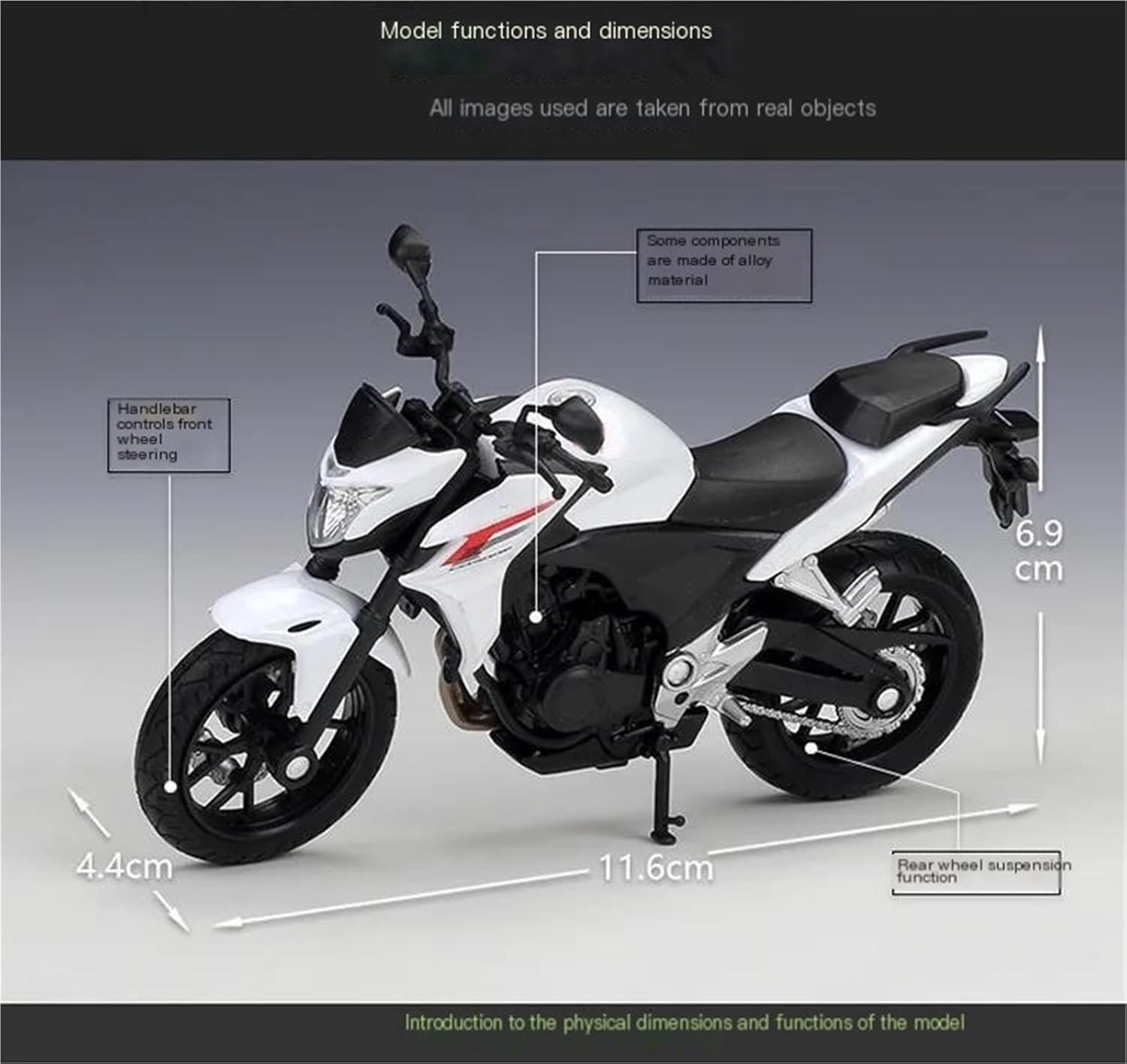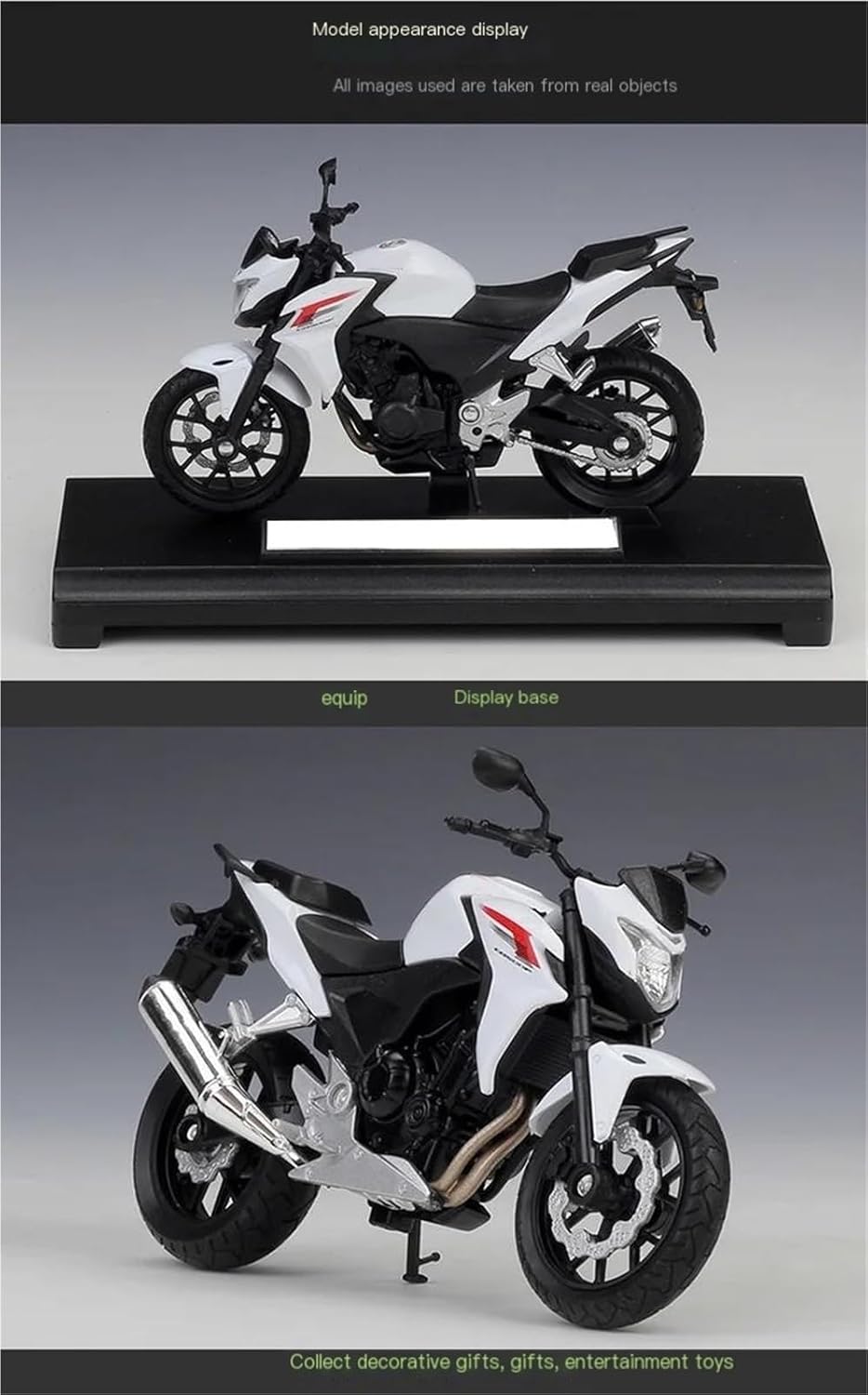 Modello di moto per Cb500f 2014 Cb 500 f Il modello di moto è un modello squisito realizzato in stretta conformità con la forma, la struttura, il colore, gli interni e altre proporzioni del veicolo originale. È un modello in miniatura del veicolo originale ed è progettato per riprodurre l'aspetto del veicolo originale. Modello di moto di simulazione Modelli di auto giocattolo moto 1:18, ottimi per regali, collezioni, souvenir, arredi, decorazioni per la casa, l'ufficio e la sala studio. La finitura liscia e senza sbavature e la vernice lucida e uniforme dimostrano una maestria artigianale eccezionale. Questo modello incarna lo stile di una motocicletta, soddisfacendo l'amore degli appassionati per i modelli nostalgici.