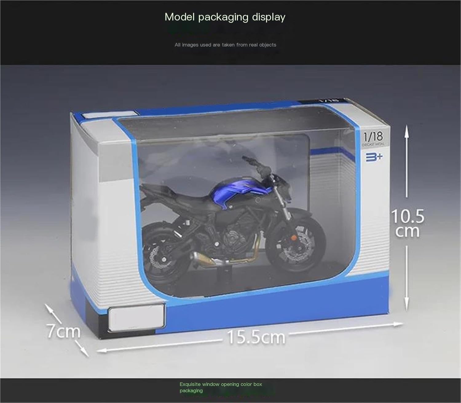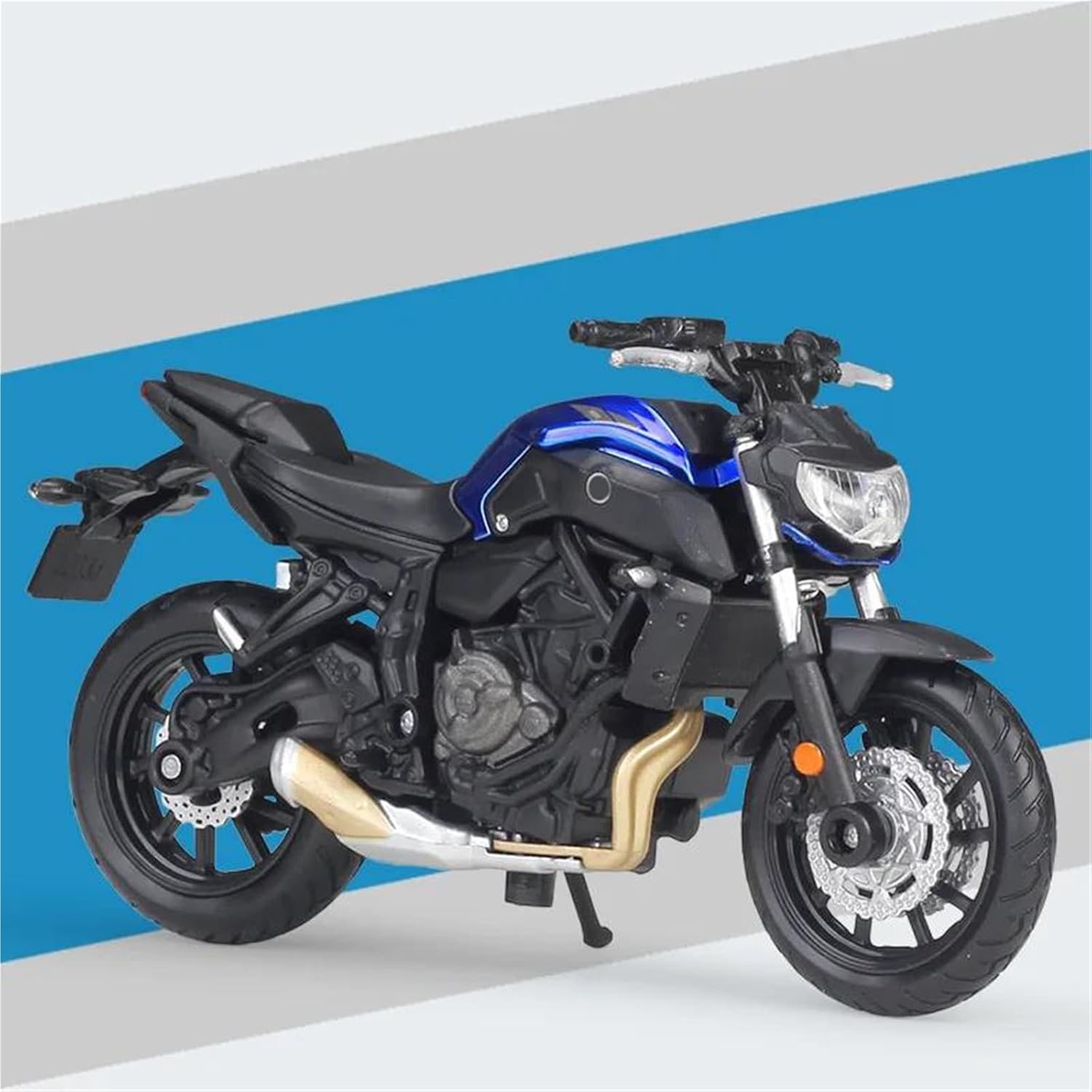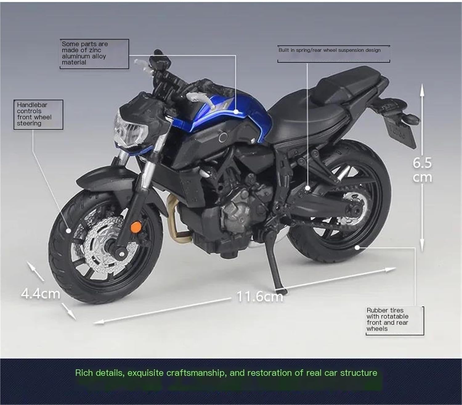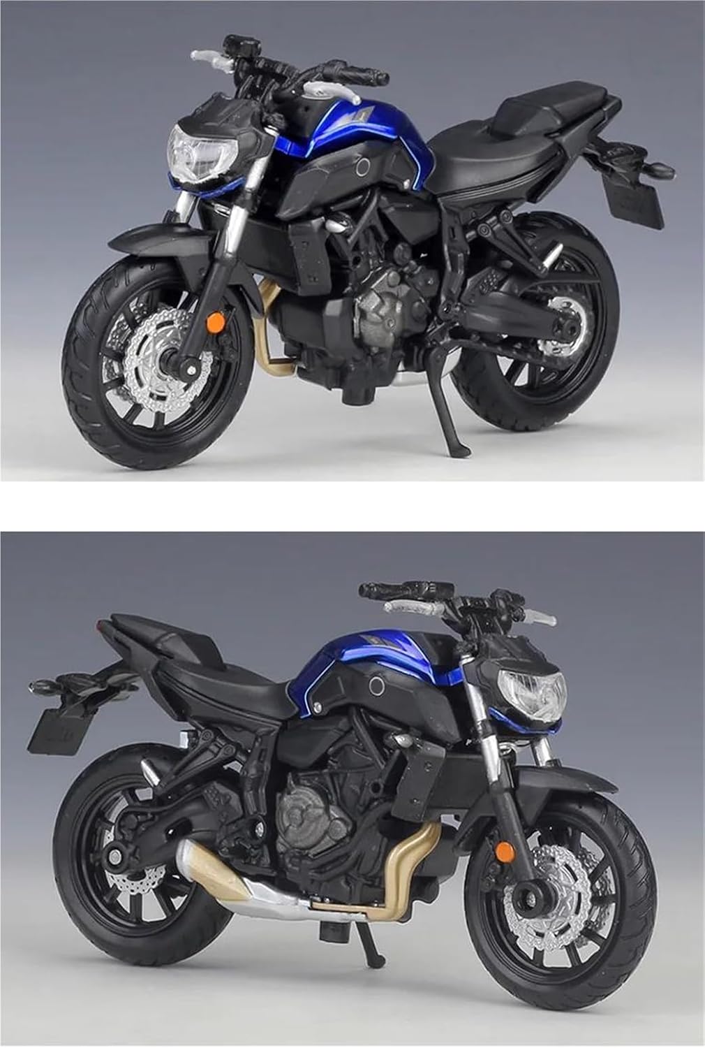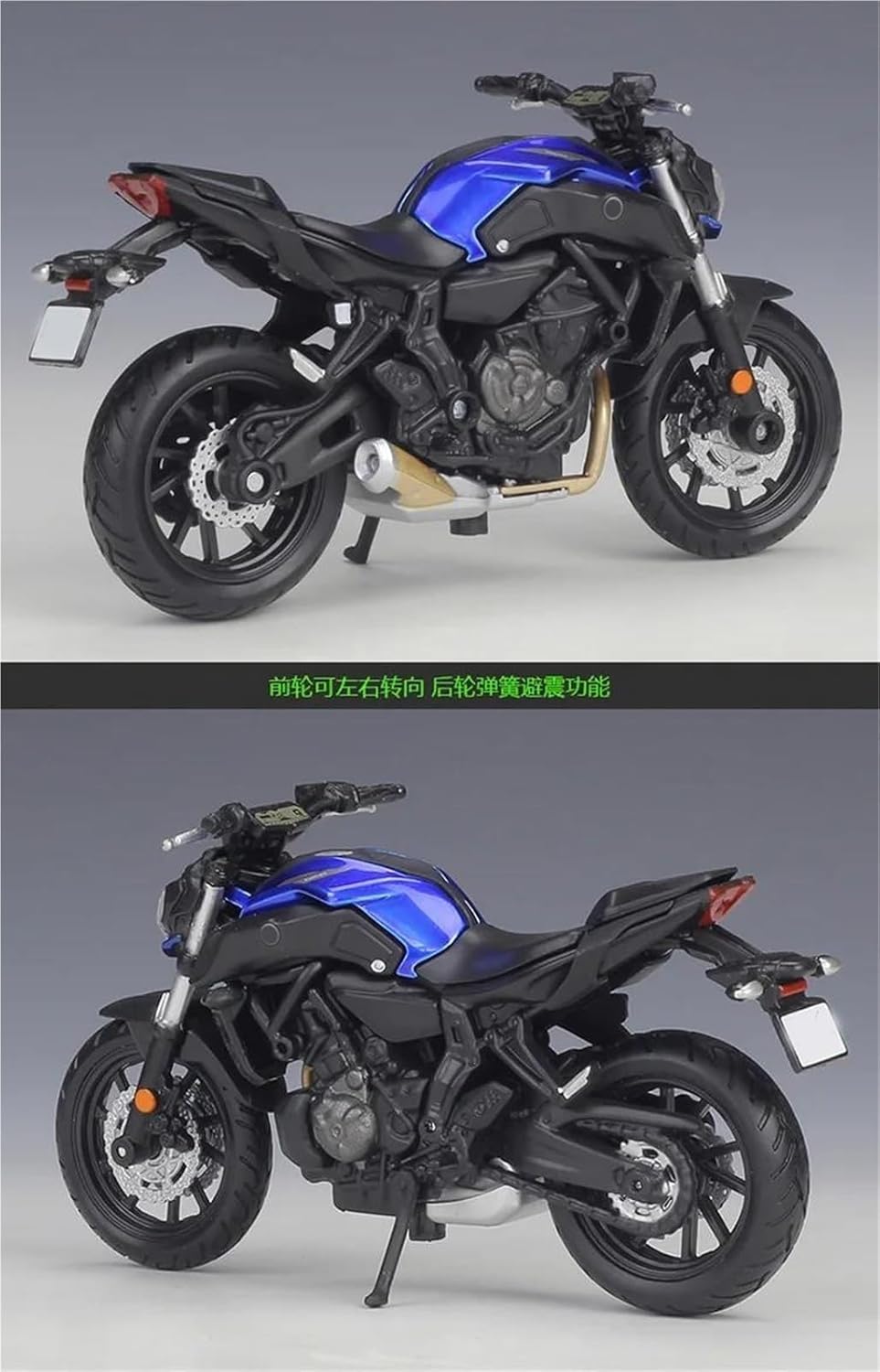 Modello di motocicletta 2018 per MT07 MT-07 Modelli di motociclette giocattolo in scala 1:18, ruota anteriore e manubrio possono oscillare da un lato all'altro, cavalletto mobile, sospensione posteriore a molla, ruote libere Il modello di motocicletta è un modello squisito realizzato in stretta conformità con la forma, la struttura, il colore, gli interni e altre proporzioni del veicolo originale. È un modello in miniatura del veicolo originale ed è progettato per riprodurre l'aspetto del veicolo originale. Realizzato in resistente lega di zinco, è resistente alle cadute e all'usura, garantendo la durevolezza del modello e la sua lunga conservazione. La finitura della vernice è uniformemente liscia, con colori vivaci e duraturi che resistono allo sbiadimento e alle scheggiature, garantendo un aspetto costantemente brillante.