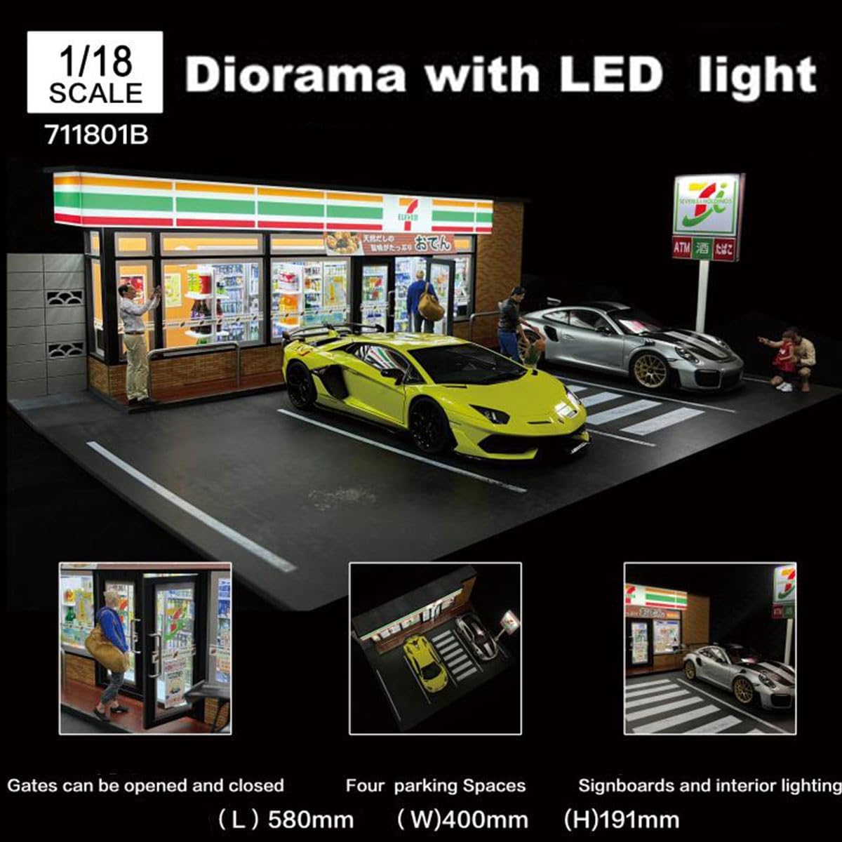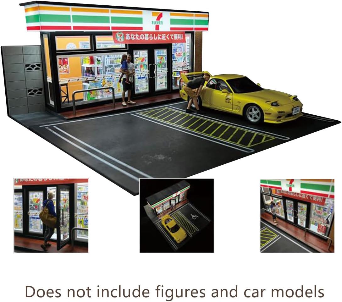 Autentica riproduzione giapponese di minimarket: una riproduzione perfetta di un classico negozio 7-Eleven dal Giappone, tra cui segnaletica, vetrine, aree distributori automatici e persino piccoli elementi interni. Perfetto per i collezionisti che vogliono catturare il fascino unico dello stile di vita urbano giapponese in forma miniatura. Negozio interattivo con slot per parcheggio: dispone di due parcheggi in scala 1:18 modelli di auto pressofuse, ideali per mostrare i veicoli in scenari realistici "drive and shop". Le porte anteriori possono aprirsi/chiudersi per simulare l'ingresso effettivo, aggiungendo realismo e giocabilità al tuo setup. Luci a LED alimentate tramite USB per scene notturne: viene fornito con illuminazione integrata alimentata tramite USB per il cartello della vetrina e l'interno del negozio. Sia che tu stia costruendo un diorama notturno o desideri un centrotavola luminoso, l'illuminazione ambientale aggiunge un tocco cinematografico e realismo al tuo mondo modello. Perfetto per narrazione e scene di visualizzazione: che tu stia ricreando una corsa di shopping a tarda notte, un incontro in auto o un tranquillo momento urbano, questo set è una piattaforma versatile per creare storie in miniatura. Abbinalo a auto e figurine giapponesi (non incluse) per sbloccare un potenziale illimitato di costruzione di scene. Personalizzabile e adatto ai collezionisti: questo modello non include veicoli o figure, dandoti la libertà di personalizzare ogni dettaglio. Usalo come tela bianca per il tuo diorama giapponese, collezione di modellini di auto o progetti fotografici creativi. Un must per i fan di JDM, costruttori di modelli in scala e hobbisti!