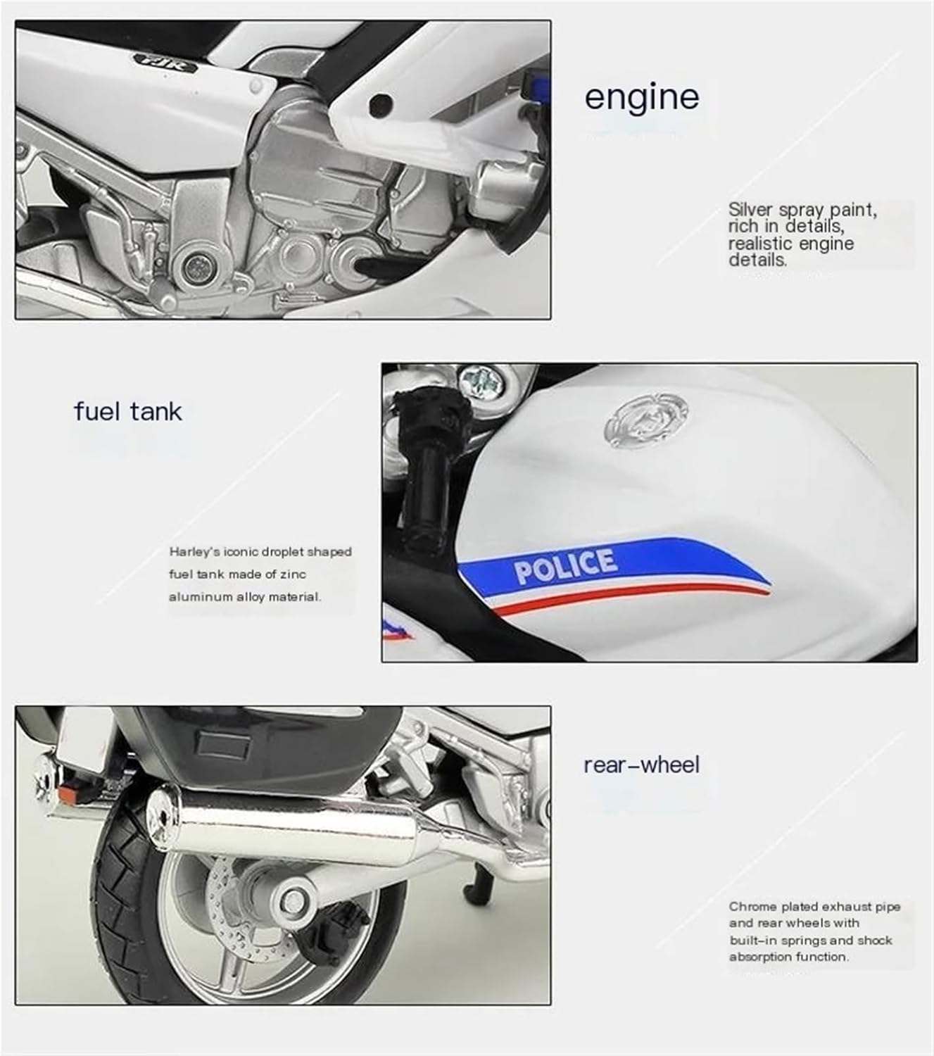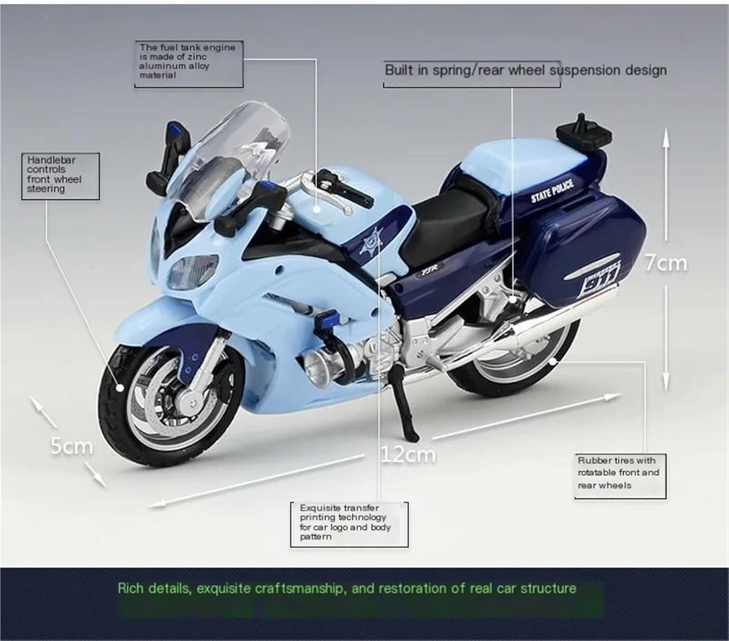 Modello di moto per FJR 1300A FJR1300A Il modello di moto è un modello squisito realizzato in stretta conformità con la forma, la struttura, il colore, gli interni e altre proporzioni del veicolo originale. È un modello in miniatura del veicolo originale ed è progettato per riprodurre l'aspetto del veicolo originale. Modello di moto di simulazione 1:18 Modellini di auto giocattolo per moto, le ruote anteriori e il manubrio possono oscillare da un lato all'altro. Portapacchi per attività, Sospensione posteriore a molla, Ruota libera Realizzato in resistente lega di zinco, è resistente alle cadute e all'usura, garantendo la durevolezza del modello e la sua lunga conservazione. La finitura della vernice è uniformemente liscia, con colori vivaci e duraturi che resistono allo sbiadimento e alle scheggiature, garantendo un aspetto costantemente brillante.