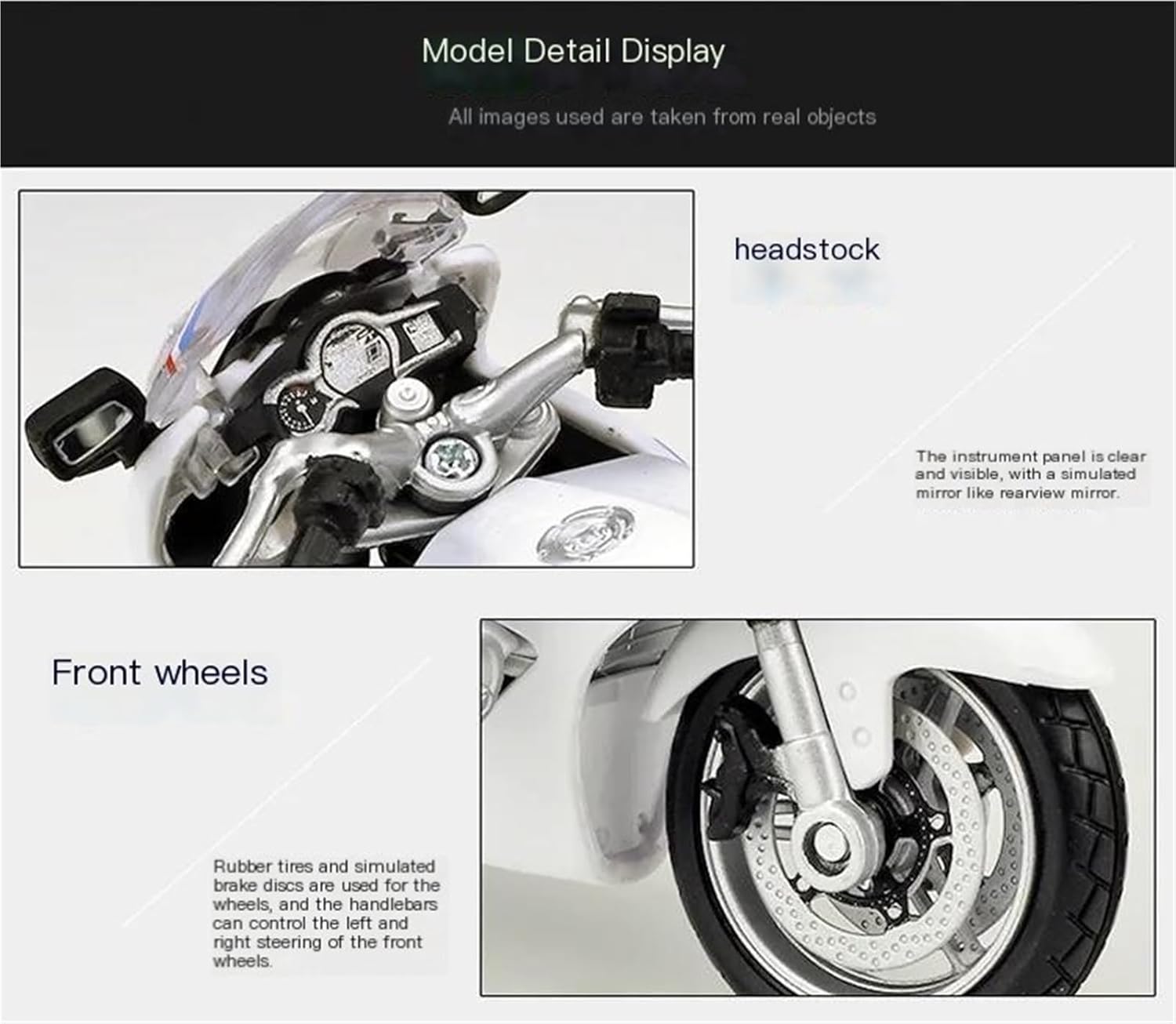 Modello di moto per FJR 1300A FJR1300A Il modello di moto è un modello squisito realizzato in stretta conformità con la forma, la struttura, il colore, gli interni e altre proporzioni del veicolo originale. È un modello in miniatura del veicolo originale ed è progettato per riprodurre l'aspetto del veicolo originale. Modello di moto di simulazione 1:18 Modellini di auto giocattolo per moto, le ruote anteriori e il manubrio possono oscillare da un lato all'altro. Portapacchi per attività, Sospensione posteriore a molla, Ruota libera La finitura liscia e senza sbavature e la vernice lucida e uniforme dimostrano una maestria artigianale eccezionale. Questo modello incarna lo stile di una motocicletta, soddisfacendo l'amore degli appassionati per i modelli nostalgici.