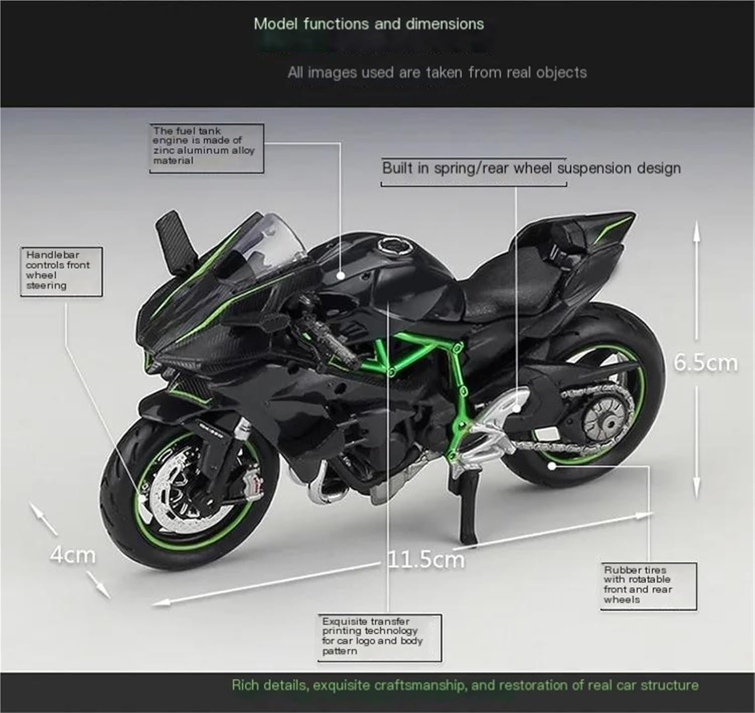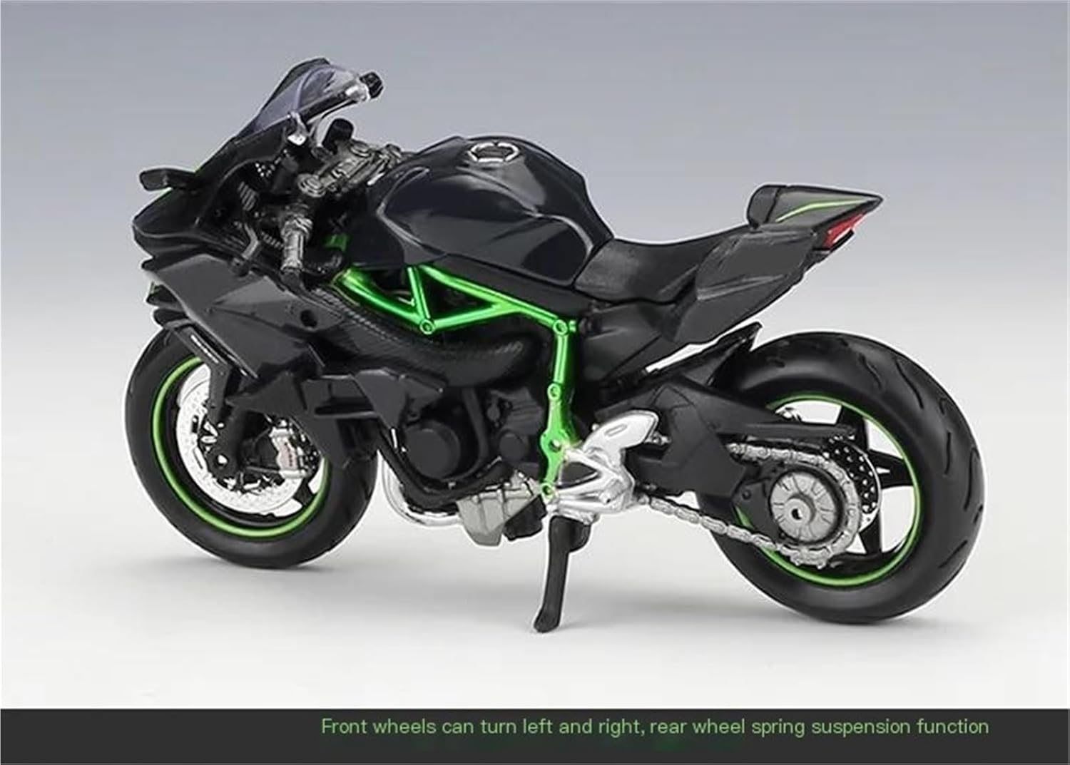 Modello di moto per H2 R H2R per Ninja Modelli di moto giocattolo in scala 1:18, le ruote anteriori e il manubrio possono oscillare da un lato all'altro. Porta-attività, sospensione posteriore a molla. Ruota libera Il modello di moto è un modello squisito realizzato in stretta conformità con la forma, la struttura, il colore, gli interni e altre proporzioni del veicolo originale. È un modello in miniatura del veicolo originale ed è progettato per riprodurre l'aspetto del veicolo originale. La finitura liscia e senza sbavature e la vernice lucida e uniforme dimostrano una maestria artigianale eccezionale. Questo modello incarna lo stile di una motocicletta, soddisfacendo l'amore degli appassionati per i modelli nostalgici.