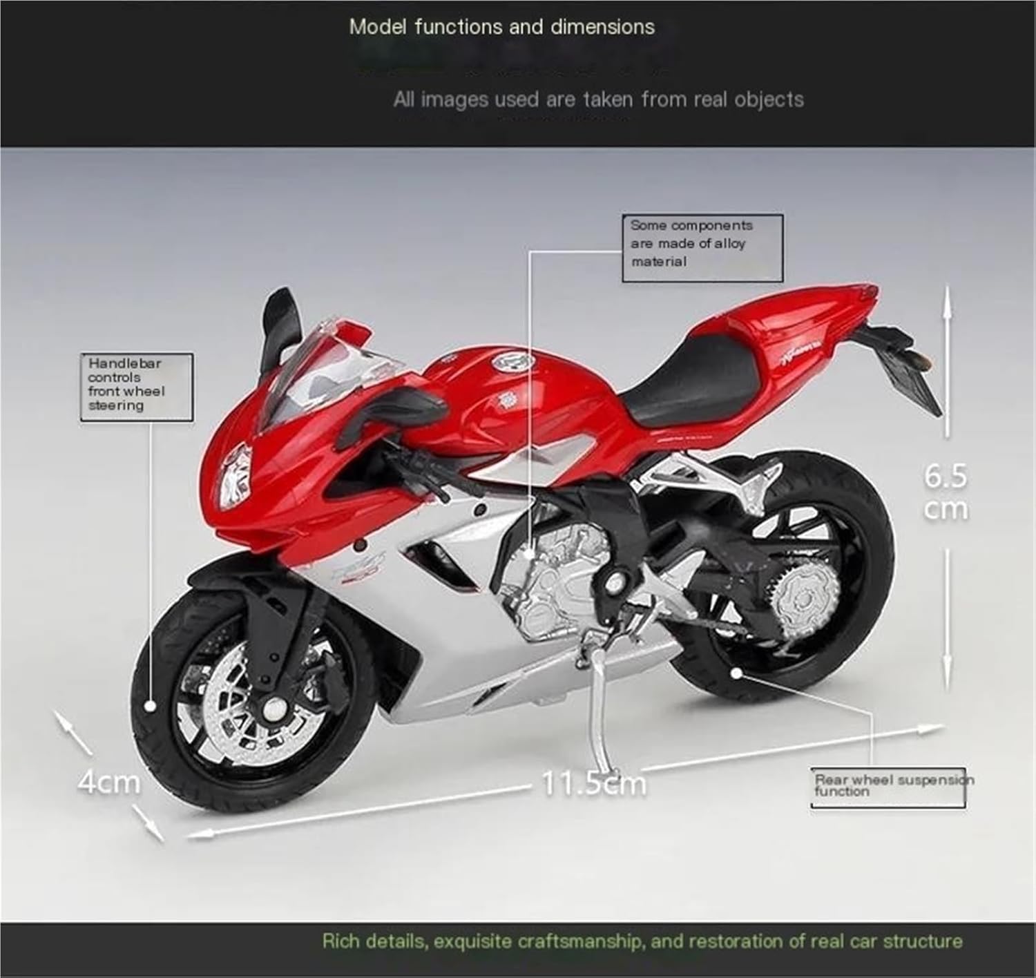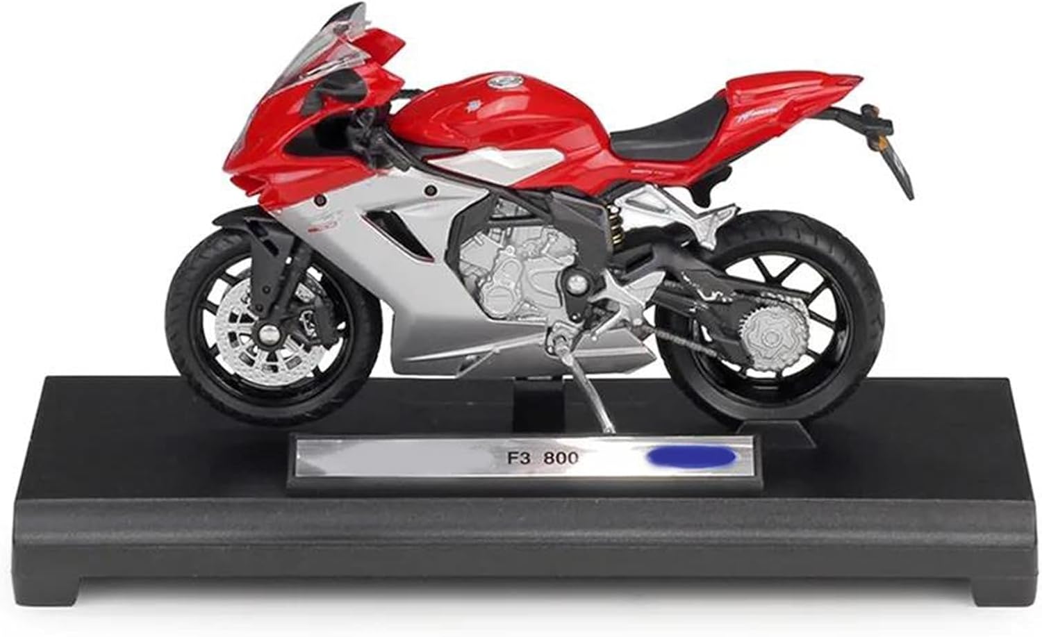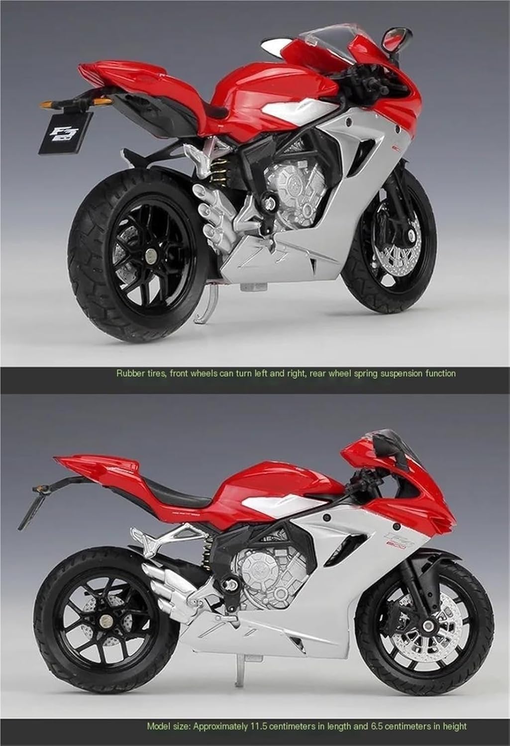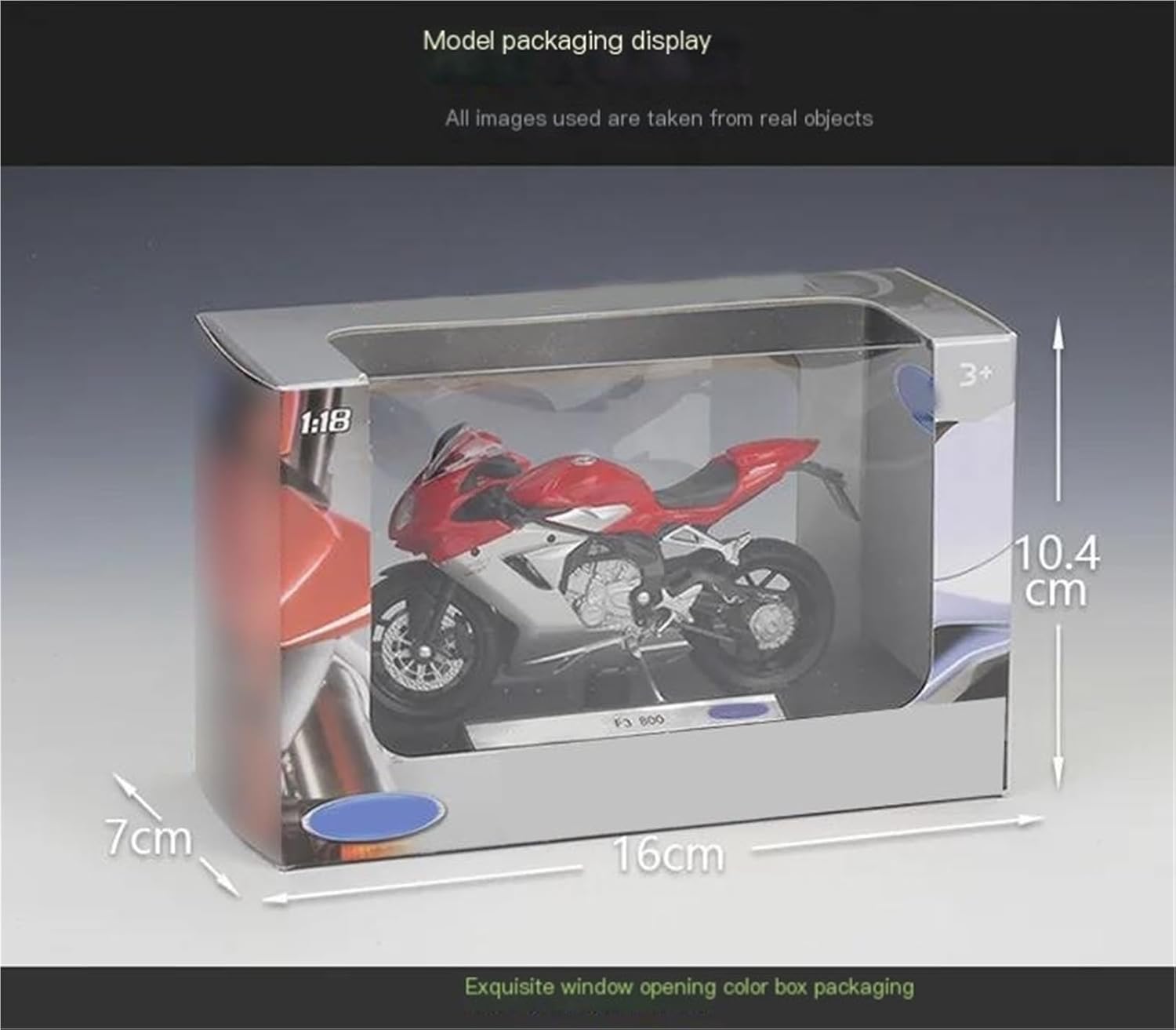 Modello di motocicletta per MV per AGUSTA F3 800 Il modello di motocicletta è un modello squisito realizzato in stretta conformità con la forma, la struttura, il colore, gli interni e altre proporzioni del veicolo originale. È un modello in miniatura del veicolo originale ed è progettato per riprodurre l'aspetto del veicolo originale. Modello di motocicletta di simulazione 1:18 Modello di auto giocattolo per motociclette, le ruote anteriori e il manubrio possono oscillare da un lato all'altro. Portapacchi per attività, Sospensione posteriore a molla, Ruota libera La finitura liscia e senza sbavature e la vernice lucida e uniforme dimostrano una maestria artigianale eccezionale. Questo modello incarna lo stile di una motocicletta, soddisfacendo l'amore degli appassionati per i modelli nostalgici.