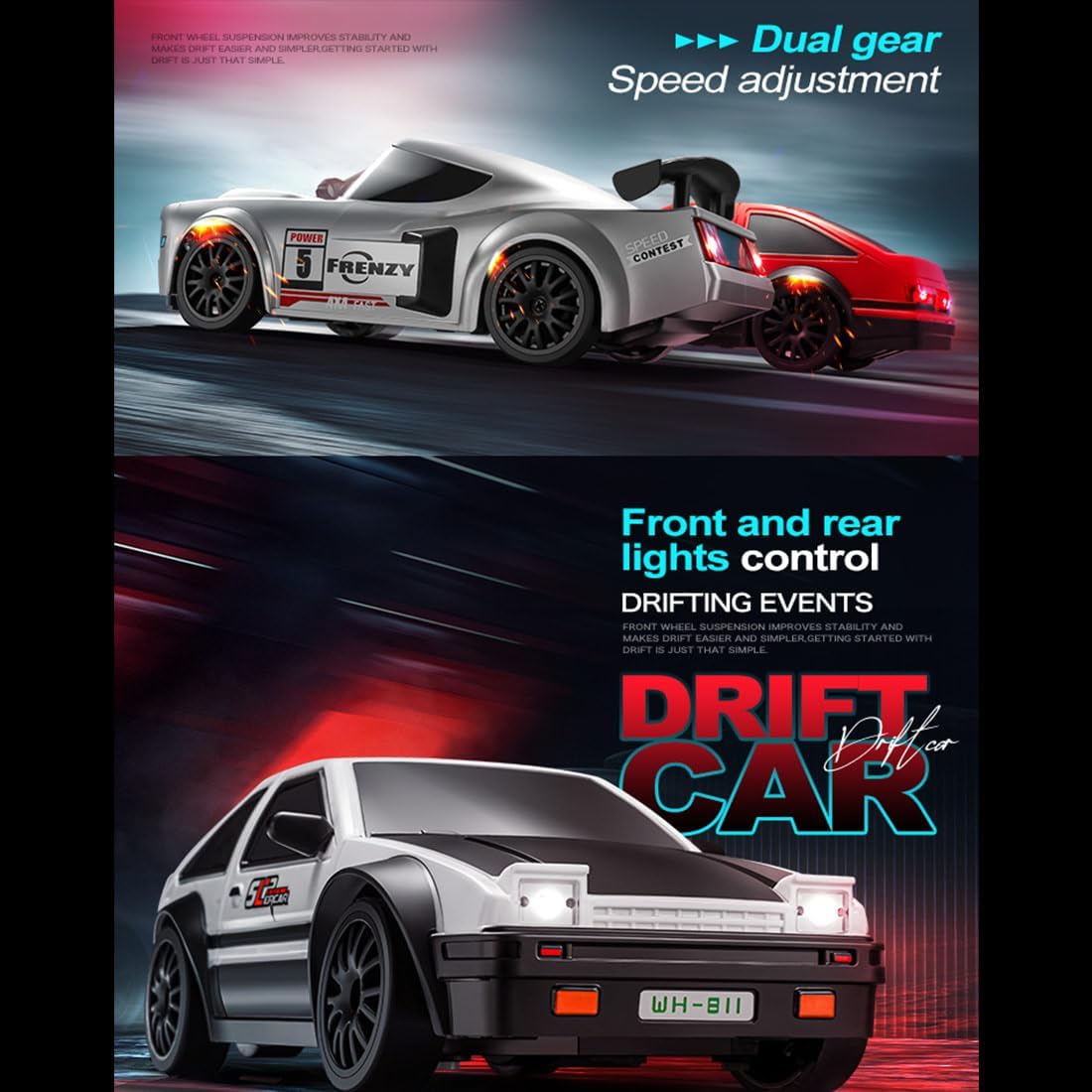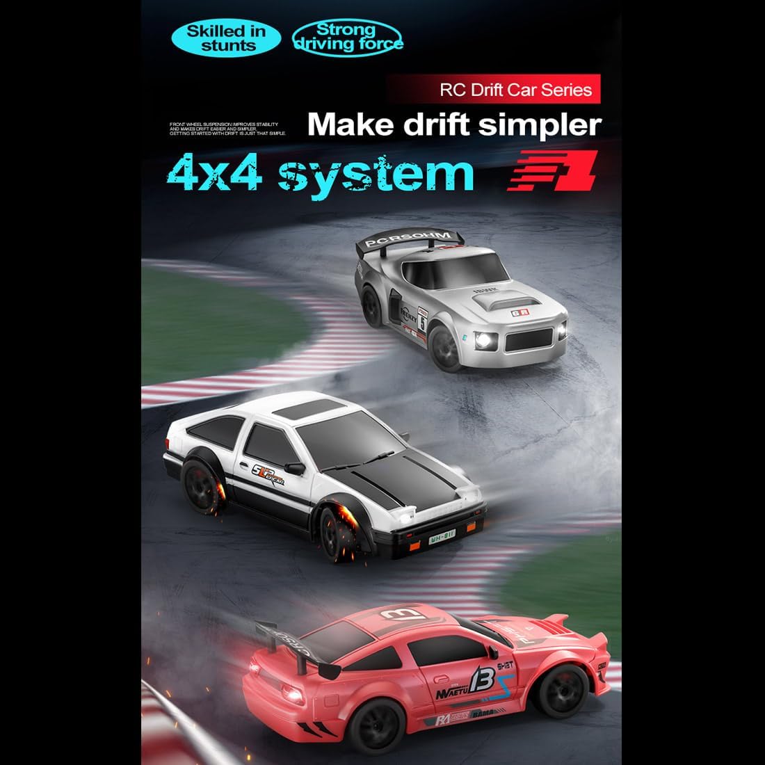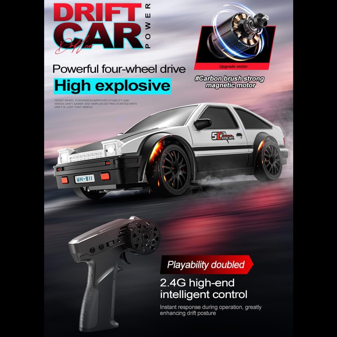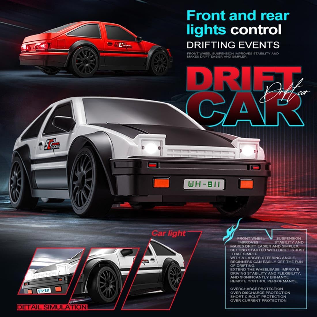 Potente motore a spazzola magnetica: dotata di un motore a spazzola di carbone, questa auto da deriva RC raggiunge velocità fino a 15 km/h e offre un'accelerazione delicata e un'azione uniforme alla deriva. Trazione integrale permanente con cuscinetti pieni: la trazione integrale in combinazione con cuscinetti a sfera in tutto il veicolo migliora il controllo, la stabilità e le prestazioni di deriva su diverse superfici interne ed esterne. Controllo completamente proporzionale da 2,4 GHz: goditi un controllo reattivo e senza interferenze con frequenza a 2,4 GHz e pieno gas e sterzo, ideale per gare di deriva. Luci a LED controllabili: le luci a LED anteriori e posteriori sono controllabili indipendentemente dal trasmettitore e garantiscono un maggiore realismo e un'esperienza di deriva ancora più intensa. La batteria Li-Po da 500 mAh offre fino a 20 minuti di divertimento. Modello autentico come idea regalo: scala compatta 1:24 con dettagli realistici (19 x 9 x 6,5 cm). Questa auto da deriva è il regalo perfetto per collezionisti, appassionati di RC e appassionati di sport motoristici.