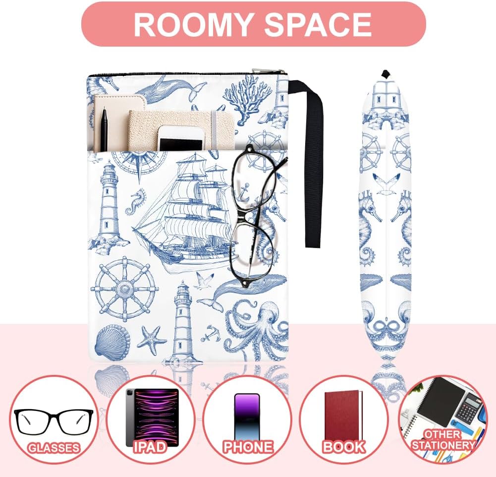 Design di barche a vela e vita marina: le copertine dei libri sono splendidamente progettate e stampate con bussole, barche a vela e varie creature marine portano la meraviglia dell'oceano nella tua esperienza di lettura. Il design unico conferisce alla copertina del libro un tocco di moda. Dimensioni: la confezione include 1 copertina per libri tascabili, la dimensione è lunga 34 cm e larga 24 cm, spaziosa per libri con copertina rigida, tascabili, libri morbidi, blocchi, romanzi e la maggior parte dei libri in formato standard. Materiale in poliestere: la copertina del libro è realizzata in poliestere con imbottitura leggera e impermeabile, che è durevole e può proteggere i tuoi libri o altri oggetti da polvere e acqua. Con cerniera e tasca esterna: la borsa per libri si chiude con una cerniera liscia, impedendo al libro di scivolare accidentalmente fuori dalla copertina e migliorando al tempo stesso la tenuta e la sicurezza. Ha una tasca aggiuntiva e le dimensioni sono 25 cm di lunghezza e 14 cm di larghezza, puoi mettere qui piccoli oggetti per mantenere le cose in ordine. Ampia applicazione: la protezione del libro ha una corda portatile, che è comoda da trasportare, quindi gli accessori del libro non servono solo come protezione del libro, ma anche come borsa per il trasporto, ma come borsa da viaggio, borsa per cosmetici, regali a tema del club del libro, organizzazione di forniture per ufficio, grande borsa con cerniera e così via.
