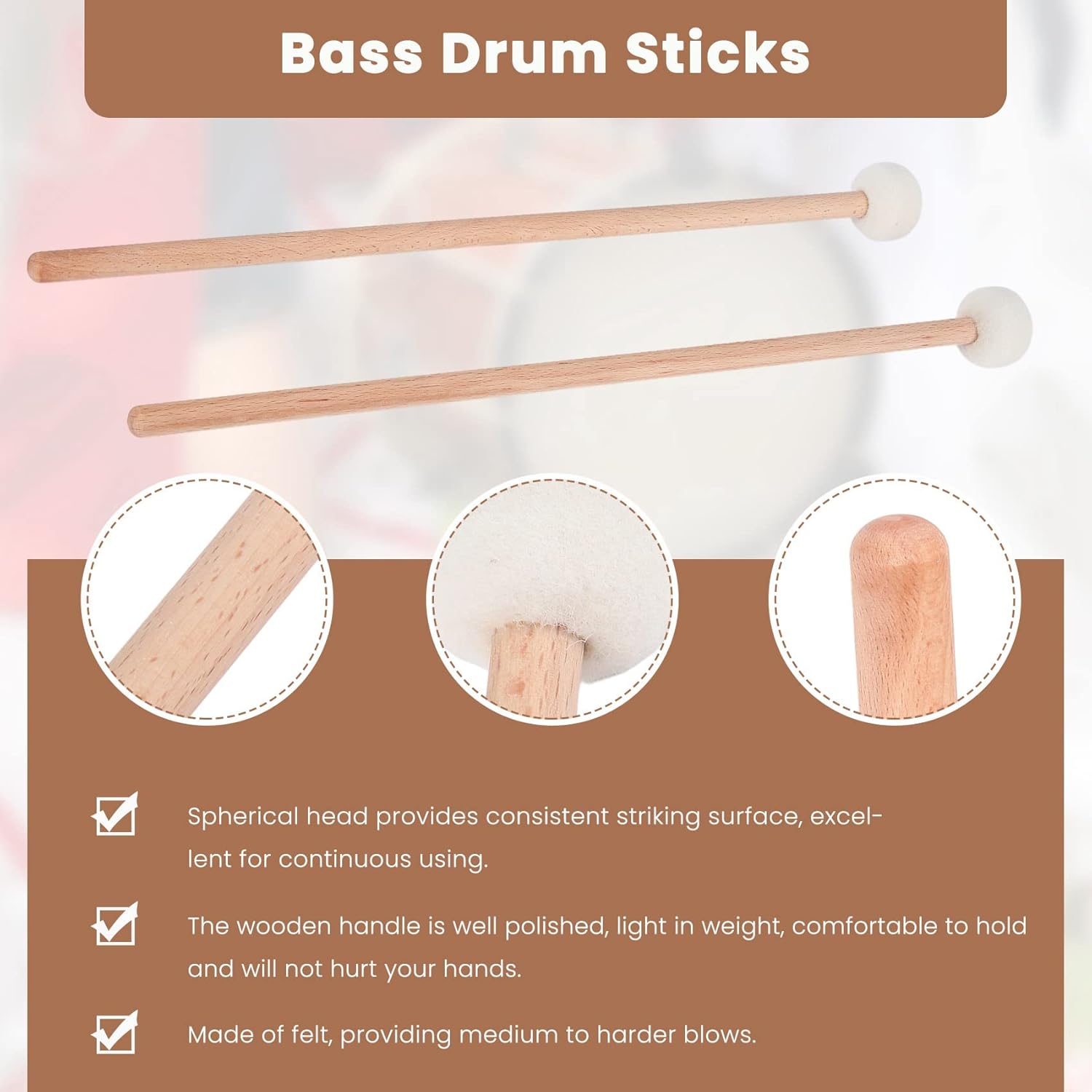 La testa sferica fornisce una superficie battente uniforme, eccellente per l'uso continuo. Il manico in legno naturale è ben lucidato, leggero e da impugnare, non male alla mano. La punta del è realizzata in feltro naturale, morbido e resistente, fornisce percussioni da medie a più dure. La squisita fattura rende questo paio di in feltro un ottimo accessorio per strumenti a percussione. Con una dimensione di 38,5 x 3,5 x 3,5 cm/15,16 x 1,38 x 1,38 pollici, le in feltro sono facili da impugnare.