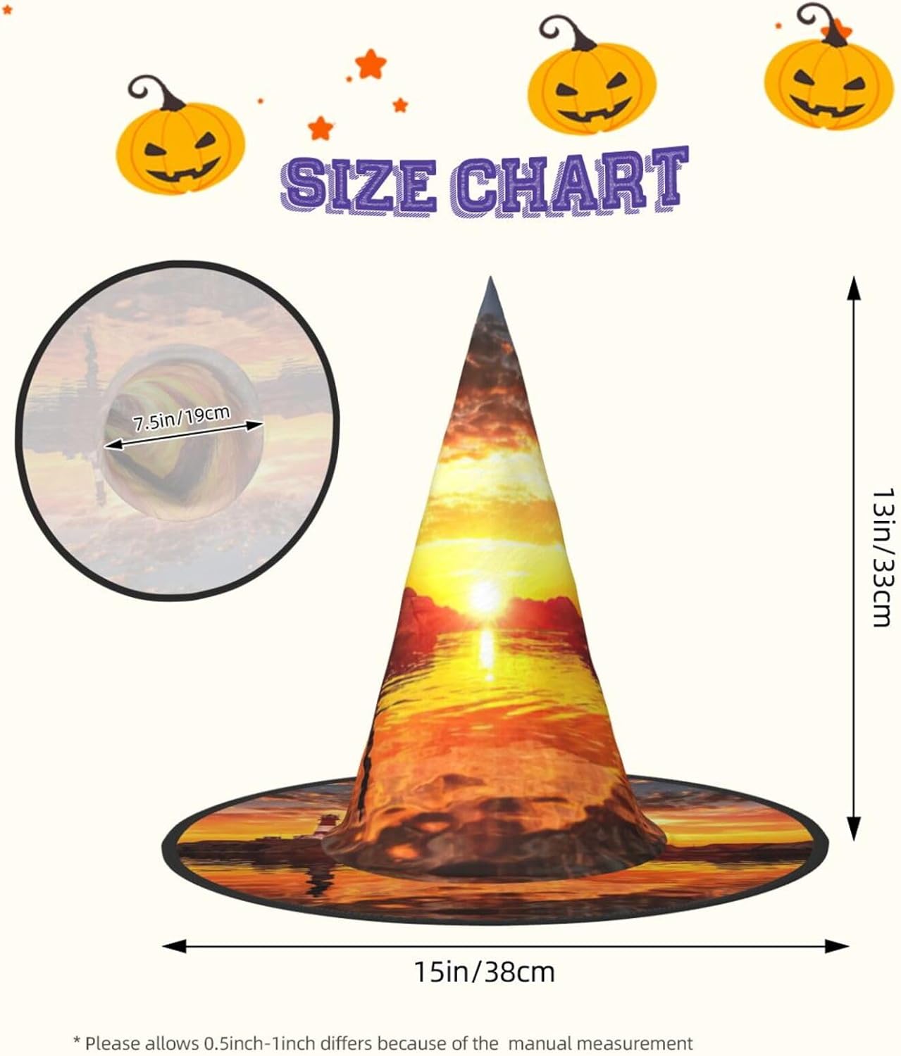 I cappelli da strega di Halloween del faro del mare al tramonto sono per adulti. \rIl cappello da strega è un ottimo accessorio per il costume di Halloween. Materiale: realizzato in resistente tessuto Oxford, morbido, confortevole e caldo. Dimensioni: standard. Dimensioni del prodotto: 33 x 38 cm. Perfetto per Halloween, Natale, balli in maschera, cosplay, riunioni, carnevali