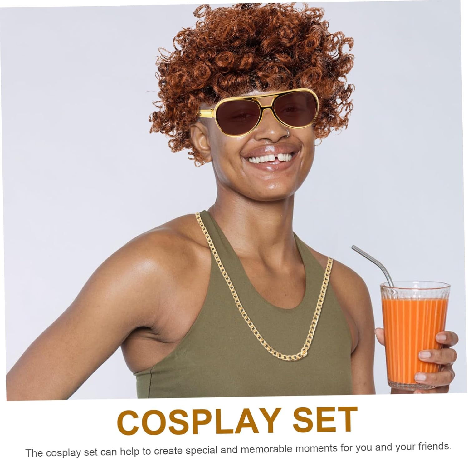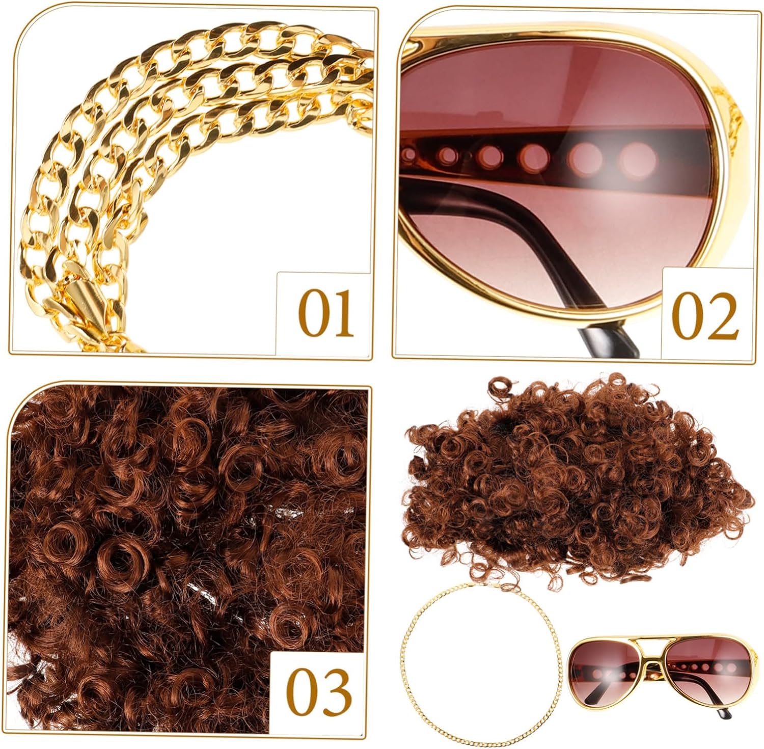 Il pacchetto include 1 x collana 1 x bicchiere 1 x parrucca Caratteristiche - Stile disco: gli accessori per costumi anni '70 sono pieni di stile disco alla moda, rendendoti il centro dell'attenzione alle feste con accessori cosplay da cantante rock. - Gli accessori del costume includono: parrucca, collana a catena, occhiali da sole, una aggiunta al tuo costume per una festa in discoteca. - Dimensioni: 60,00X0,50X0,10 cm/23,58X0,20X0,04 pollici (collana) forniture per feste in discoteca -Materiale: occhiali in resina e PC -Dimensioni: 31,00X31,00X13,00 cm / 12,18X12,18X5,11 pollici (parrucca) parrucche da uomo in costume da discoteca -Colore: collana con catena in costume di colori assortiti in stile discoteca - divertente: gli accessori per costumi anni '70 sono ottimi come , regali di compleanno, ma sono anche un'ottima idea per padre, , collega e accessori da discoteca. - Comodi da indossare: gli accessori anni '70 per uomo sono semplici e comodi da indossare, risparmiandoti le parrucche da uomo. -Dimensioni: 16,50X14,50X5,50 cm/6,48X5,70X2,16 pollici ( ) costumi Descrizione della merce da discoteca Allora perché accontentarsi di accessori noiosi quando puoi distinguerti con questi oggetti di scena unici e divertenti per le feste?. decorazioni per feste in discoteca Con il loro design realistico e l'attenzione ai dettagli, ti sentirai il re della pista in pochissimo tempo. bomboniere per feste in discoteca Perfetti per coloro che cercano di incanalare la loro atmosfera da festa anni '70 o di emulare il loro personaggio cinematografico americano preferito, questi oggetti di scena sono perfetti per eventi a tema o servizi fotografici