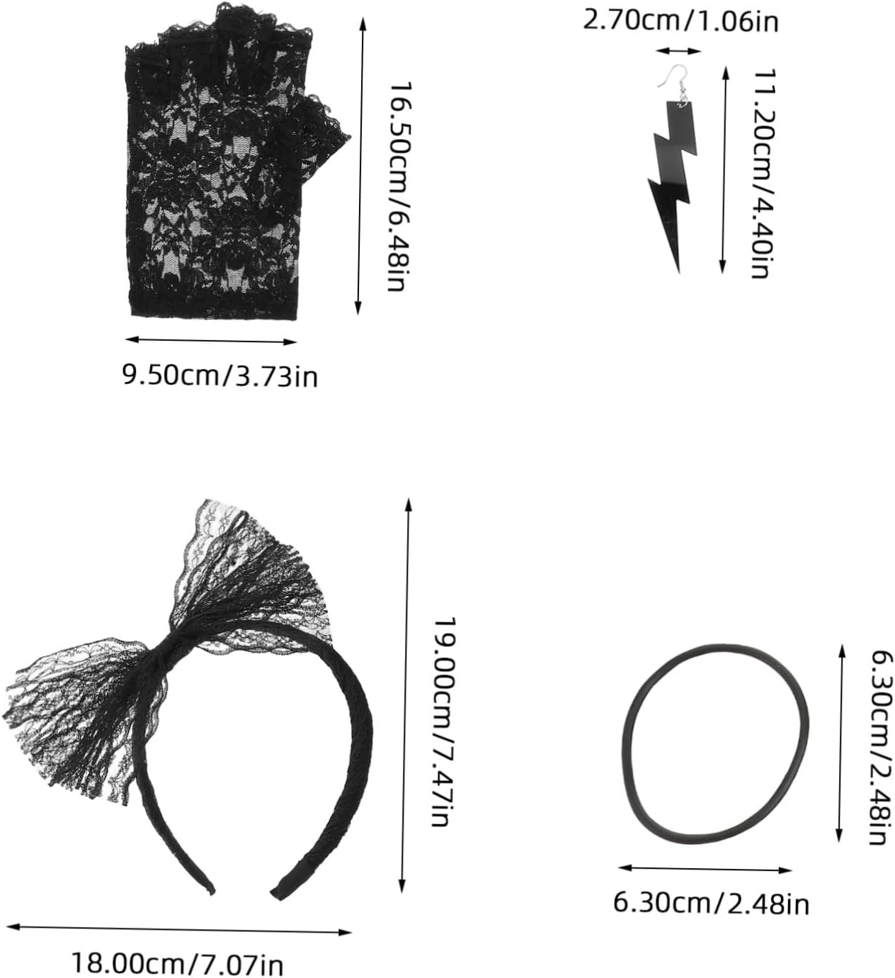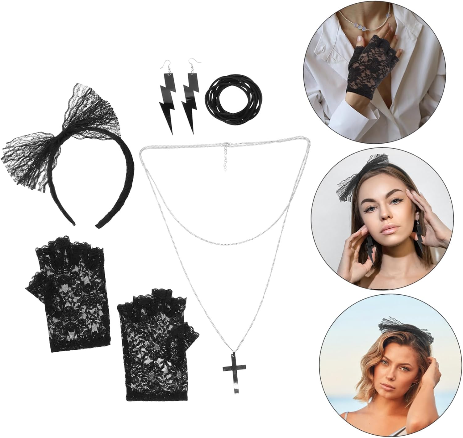 dei pacchetti 10 braccialetti, 1 fascia per , 1 paio di orecchini, 1 collana, 1 paio di guanti Caratteristiche -(guanti) Dimensioni: 16,50X9,50X0,20 cm/6,48X3,73X0,08 pollici collana cristiana -Materiale: decorazioni per costumi di Halloween in plastica + pizzo + lega di zinco -Elegante collana con croce: la collana con croce è un accessorio che arricchisce il tuo look generale con un tocco di spiritualità: fascia per e guanti. - Moda anni '80: con questo set retrò che cattura l'essenza della moda da festa degli anni '80, sarai l'anima della festa con i tuoi guanti delicati. -(orecchini) Dimensioni: 11,20X2,70X0,20 cm/4,40X1,06X0,08 pollici fascia in pizzo -(fascia) Dimensioni: 19,00X18,00X10,00 cm/7,47X7,07X3,93 pollici collana religiosa - (Braccialetti) Dimensioni: 6,30X6,30X0,30 cm / 2,48X2,48X0,12 pollici guanti in pizzo -Colore: accessori per costumi -Comfort duraturo: ogni pezzo è realizzato con una vestibilità comoda, che ti consente di goderti la tua esperienza di festa senza alcun disagio. -(collana) Dimensioni: 49,00X3,00X0,30 cm/19,26X1,18X0,12 pollici guanti in pizzo nero Informazioni sulle merci fascia e guanti La fascia completa il look, rendendola un must per creare outfit memorabili. collana con ciondolo a croce Progettato per la versatilità, questo set di accessori è ideale per feste a tema anni '80, celebrazioni di Halloween o eventi in maschera. collana fede I guanti in pizzo aggiungono un tocco di raffinatezza, mentre la collana e gli orecchini a croce forniscono una dichiarazione audace
