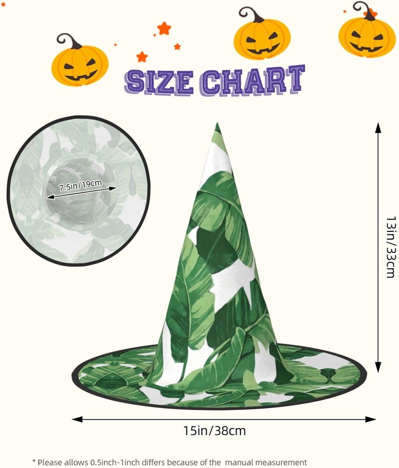 Simpatico cappello da strega verde con foglie di palma per Halloween. \rIl cappello da strega è un ottimo accessorio per il costume di Halloween. Materiale: realizzato in resistente tessuto Oxford, morbido, confortevole e caldo. Dimensioni: standard. Dimensioni del prodotto: 33 x 38 cm. Perfetto per Halloween, Natale, balli in maschera, cosplay, riunioni, carnevali