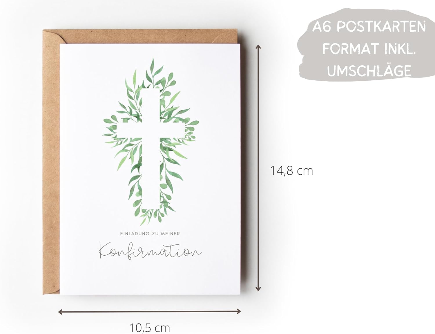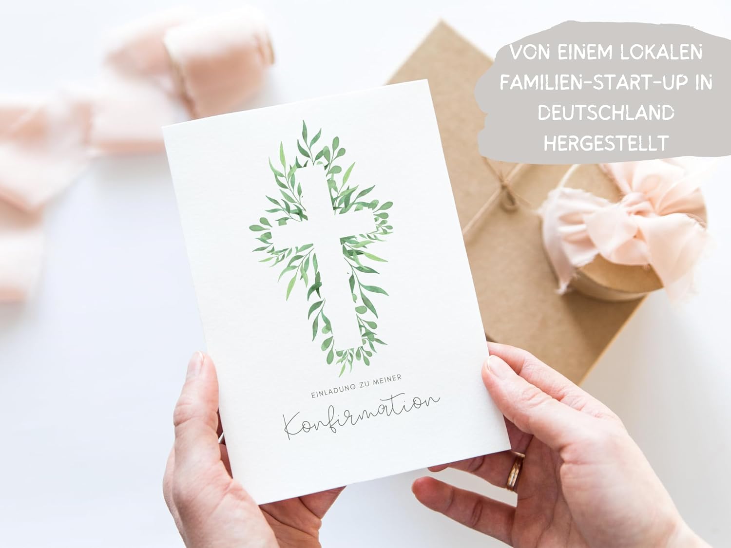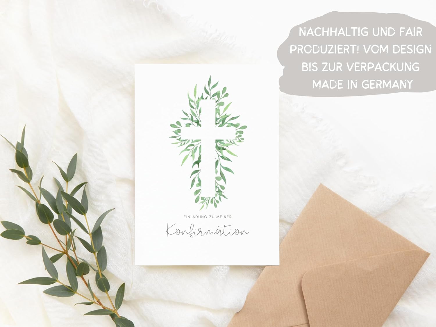 Conferenza di invito: i nostri biglietti d'invito sono stati progettati con grande attenzione ai dettagli per la festa della cresima. Il motivo floreale a croce in eucalipto conferisce ai biglietti un tocco moderno e allo stesso tempo senza tempo, che si adatta perfettamente all'atmosfera della cresima del tuo bambino ed è una vera attrazione! FACILE E VELOCE: il retro dei biglietti d'invito offre spazio sufficiente per tutte le informazioni importanti per celebrare la cresima: luogo, data, ora e dettagli aggiuntivi possono essere aggiunti senza sforzo. Basta compilare, distribuire e siete pronti! Design speciale: il motivo floreale a croce è stato progettato con attenzione ai dettagli. Come piccola start-up per famiglie, diamo particolare importanza al design moderno e ai prodotti pratici che facilitano la vita a te e alla tua famiglia. Alta qualità: ci affidiamo alla qualità di prima classe. I biglietti sono realizzati in robusto cartone cromato (260 g/m²) con una superficie opaca che si può scrivere in modo eccellente. Le buste abbinate in carta kraft, realizzate in carta riciclata completano il pacchetto sostenibile. MADE IN GERMANY: i nostri prodotti sono realizzati in Germania con la massima cura e sostenibilità, dalla progettazione all'imballaggio. Affidati alla qualità e supporta la produzione locale.
