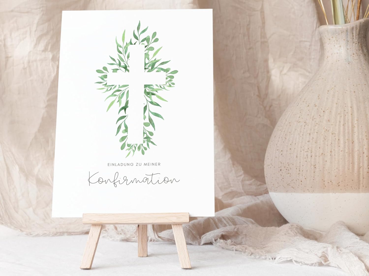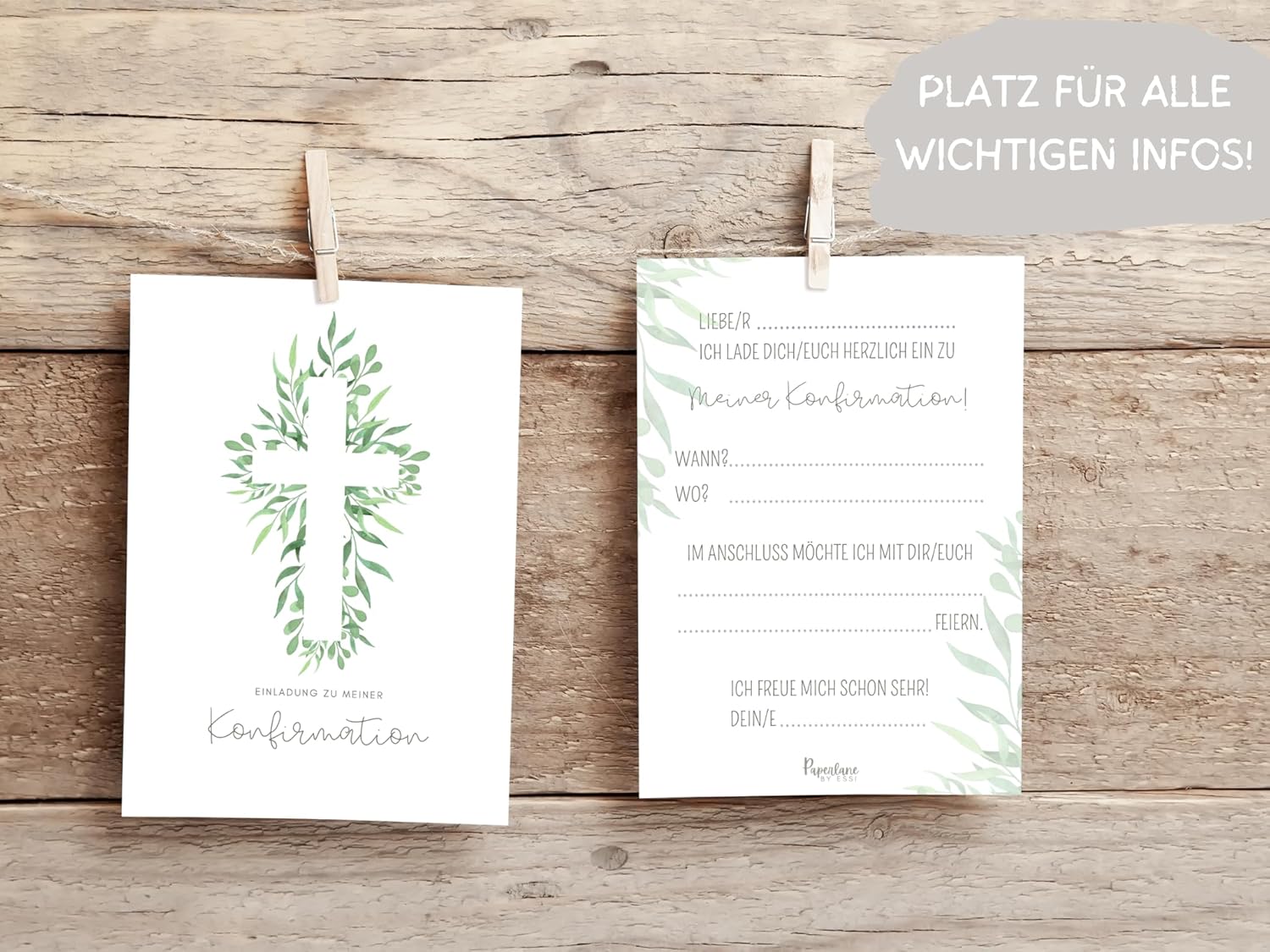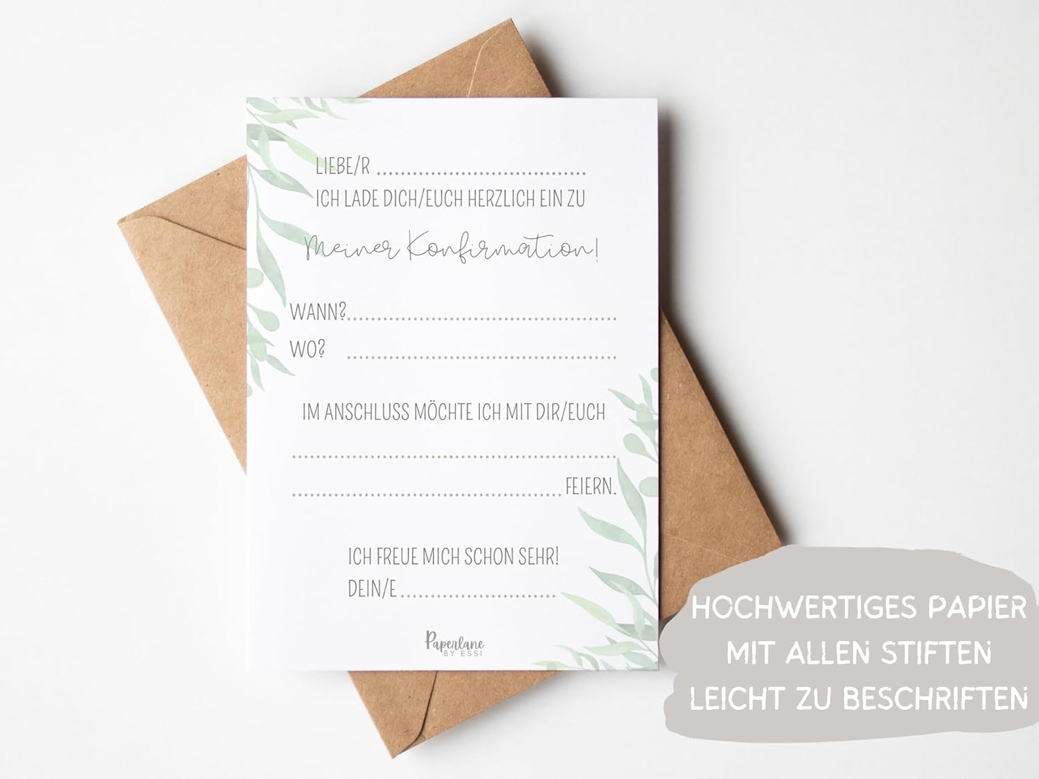 Conferenza di invito: i nostri biglietti d'invito sono stati progettati con grande attenzione ai dettagli per la festa della cresima. Il motivo floreale a croce in eucalipto conferisce ai biglietti un tocco moderno e allo stesso tempo senza tempo, che si adatta perfettamente all'atmosfera della cresima del tuo bambino ed è una vera attrazione! FACILE E VELOCE: il retro dei biglietti d'invito offre spazio sufficiente per tutte le informazioni importanti per celebrare la cresima: luogo, data, ora e dettagli aggiuntivi possono essere aggiunti senza sforzo. Basta compilare, distribuire e siete pronti! Design speciale: il motivo floreale a croce è stato progettato con attenzione ai dettagli. Come piccola start-up per famiglie, diamo particolare importanza al design moderno e ai prodotti pratici che facilitano la vita a te e alla tua famiglia. Alta qualità: ci affidiamo alla qualità di prima classe. I biglietti sono realizzati in robusto cartone cromato (260 g/m²) con una superficie opaca che si può scrivere in modo eccellente. Le buste abbinate in carta kraft, realizzate in carta riciclata completano il pacchetto sostenibile. MADE IN GERMANY: i nostri prodotti sono realizzati in Germania con la massima cura e sostenibilità, dalla progettazione all'imballaggio. Affidati alla qualità e supporta la produzione locale.