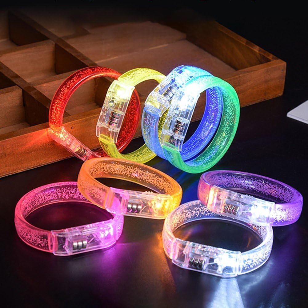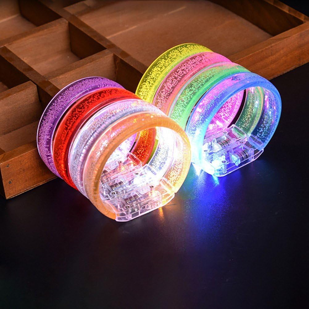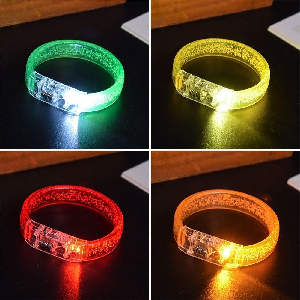 Braccialetto a bolle LED, braccialetto lampeggiante buio con una varietà di colori, colorate che lampeggiano costantemente, proprio come l'arcobaleno che si accende buio; ideale per intrattenimento, rave party, compleanni, festival, matrimoni, attività notturne, falò, discoteche, carnevali, Halloween, eventi chiuso e all'aperto, rave party e altro ancora per intrattenimento o celebrazioni. Braccialetti LED in 7 colori brillanti, colorati e bellissimi; quando li usi, prova a usarli in luoghi bui che possono riflettere meglio l'effetto delle bolle, rendendo migliore l'effetto del braccialetto e il colore della luce cambia costantemente, creando un'atmosfera migliore, ideale per i rave party. Ogni braccialetto LED è dotato di 3 batterie sostituibili; per un utilizzo a lungo termine del braccialetto è sufficiente sostituirle. Il braccialetto è realizzato in materiale leggero, spesso e rigido; i materiali di qualità gli conferiscono un buon effetto di visualizzazione dei colori. Il braccialetto è adatto per gli amanti delle feste, i ballerini, i cosplayer, i bambini, gli uomini e le donne: puoi indossarlo ovunque, sui polsi, sulle braccia e sulle caviglie, a seconda di te. L'interruttore ON/OFF fluttuante può essere riutilizzato e controllato te, facile usare; il prodotto è facile indossare, prima separa il prodotto, estrailo delicatamente, poi metti prima l' sulla mano, infine quando sono uniti, puoi indossare con successo il braccialetto (è possibile combinare più braccialetti).