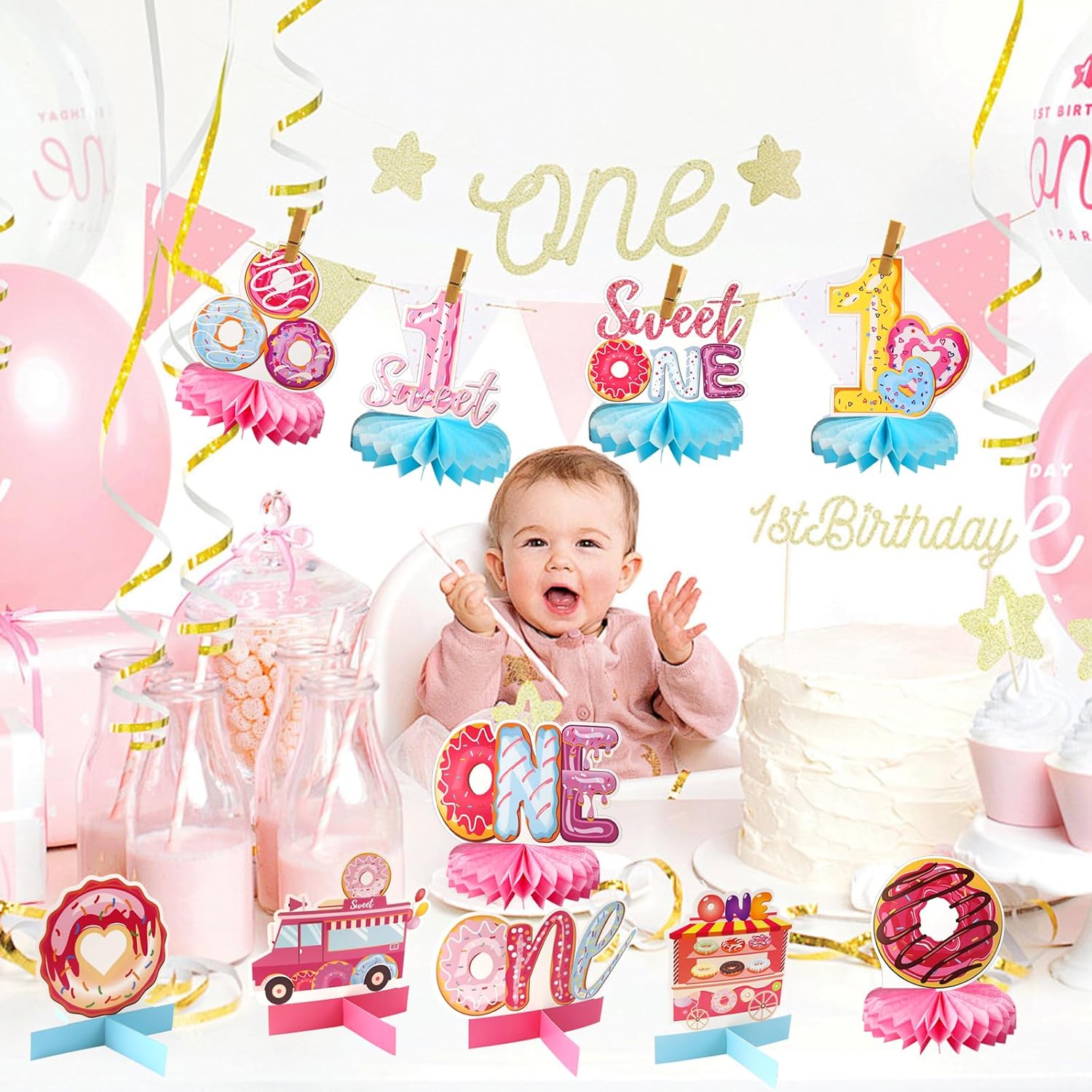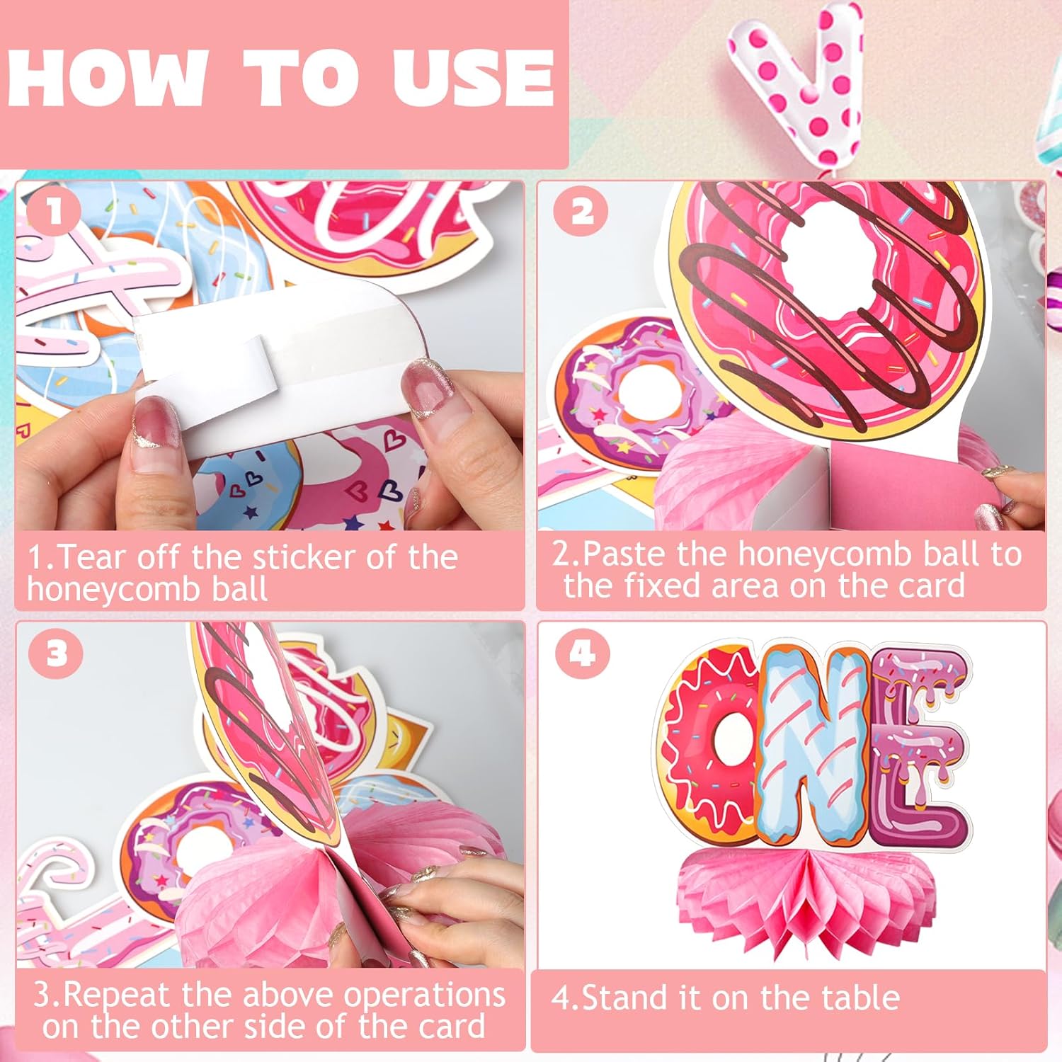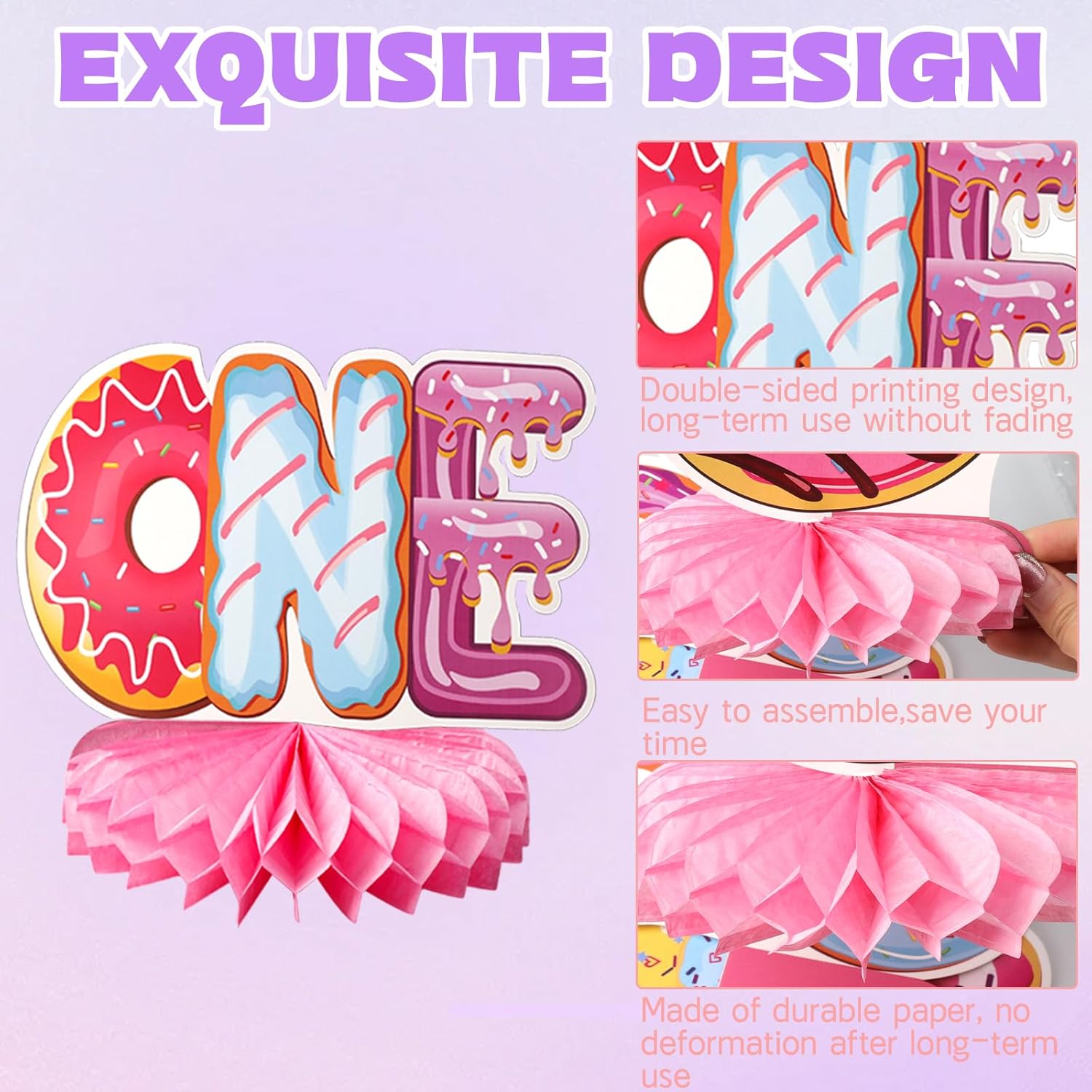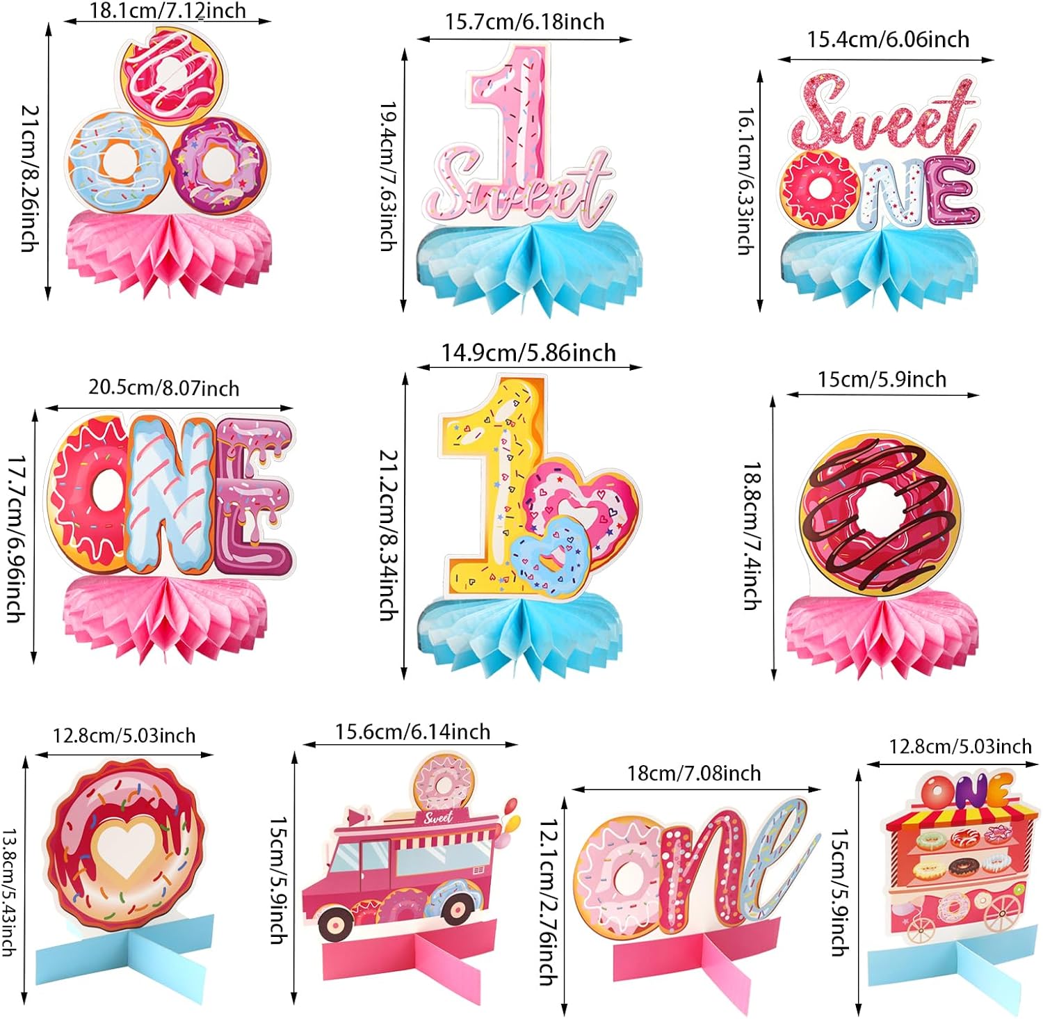 Contenuto della confezione: riceverai 10 pezzi di ciambella 1 ° compleanno a nido d'ape centrotavola decorazioni per feste, ognuno con 10 diversi stili di disegni a ciambella, per creare una dolce atmosfera di compleanno per te. Splendidamente progettati e impressionanti, questi elementi decorativi saranno sicuramente il punto focale del tuo evento Design unico: i centrotavola a nido d'ape a ciambella utilizzano un ricco design a motivo, con ciambelle di diverse forme e "1", "dolce", "uno", creando un'atmosfera dolce evidenziando il tema del primo compleanno. I tuoi bambini piaceranno, rendendo la tua festa dolce e accattivante Materiale di alta qualità: il centrotavola da tavolo di compleanno di 1 anno è realizzato in cartone di alta qualità, la stampa fronte/retro è chiara, nessun odore, non sbiadisce facilmente e può essere utilizzata a lungo. Mostra la tua personalità mostrando consapevolezza ambientale Facile da installare: le decorazioni per feste di compleanno a ciambella sono semplici e veloci. Basta strappare gli adesivi a forma di nido d'ape, attaccare la palla a nido d'ape all'area fissa nella parte inferiore della carta e ruotare la sfera a nido d'ape di 360 gradi per attaccarla all'altro lato del cartone. Inoltre, l'assemblaggio può essere facilmente completato agganciando due cartoni rettangolari insieme lungo lo spazio per formare un supporto a croce di cartone Ampia applicazione: i centrotavola a ciambella possono essere utilizzati per decorare molte occasioni. Come decorazioni per feste a tema per il primo compleanno delle ragazze, baby shower, feste estive, riunioni di amici, ecc. Queste decorazioni ben fatte possono aggiungere un'atmosfera unica e personalizzata alla tua festa