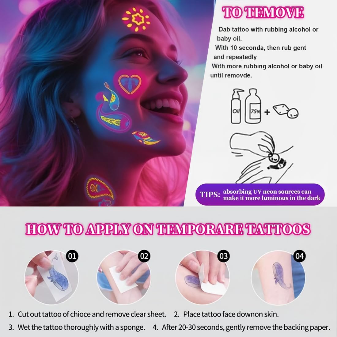Tatuaggi fluorescenti per feste: 10 tatuaggi fluorescenti temporanei. I bellissimi tatuaggi finti al neon sembrano luminosi sotto la luce nera o la luce ultravioletta. I design ibridi unici,freschi e divertenti ti rendono più attraente. Ipnotizzante in ogni momento! Provalo subito! Gadget per feste: divertenti regali per tatuaggi per donne o uomini. Un gadget che aggiunge allegria a qualsiasi evento o festa. Tatuaggi per feste,addii al nubilato,feste hawaiane,Oktoberfest,matrimoni,carnevali di compleanno,Halloween,DJ,ecc Facile da usare: i tatuaggi per adulti con trasferimento d'acqua ritagliano semplicemente il disegno,staccano la pellicola protettiva,applicano sulla pelle,bagnano la carta del tatuaggio con acqua e aspettano 10 secondi per il completamento del trasferimento. Per rimuoverlo,è sufficiente immergere il tatuaggio in acqua saponata per 30 secondi o lavarlo con un gel doccia. Data di scadenza lunga: gli adesivi per tatuaggi sono validi da 2 a 5 giorni,a seconda della frequenza di lavaggio. I tatuaggi al neon possono essere utilizzati su viso,mani,piedi,collo,spalle,gambe e altro ancora! Il suo valore di fascino ti stupirà sicuramente Delicato sulla pelle: il tatuaggio falso misura 6,77 x 3,77 pollici ed è realizzato con pigmenti vegetali. Forte adesione,impermeabile e resistente al sudore. Colori vivaci e bel design. Non ha paura delle piscine all'aperto o delle piscine,ecc