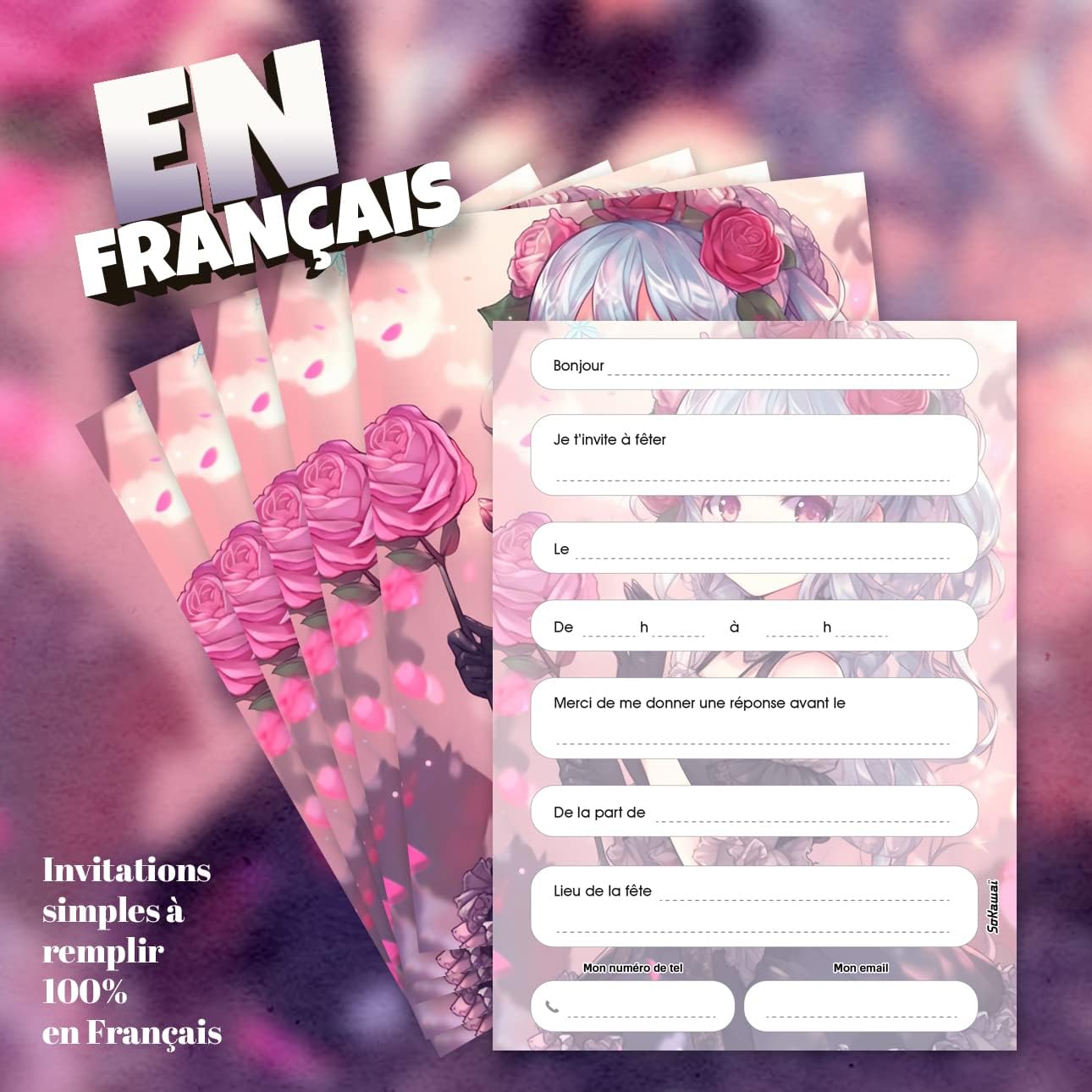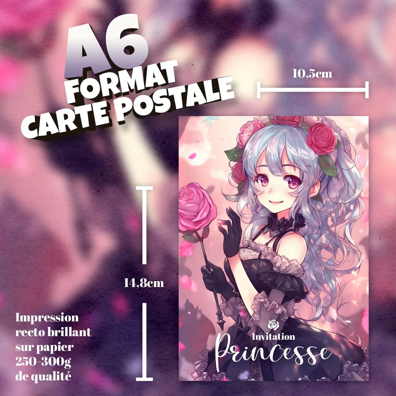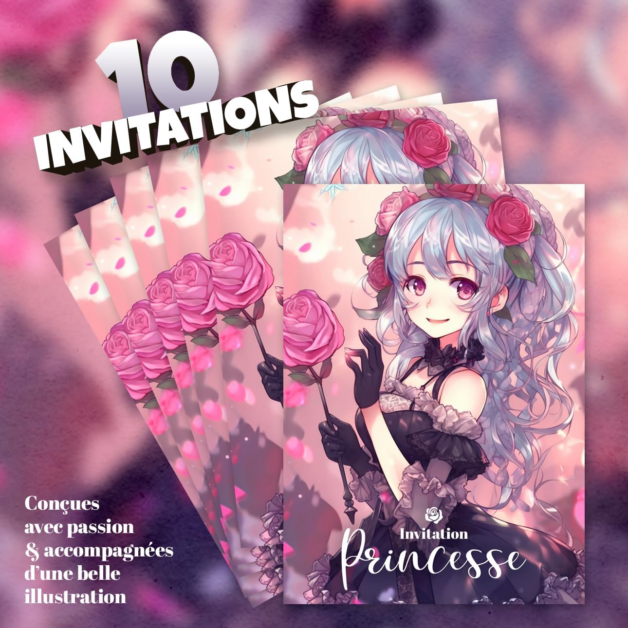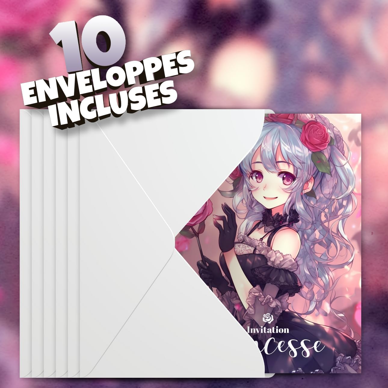 10 inviti per un compleanno di bambini di successo 10 buste incluse 10 adesivi offerti per decorare le vostre buste Bellissima illustrazione Manga sul tema delle principesse Testo dell'invito precompilato 100% in formato cartolina francese - 14,8x10,5 cm Cartoncino rigido 250-300 g