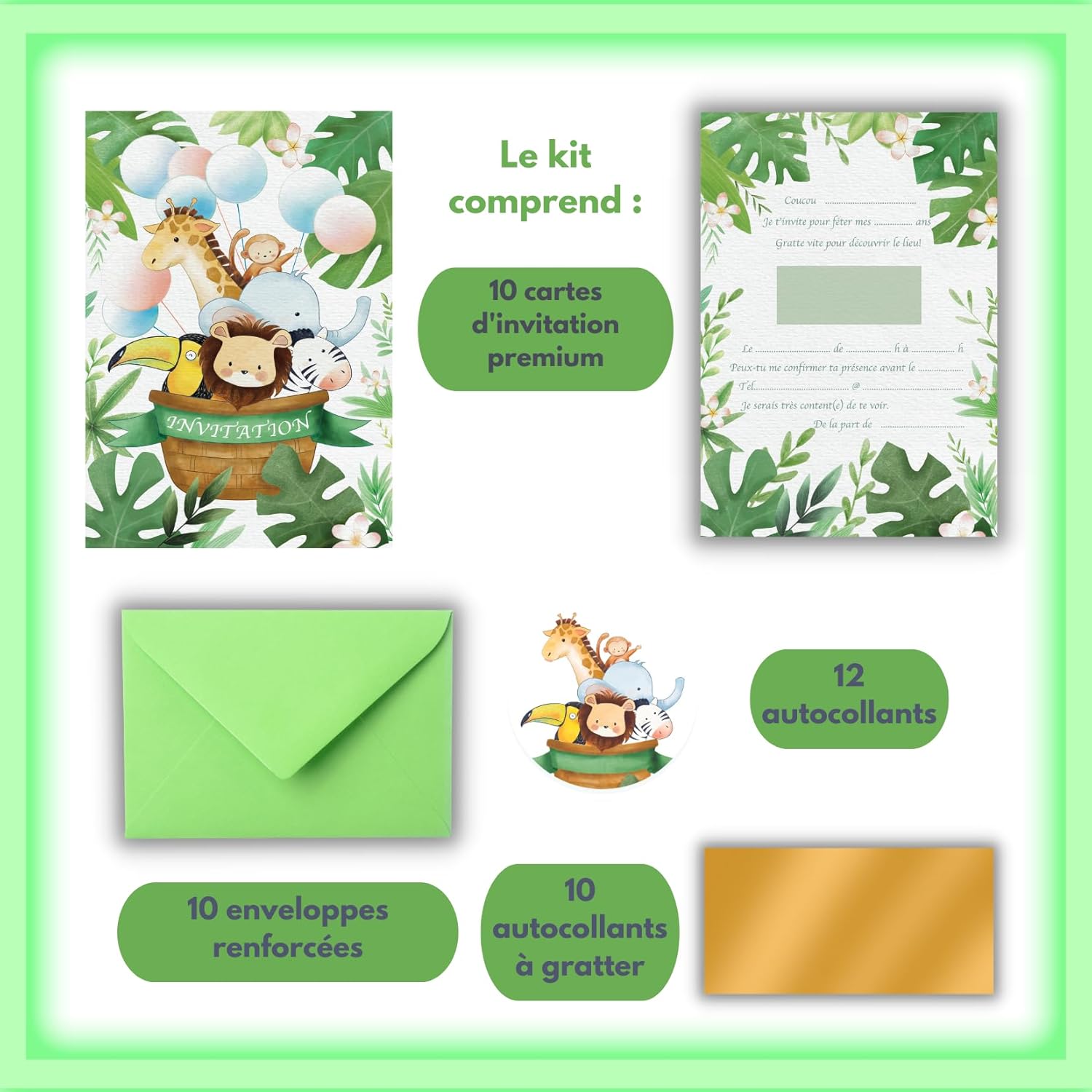 COMPLETO E CREATIVO - Per iniziare bene una festa di compleanno, abbiamo pensato a tutto per te: 10 biglietti invito, 10 buste, 12 adesivi, 10 adesivi da grattare. ORIGINALE - Le nostre carte sono progettate dai nostri appassionati grafici. Tuo figlio può aiutarlo a preparare la festa di compleanno. E sarà orgoglioso di inviare graziose cartoline ai suoi amici. PRATICO - Le nostre carte sono prestampate fronte e retro in francese. Il bambino potrà facilmente completare le informazioni, attaccare gli adesivi da grattare per nascondere il luogo della festa, personalizzare la busta con gli adesivi autoadesivi. DIVERTIMENTO - Gli ospiti saranno molto felici di ricevere un invito originale e avranno il piacere di scoprire le informazioni sulla località grattando la card. SODDISFATTI O RIMBORSATI - EVTI è una giovane marca francese che offre prodotti per le vacanze dei bambini. La qualità dei nostri prodotti è essenziale, ci impegniamo a fornirvi i prodotti che meglio soddisfano le vostre esigenze e richieste. Per raggiungere questo obiettivo, vi ascoltiamo e abbiamo il cuore di lavorare per soddisfarvi.