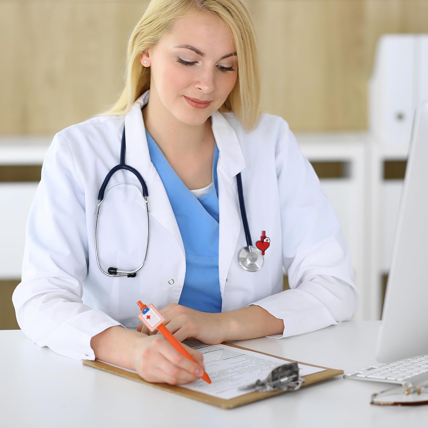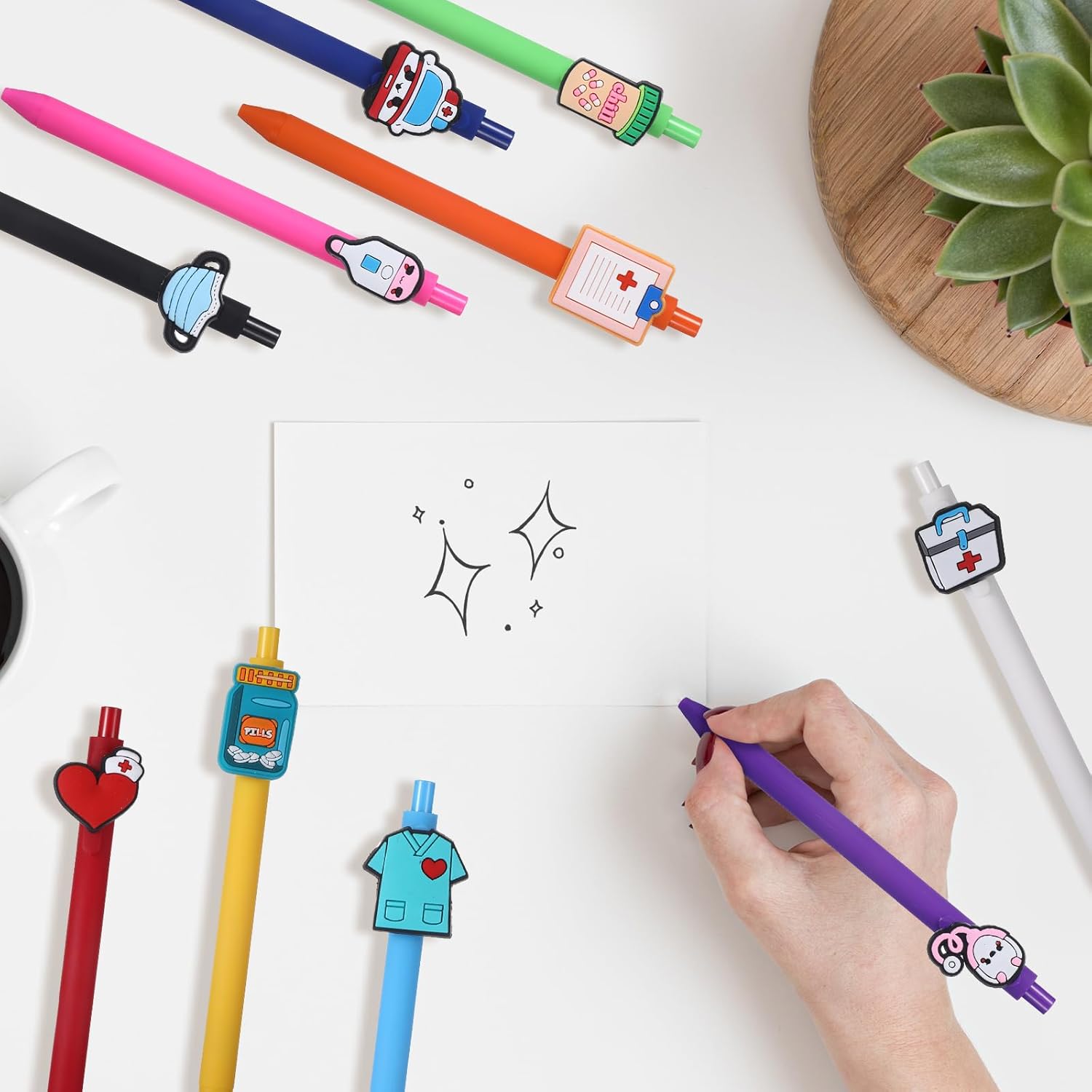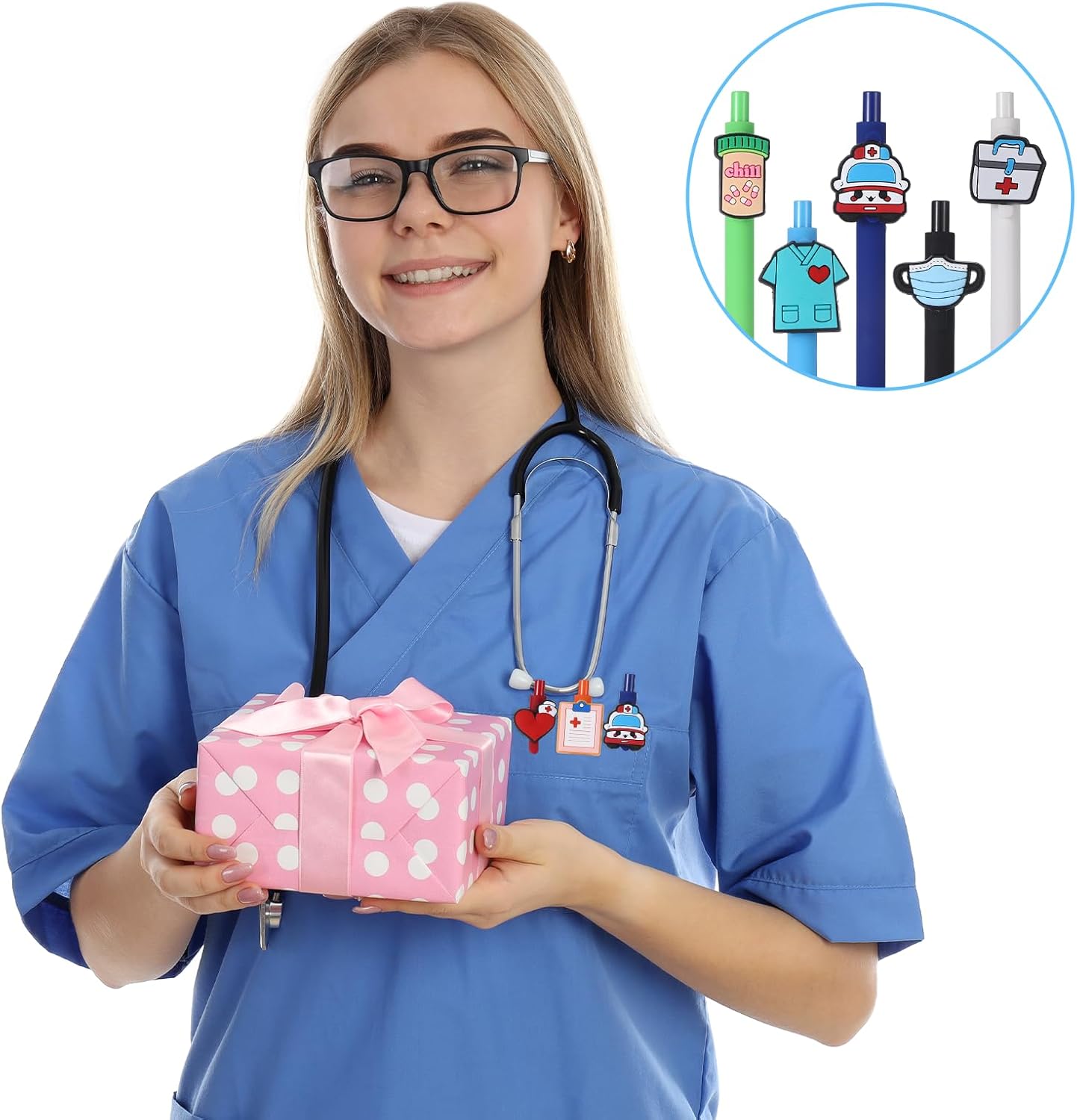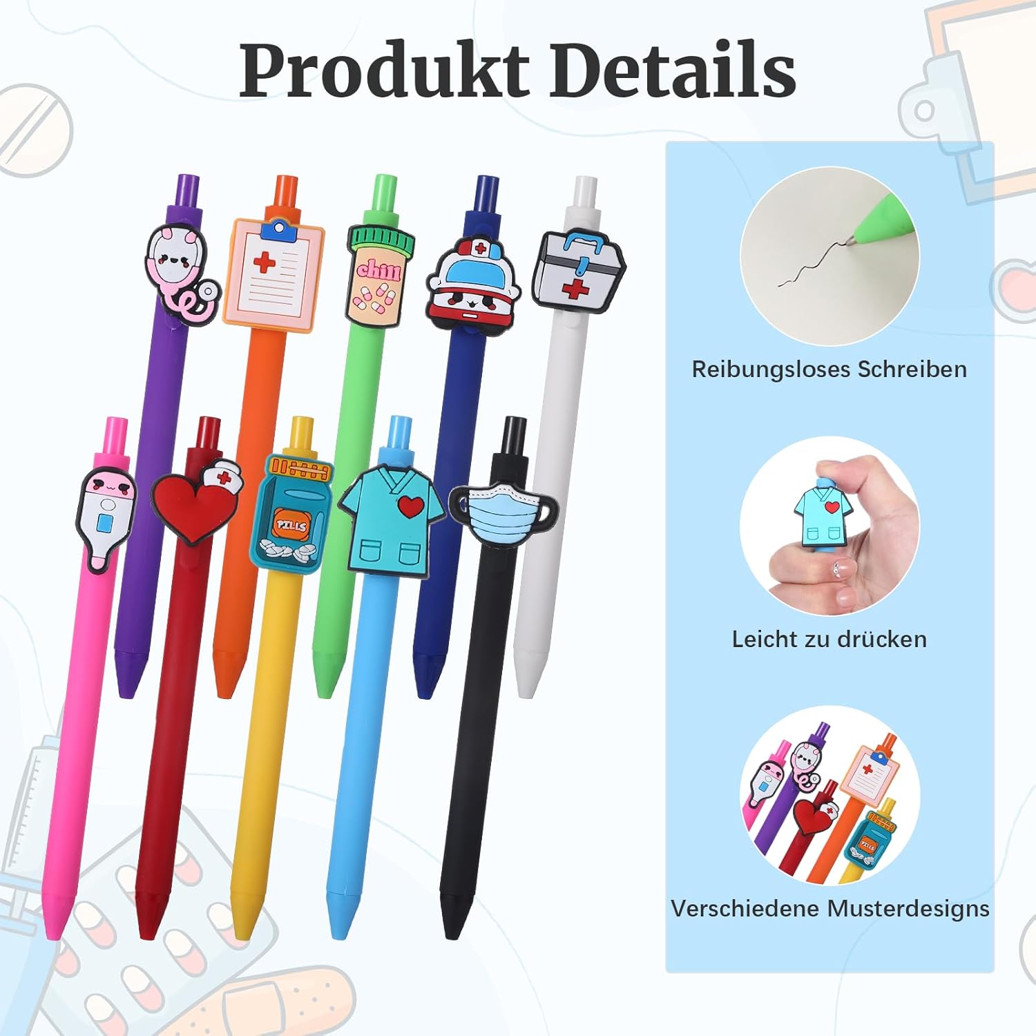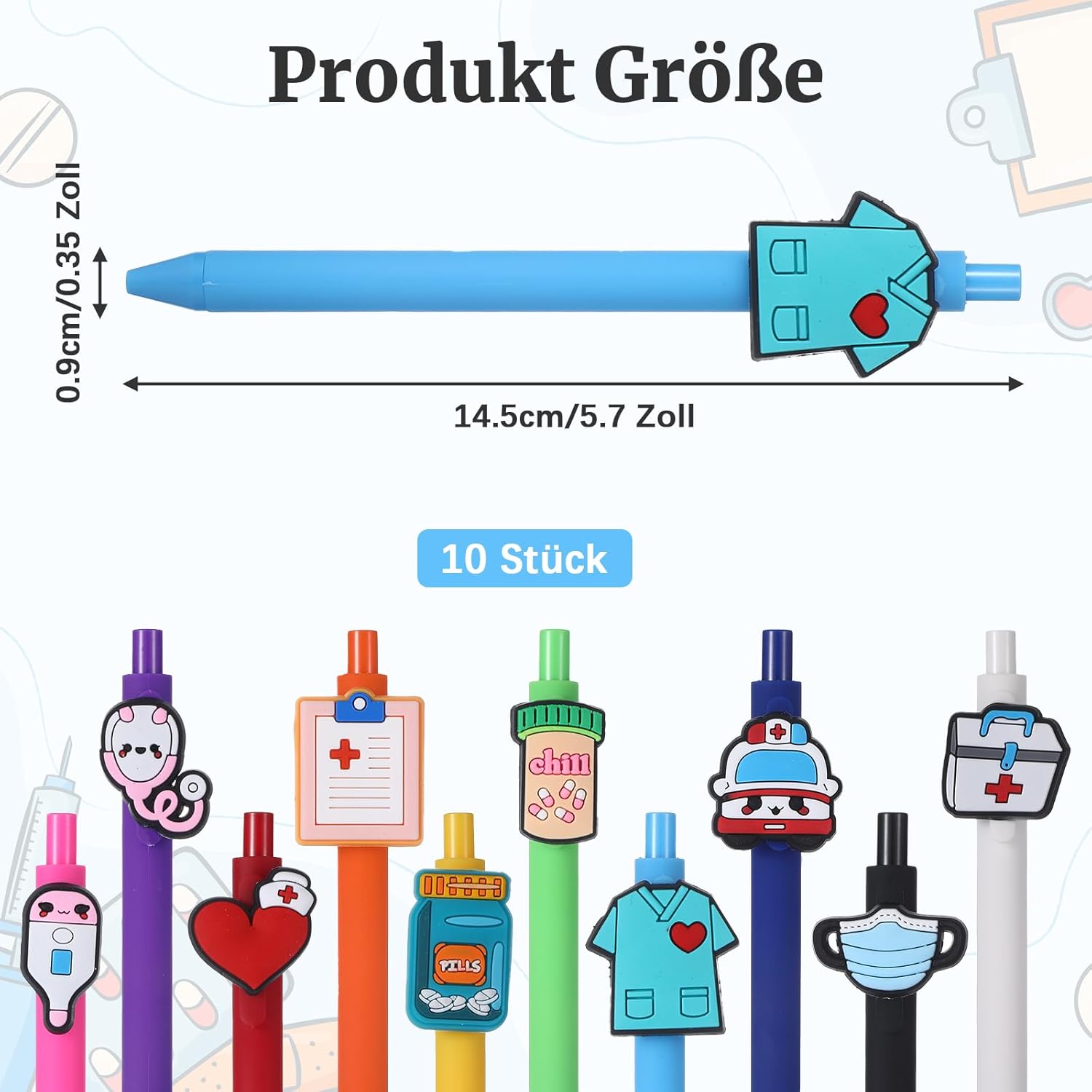 Gamma e design del prodotto: questo set di penne a sfera da infermiera contiene 10 penne di alta qualità con eleganti design in silicone e PVC, ognuna con un motivo medico unico: forme per infermieri, stetoscopi, bottiglie mediche e altro ancora. Le dimensioni adatte di 14,5 x 0,9 cm (5,7 x 0,35 pollici) lo rendono il regalo perfetto per infermieri e medici che combinano umorismo e professionalità Materiale e lavorazione: i perni per accessori sono realizzati in PVC resistente per la cassa e morbido silicone per il manico, offrendo una presa confortevole anche in caso di uso prolungato. Le stampe ad alta intensità di colore sulle clip della penna sono resistenti all'abrasione e non sbiadiscono facilmente Funzioni e pratica: ogni penna ha una punta liscia per una scrittura fluida e precisa, ideale per moduli, appunti o cartelle cliniche. La clip in PVC integrata mantiene la penna saldamente in tasche per camicie, quaderni o portablocco Campi di applicazione: le penne a sfera infermiere sono adatte non solo per uso professionale, ma anche come accessori motivazionali nella vita privata. I svariati motivi si rivolgono a professionisti sanitari maschili e femminili Valori aggiuntivi: la dimensione uniforme si adatta a qualsiasi borsa medica, mentre il design in PVC è resistente e facile da pulire, un robusto accessorio per regali da badante che illumina la vita quotidiana in ospedale