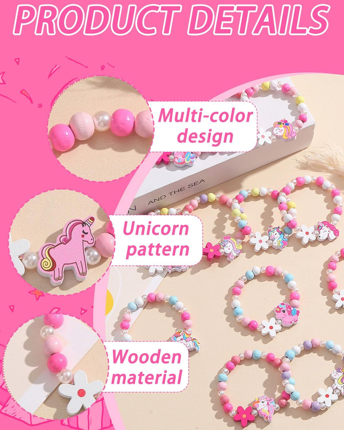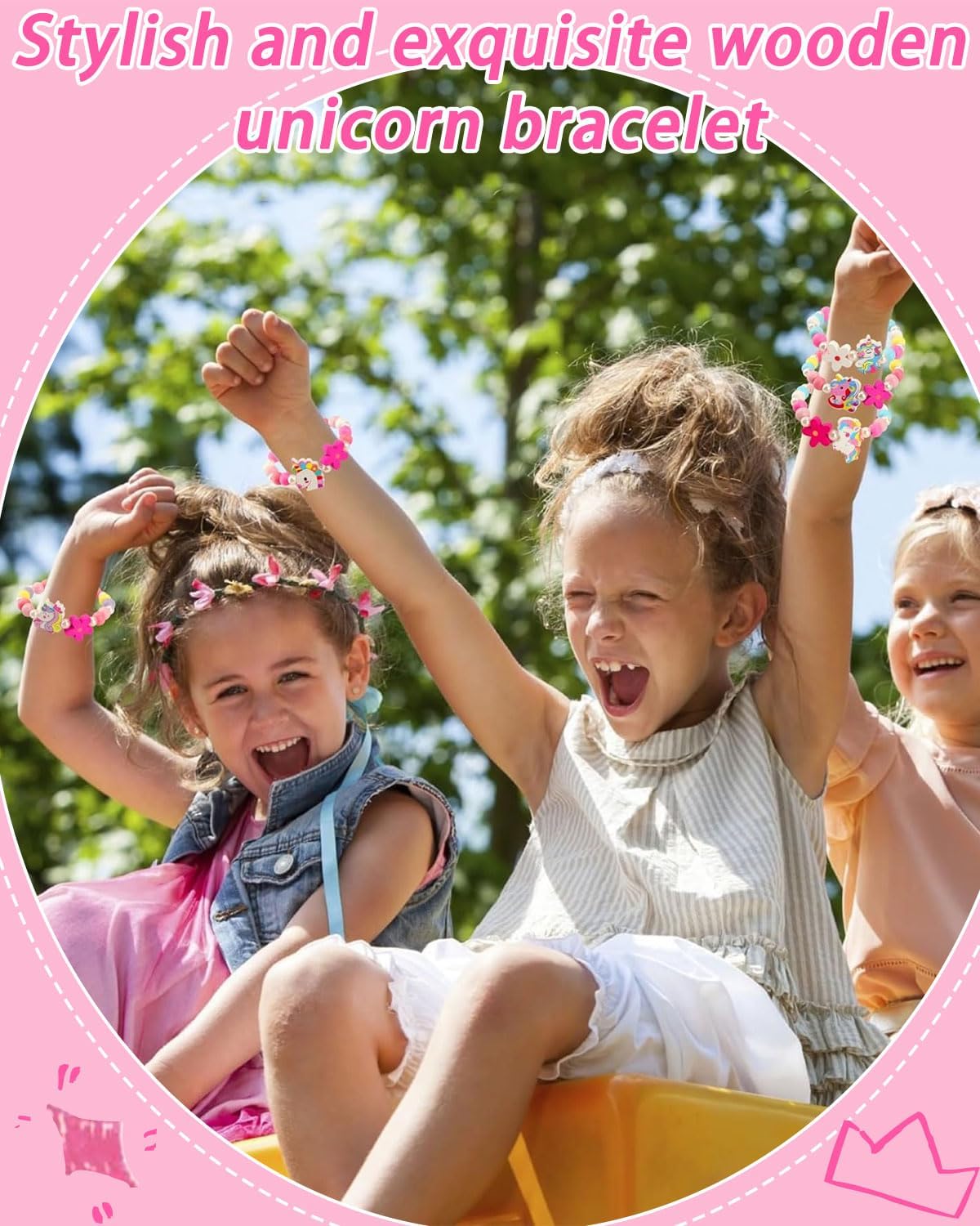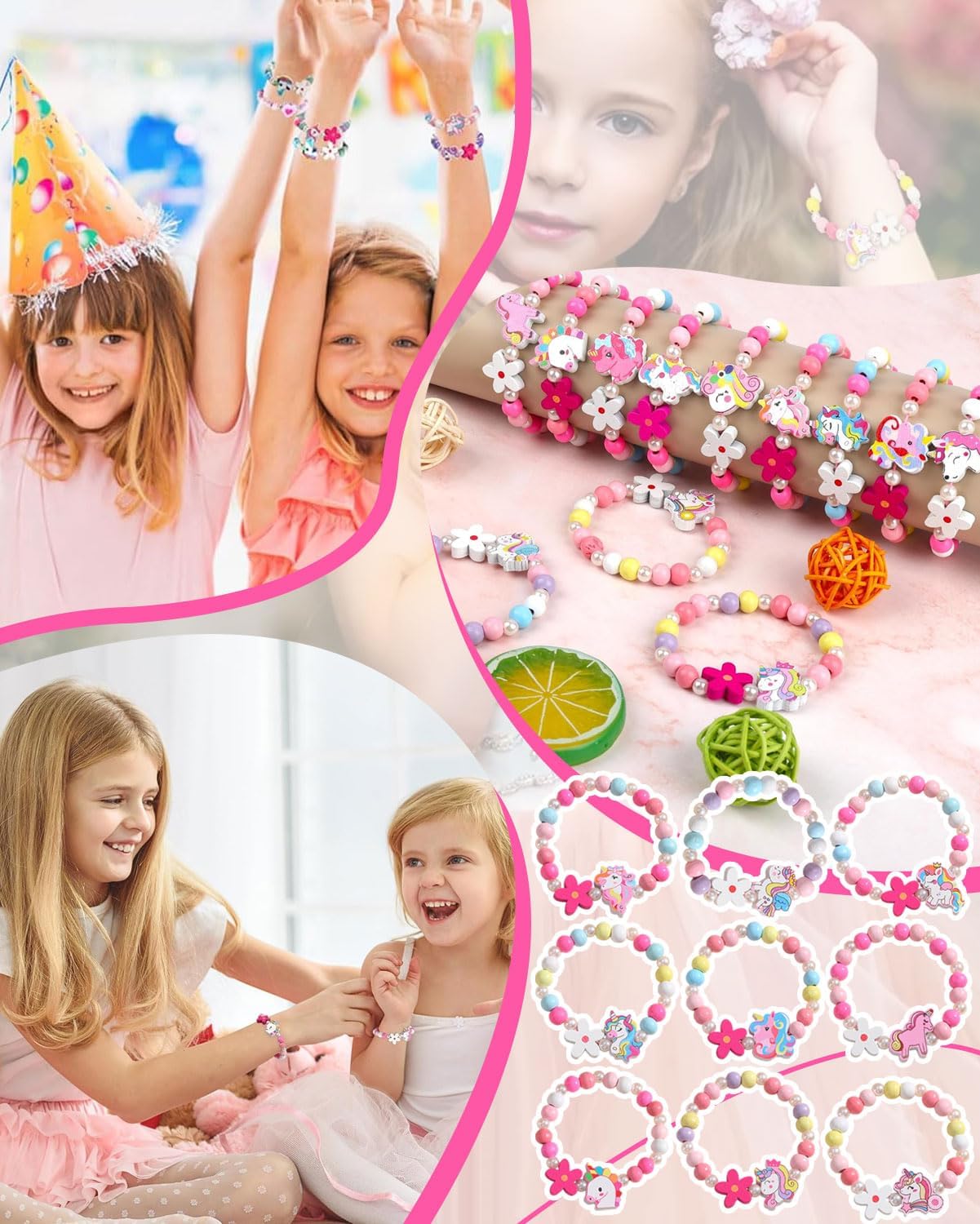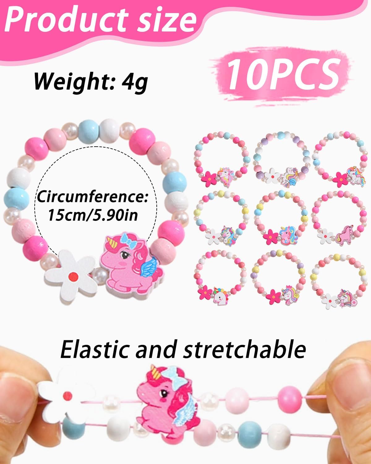 Set di braccialetti in legno: I nostri gioielli da regalo per le bambine comprendono 10 braccialetti vivaci con adorabili ciondoli a forma di unicorno, che offrono stili versatili da indossare ogni giorno. I bambini possono giocare con gli amici alle feste o indossare questi braccialetti come accessori quotidiani. Usi versatili:Questi braccialetti possono essere utilizzati come bomboniere, premi in classe, premi di giochi, oggetti da collezione o accessori fotografici. Perfetti per feste di compleanno, feste a tema principesse, feste a tema unicorni, matrimoni, Natale, Halloween, San Valentino, eventi in maschera o altre festività. Sono anche una piacevole sorpresa quotidiana per i bambini, incoraggiando il gioco fantasioso e il divertimento senza fine. Il regalo perfetto per le ragazze:Questi graziosi braccialetti sono molto popolari tra i bambini; i nostri set di braccialetti dell'amicizia sono un regalo eccellente per tua figlia, tua nipote, tua sorella o tua cognata. Lascia che si distinguano tra la folla di una festa, con un look elegante e adorabile. Puoi anche condividere questi braccialetti con gli amici per rafforzare i legami e creare ricordi indelebili. Eleganza senza sforzo: Questi braccialetti colorati in legno sono disponibili in diversi modelli, catturano facilmente l'attenzione delle ragazze e soddisfano le loro esigenze quotidiane: perfetti da abbinare a vari abiti, camicie e outfit. Adornata con questi braccialetti distintivi, la tua piccola principessa si distinguerà dalla folla con la sua energia vibrante e il suo fascino. Materiale e dimensioni: Realizzati con perline di legno naturale con un rivestimento atossico e inodore, i nostri braccialetti sono leggeri e sicuri da indossare. Ciascuno è dotato di un elastico per indossarli e toglierli facilmente, rendendoli accessori perfetti per le feste dei più piccoli. Lunghi 14 cm, sono disponibili in colori vivaci e con disegni adorabili, ideali per le giovani principesse.