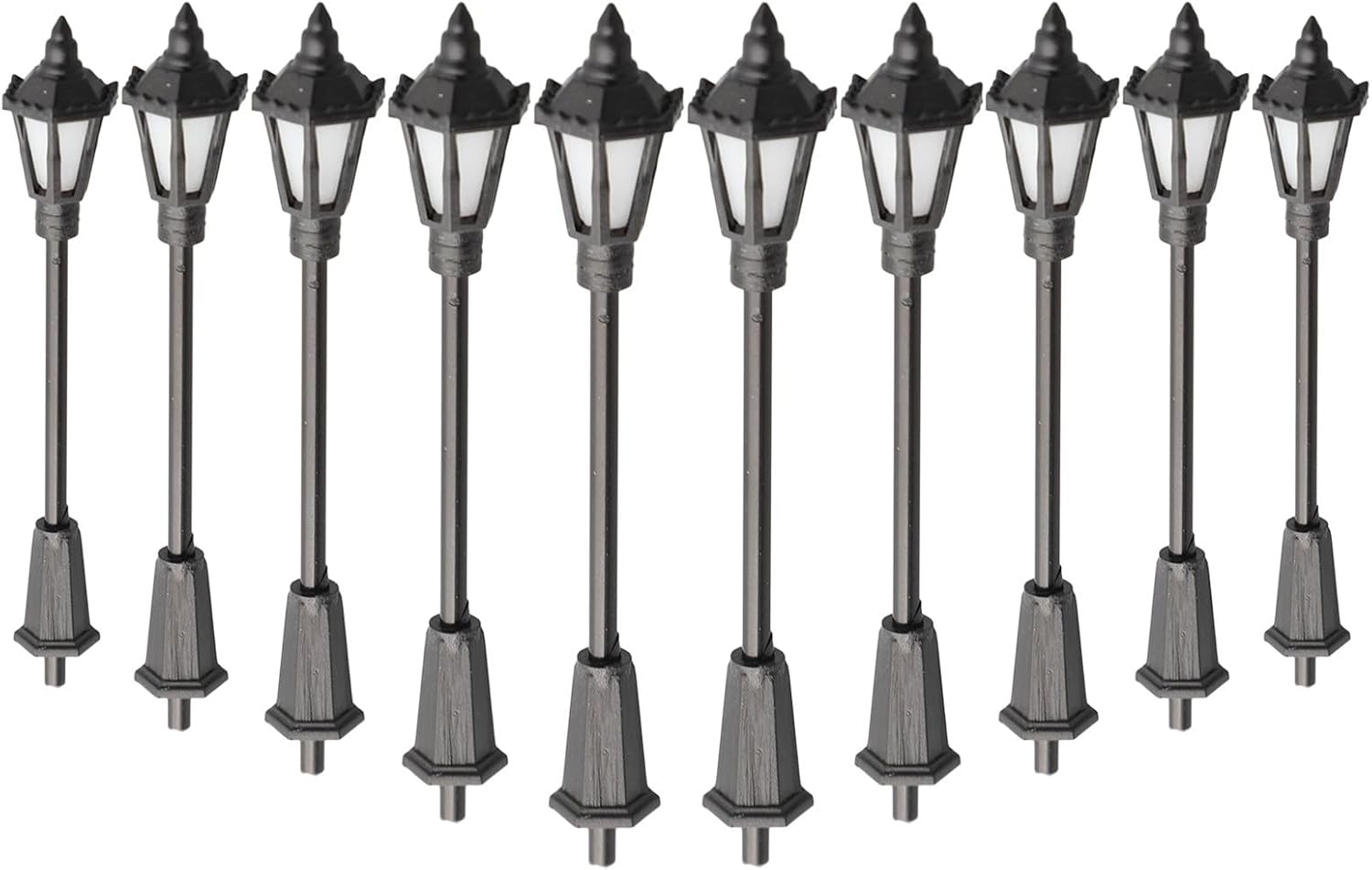 Set di lampade stradali a LED (10 pezzi): con LED 3V precablati e resistenze abbinate per un funzionamento sicuro e stabile; progettato specificamente per layout ferroviari in scala HO e 00 per migliorare il realismo in scene di giardino, diorami o modelli di tavoli da sabbia Effetto realistico: questi lampioni in plastica alti 65-70 mm presentano un'illuminazione a LED bianca calda che dà vita ai paesaggi urbani notturni; ideali per paesaggi di modellismo, paesaggi di muschio o configurazioni di bottiglie ecologiche fai da te Per una facile installazione e compatibilità: ogni lampada viene fornita con cavo da 25 cm per un posizionamento flessibile; compatibile con alimentazione generale da 3 V CC e richiede corrente di funzionamento di 20 mA per LED per una luminosità ottimale e prestazioni di lunga durata Precisione della scala e dettaglio: -realizzate in rapporto scala da 50 a :100, queste luci corrispondono a binari HO e standard di layout /00; la loro larghezza di 10 mm e l'altezza regolabile senza soluzione di continuità integrazione in ambienti urbani o rurali in miniatura Sicuro e design: realizzato con materiali plastici ecocompatibili; possono verificarsi lievi variazioni di colore a causa o impostazioni, ma tutti i componenti sono costruiti per resistere all'uso a bassa tensione in applicazioni hobby indoor