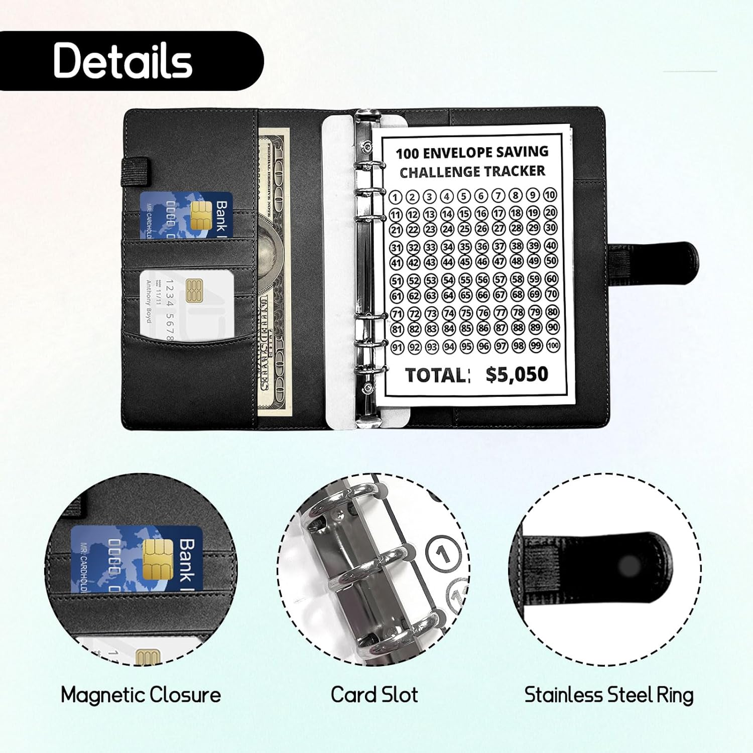 【Trasforma il risparmio in un gioco】 - Presentiamo la cartella Challenge con 100 buste. Perfetto per i fan della UK Savings Challenge perché rende il risparmio un'attività adatta a tutta la famiglia. Durevole e riutilizzabile: realizzato in pelle di alta qualità, dimensioni 17,5 x 23,4 cm, può essere conservato per tutta la vita. Pelle di alta qualità, resistente agli strappi, che può essere pulita e riutilizzata per qualsiasi nuova sfida di risparmio che tu o la tua famiglia. 【Sistema di budgeting completo】 - Il nostro portafoglio risparmio di denaro non è solo alla moda, ma anche alla moda. Questo è un kit completo di strumenti finanziari. Viene fornito con 100 scomparti di risparmio, diverse carte di bilancio e pennarelli cancellabili riutilizzabili, rendendolo perfetto per i britannici che vogliono affrontare una sfida di risparmio e gestire facilmente i loro soldi. Pratico e portatile: controlla i tuoi obiettivi di risparmio ovunque con il nostro portafoglio compatto e facile da trasportare. Questa cartella Spar-Challenge è progettata per adattarsi perfettamente alla tua vita quotidiana ed essere il tuo fedele compagno sulla strada della libertà finanziaria. 【Il regalo perfetto per la crescita finanziaria】 Aiuta i tuoi cari a sviluppare la loro saggezza finanziaria con un regalo che continua a regalarti. Questo bellissimo raccoglitore è disponibile in nero, blu e rosso, rendendolo un regalo ideale per chiunque nel Regno Unito.