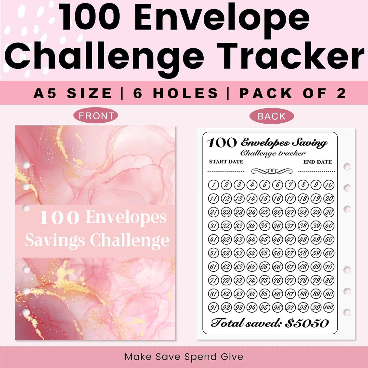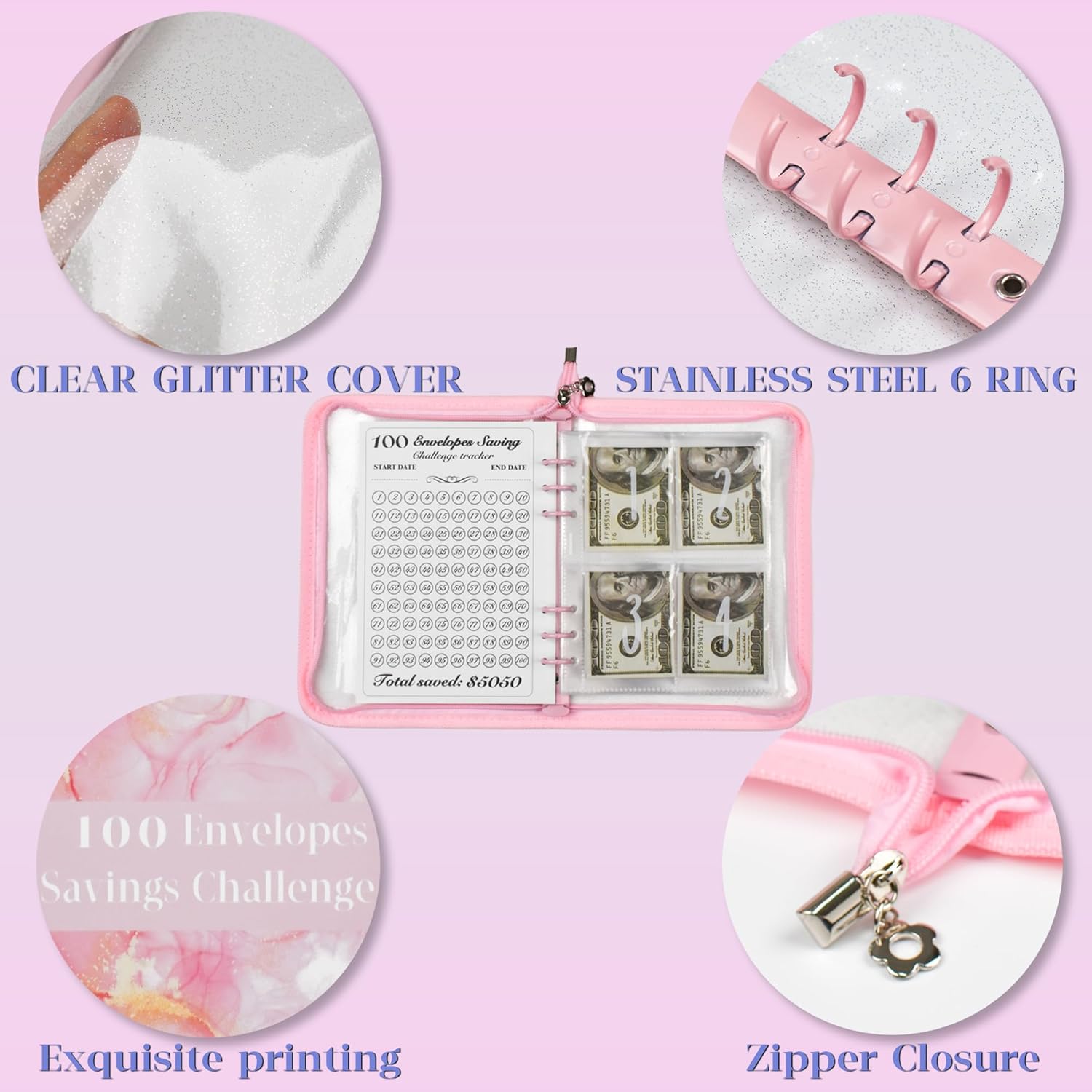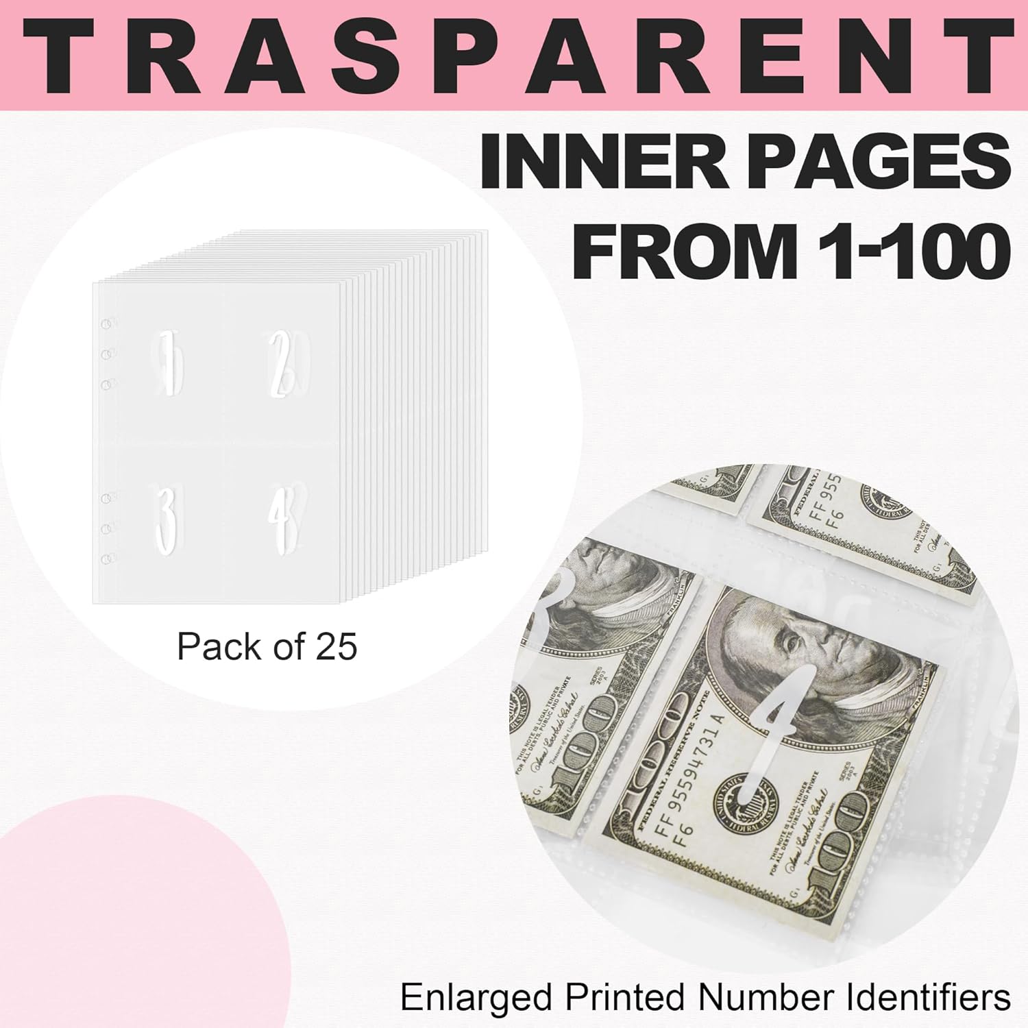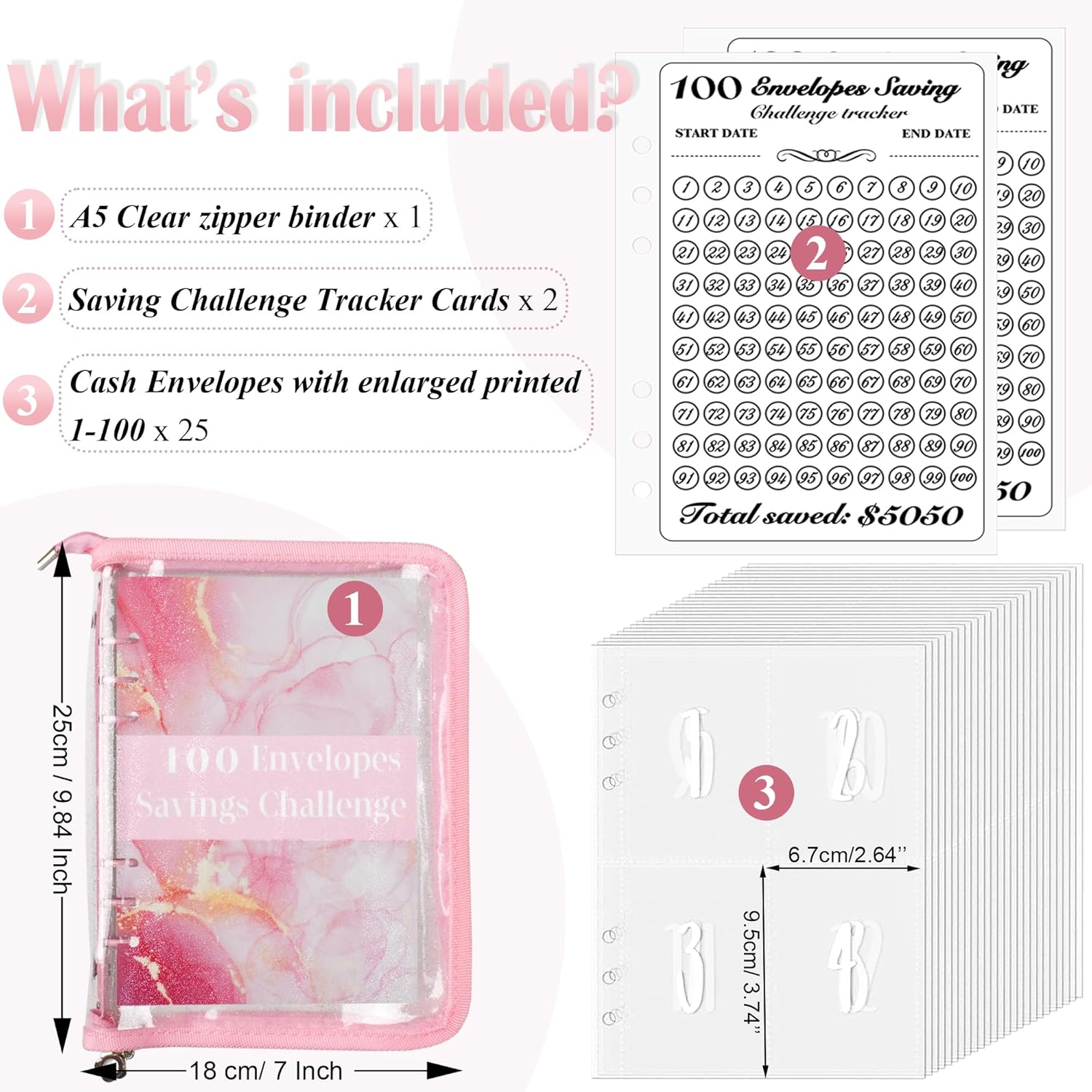 Kit di 100 buste per risparmiare denaro: questo kit di buste è progettato per aiutarti a risparmiare denaro in modo divertente e organizzato. Viene fornito con 1 raccoglitore in PU formato A5, 25 buste per contanti a 6 fori stampate con il numero 1-100 e 2 fogli tracker, fornendo un metodo semplice per risparmiare fino a $5.050. Materiale di alta qualità: il raccoglitore è progettato con una chiusura a cerniera di alta qualità, le buste sono trasparenti, impermeabili e resistenti ai graffi, proteggono i tuoi contanti da acqua e polvere. Il raccoglitore è compatibile con tutte le pagine interne standard A5 a 6 fori, in modo da poter facilmente aggiungere o rimuovere le pagine secondo necessità. Le dimensioni compatte del raccoglitore per contanti ti consentono di portarlo con te ovunque durante i tuoi spostamenti quotidiani, al lavoro o anche in vacanza. Buste con identificatori stampati da 1 a 100 ingranditi: a differenza di altre pagine senza numeri numerici o richiedono l'incollaggio manuale di adesivi, le nostre pagine presentano numeri numerici chiaramente stampati e ingranditi, rendendole più comode da usare. Puoi trovare la busta di cui hai bisogno a colpo d'occhio. Carte tracciabili essenziali per la sfida di risparmio di buste: per migliorare la tua esperienza di tracciamento, questo set contiene due carte di tracciamento. Queste carte ti aiutano a monitorare i tuoi progressi di risparmio e ti motivano a raggiungere i tuoi obiettivi in tempo. Quando si salva un determinato importo, è sufficiente contrassegnare l'icona del numero corrispondente. Una volta contrassegnate tutte le icone, la sfida di risparmio viene completata con successo. Questo metodo rende il monitoraggio dei progressi dei tuoi risparmi senza sforzo. Un regalo pratico ed educativo: il kit di 100 buste è uno strumento pratico ed educativo che incoraggia il coinvolgimento della famiglia nel risparmiare denaro. Impegnandosi in sfide di risparmio, le persone possono divertirsi mentre si prendono cura delle proprie finanze. È un regalo premuroso e pratico per amici e familiari per risparmiare facilmente denaro e iniziare a lavorare per raggiungere i loro obiettivi finanziari.