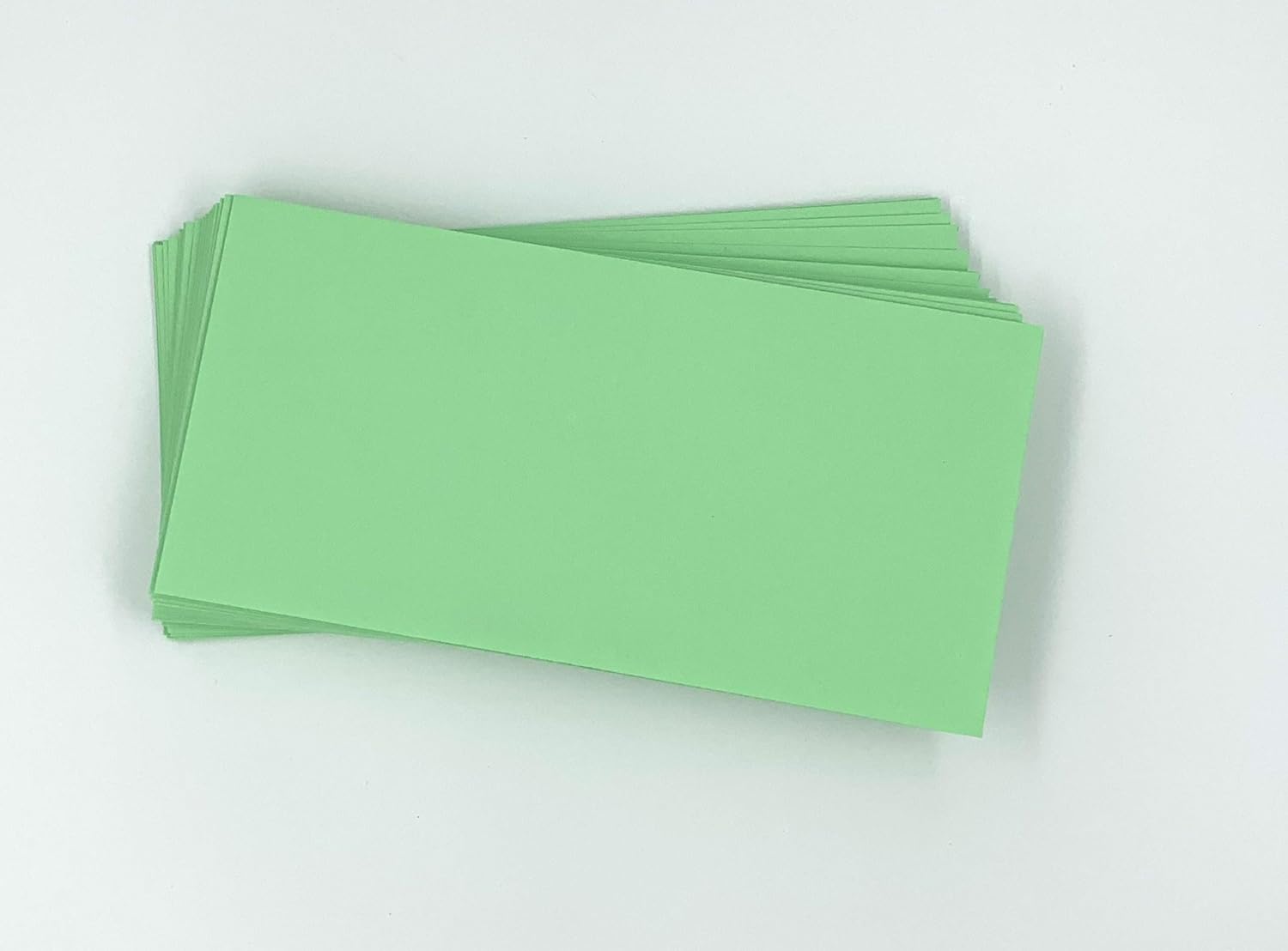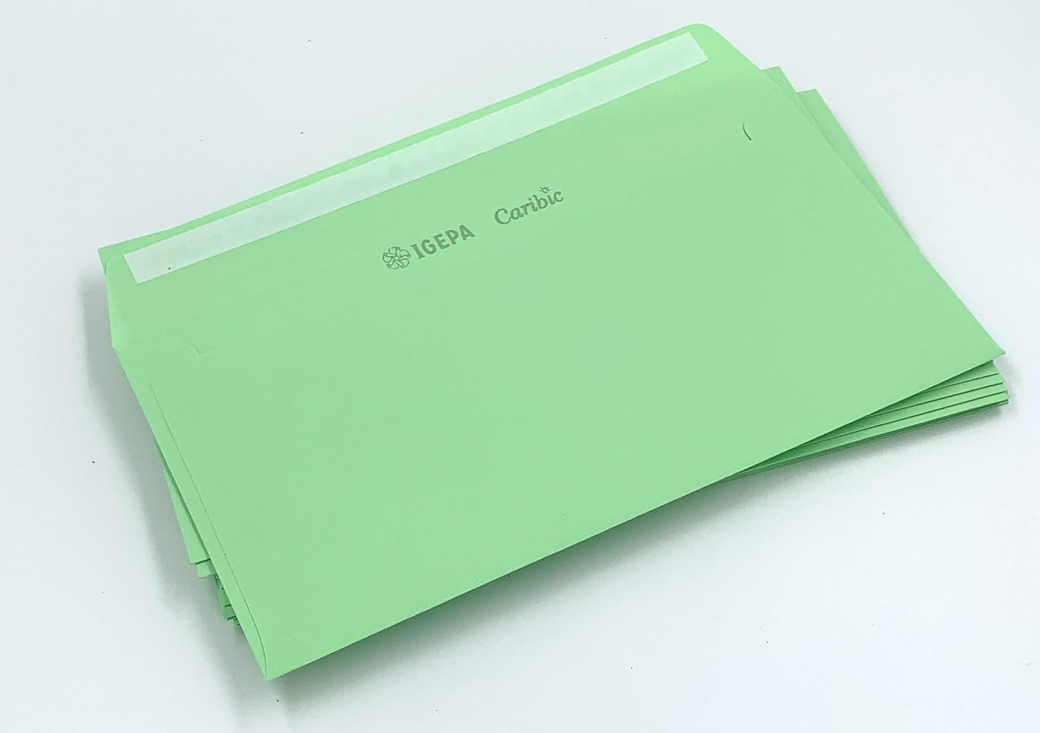 Buste in formato DIN lungo = 220 x 110 mm. Caribic di Igepa. Comoda da chiudere con striscia adesiva. Colore: verde, verde chiaro, verde menta. 90 g/m², senza lignina.