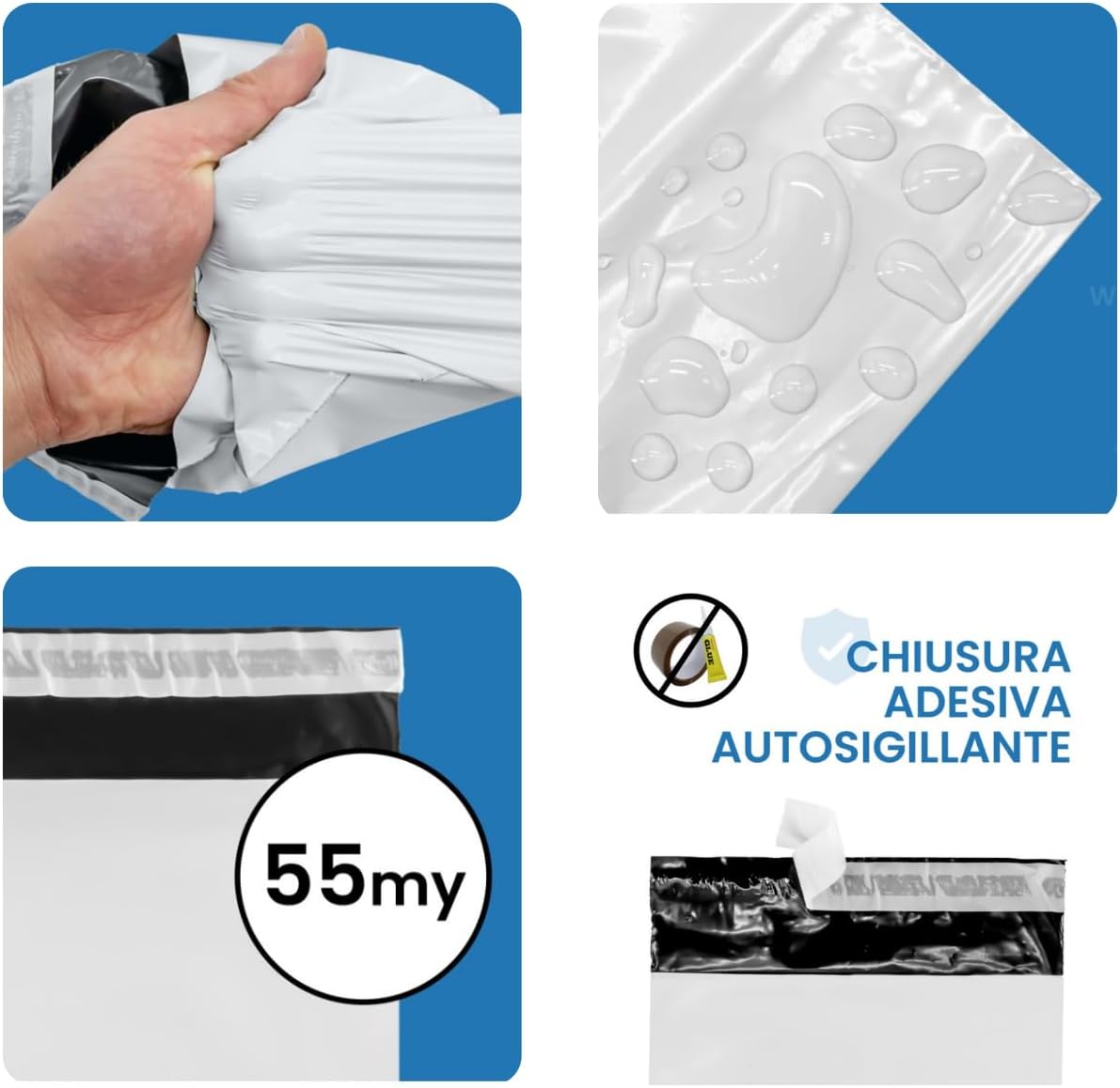 BUSTE PER SPEDIZIONI IMPERMEABILI: Buste in polietilene bianco opaco, ideali per nascondere il contenuto e mantenere protetta la privacy del cliente CHIUSURA ADESIVA AUTOSIGILLANTE: La pratica chiusura non necessita di nastro o colla aggiuntiva BUSTE OTTIME PER TRASPORTARE CARICHI ELEVATI: Offrono ottima resistenza per carichi elevati di spedizione e oggetti pesanti, utili per corrieri e per spedizioni ALTAMENTE RESISTENTI AGLI STRAPPI E ANTI-UMIDITÀ: Buste con spessore 55micron con ottima resistenza a strappi e manomissioni per un trasporto sicuro e affidabile PRODOTTO VERSATILE E DISPONIBILE IN DIVERSI FORMATI: Tanti formati e misure disponibili, dall'XL al all'A5 per soddisfare ogni esigenza di spedizione come l'invio di vestiti, carichi pesanti o oggetti di dimensioni più piccole