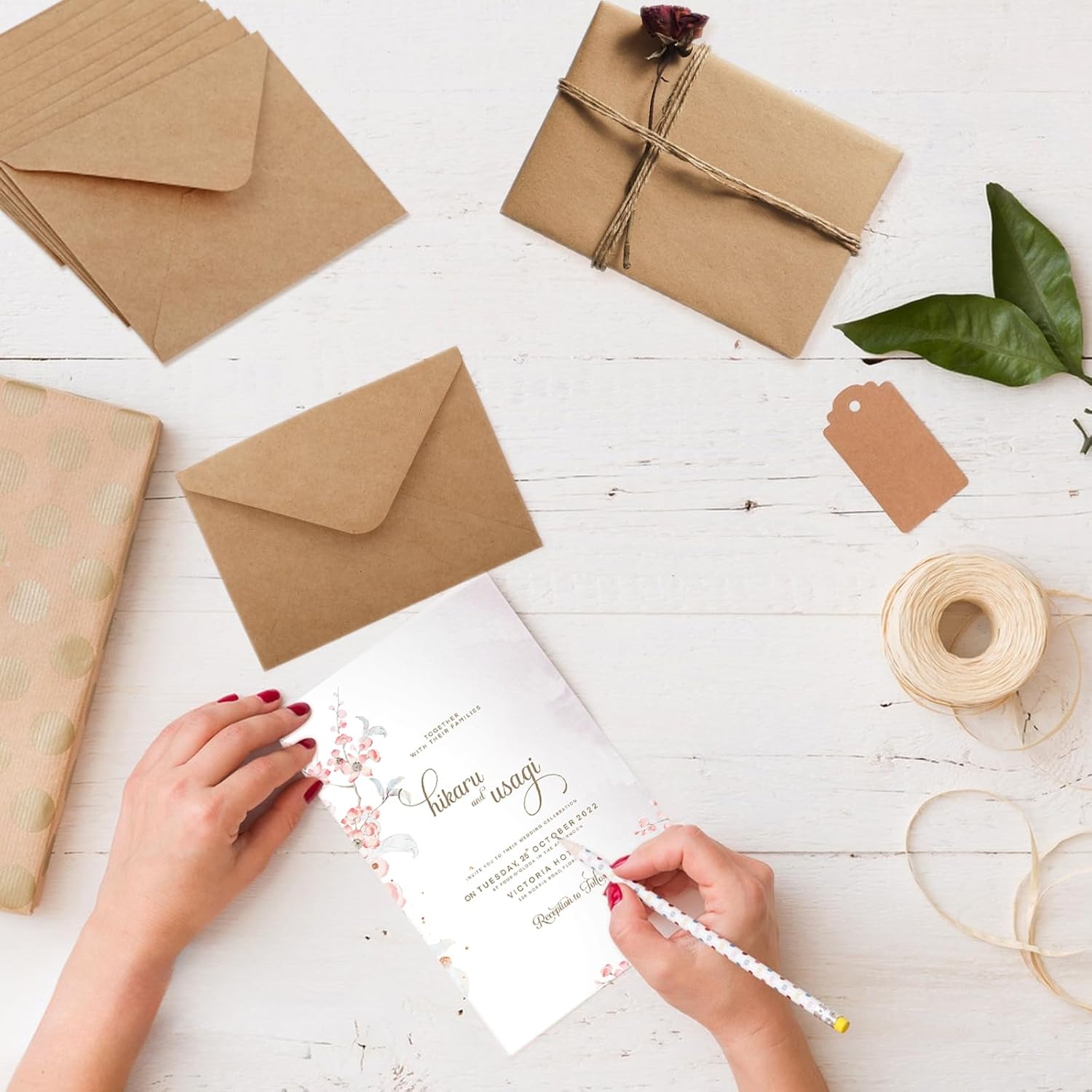 Formato Pratico e Confezione Grande: Contiene 100 Buste in Carta Kraft di formato B6 (18,4 x 13,3 cm). Offre spazio sufficiente per cartoline, foto e biglietti A6, rendendole perfette per l'uso quotidiano. Materiale di Alta Qualità: Queste Buste per Lettere sono realizzate in carta kraft marrone da 120 g/m², resistente agli strappi e robusta, fornendo una protezione ottimale per i vostri documenti e cartoline. Chiusura Classica con Colla Umidificabile: Le buste sono dotate di un affidabile design di chiusura a colla umidificabile. Basta inumidire leggermente il lembo e premere per garantire una sigillatura salda e durevole. Uso Versatile: Questo formato B6 è ideale per biglietti di auguri, inviti, biglietti di compleanno e corrispondenza commerciale, adatto sia per uso privato che aziendale. Scrivibile e Stampabile: La superficie di questa busta è liscia, perfetta per la scrittura a mano ed è compatibile con la maggior parte delle stampanti a getto d'inchiostro. Si prega di lasciar asciugare l'inchiostro per alcuni minuti dopo la stampa per evitare sbavature.