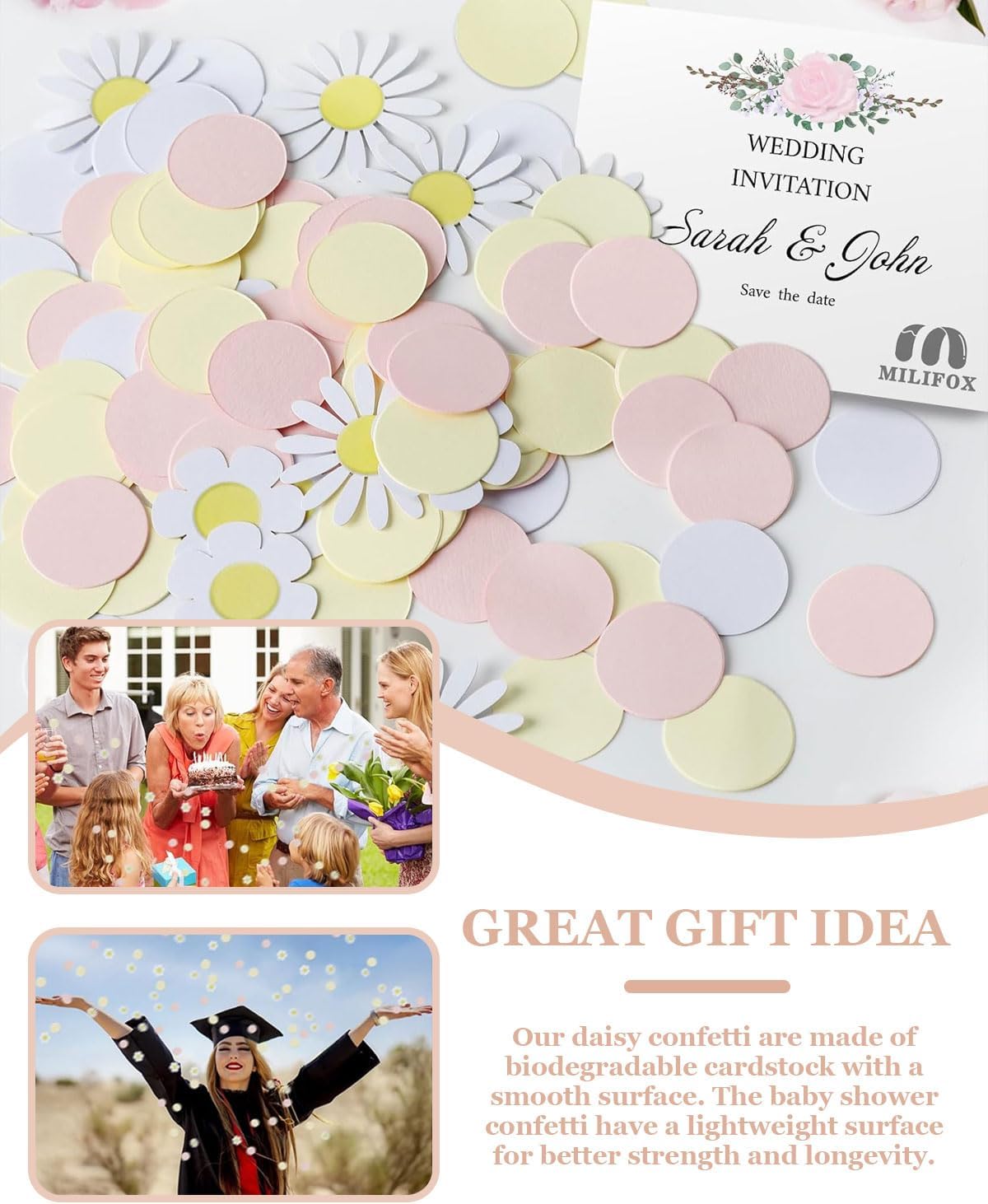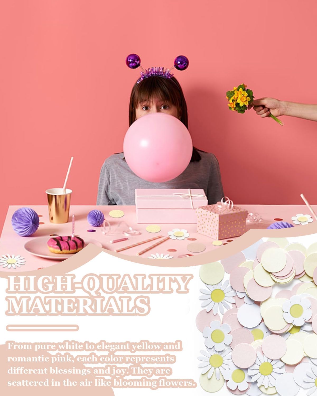 Cosa riceverai: Acquistando il nostro set di 100 pezzi di festoni con coriandoli a forma di margherita, riceverai una confezione completa di coriandoli floreali perfetti per decorare la tua festa con stile e allegria. Materiale di alta qualità: I coriandoli sono realizzati con carta di alta qualità, resistente e leggera, che garantisce una decorazione elegante e duratura. Design e caratteristiche: Ogni coriandolo ha una forma di margherita ben definita e un colore vivace, ideali per creare un’atmosfera festosa e colorata. Facili da distribuire e posizionare, sono perfetti per ogni tipo di decorazione. Ideale per: Ottimi per decorare torte, tavoli e ambienti per compleanni, lauree e altre celebrazioni. Adatti a tutti, dai bambini agli adulti, aggiungono un tocco floreale e festivo a qualsiasi evento. Grazie per il tuo acquisto: Ti ringraziamo sinceramente per aver scelto i nostri coriandoli a forma di margherita! Siamo entusiasti di offrire un prodotto che renderà le tue celebrazioni ancora più speciali e siamo sempre disponibili per qualsiasi ulteriore assistenza.