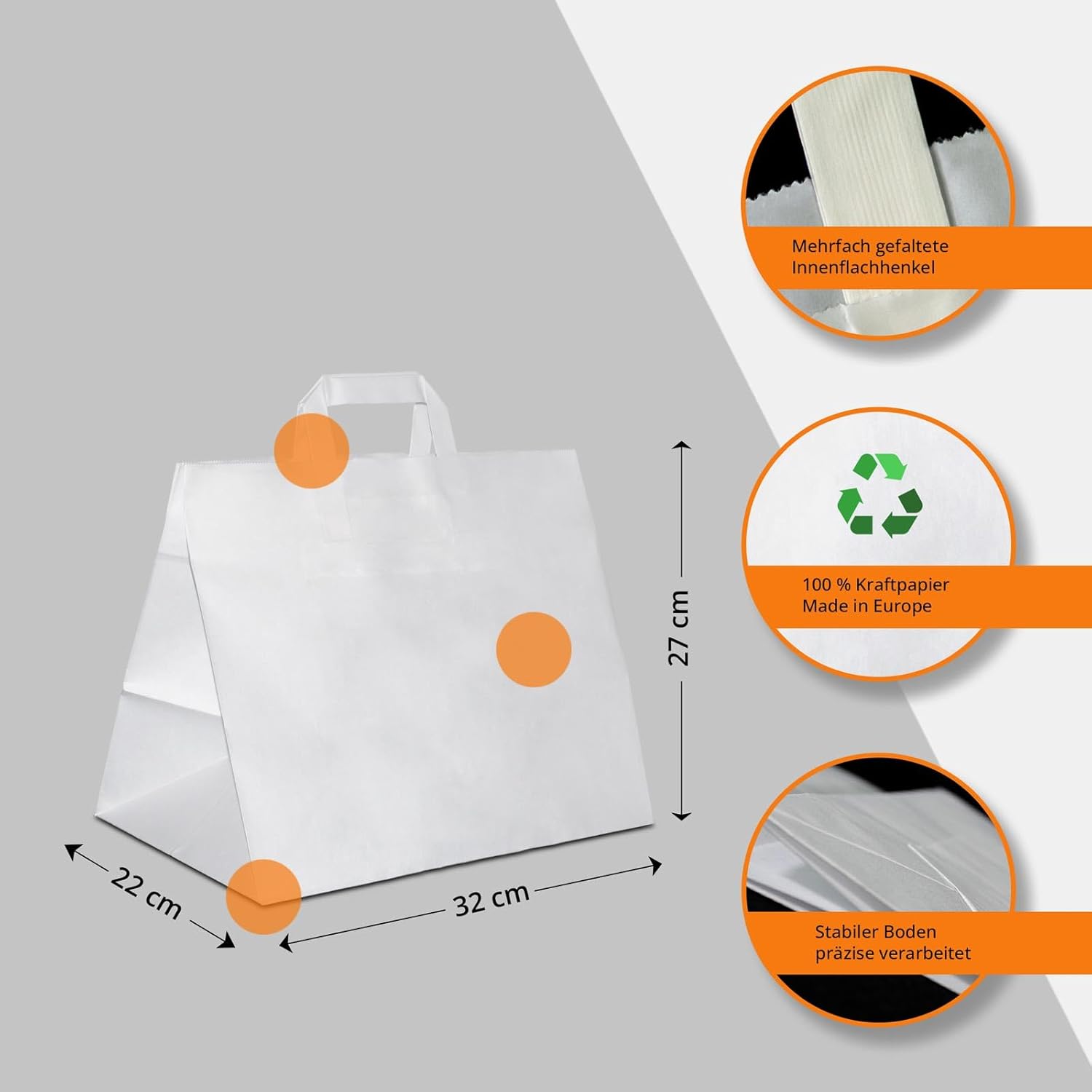 Confezione da 100 sacchetti To Go bianchi nel formato 32x22x27 (larghezza x piega inferiore x altezza) - ideali per torte, crostate, snack e specialità gastronomiche. Qualità premium: i sacchetti marroni da panettiere sono realizzati in carta kraft robusta e di alta qualità. La maniglia piegata a 5 pieghe è incollata all'interno e realizzata in carta robusta ed ecologica. Sostenibile: le borse della spesa in carta sono riciclabili al 100% e possono essere smaltite insieme alla carta straccia. Elevati standard ambientali poiché è prodotto all'interno dell'UE. Spedizione: I nostri sacchetti da asporto vengono spediti dal nostro magazzino di Dietmannsried al più tardi il giorno successivo e saranno poi da voi il più rapidamente possibile. Risparmia: le nostre sac à poche a fondo largo vengono fornite in set, per questo motivo acquistando più sac à poche beneficerai di un prezzo complessivo più basso.