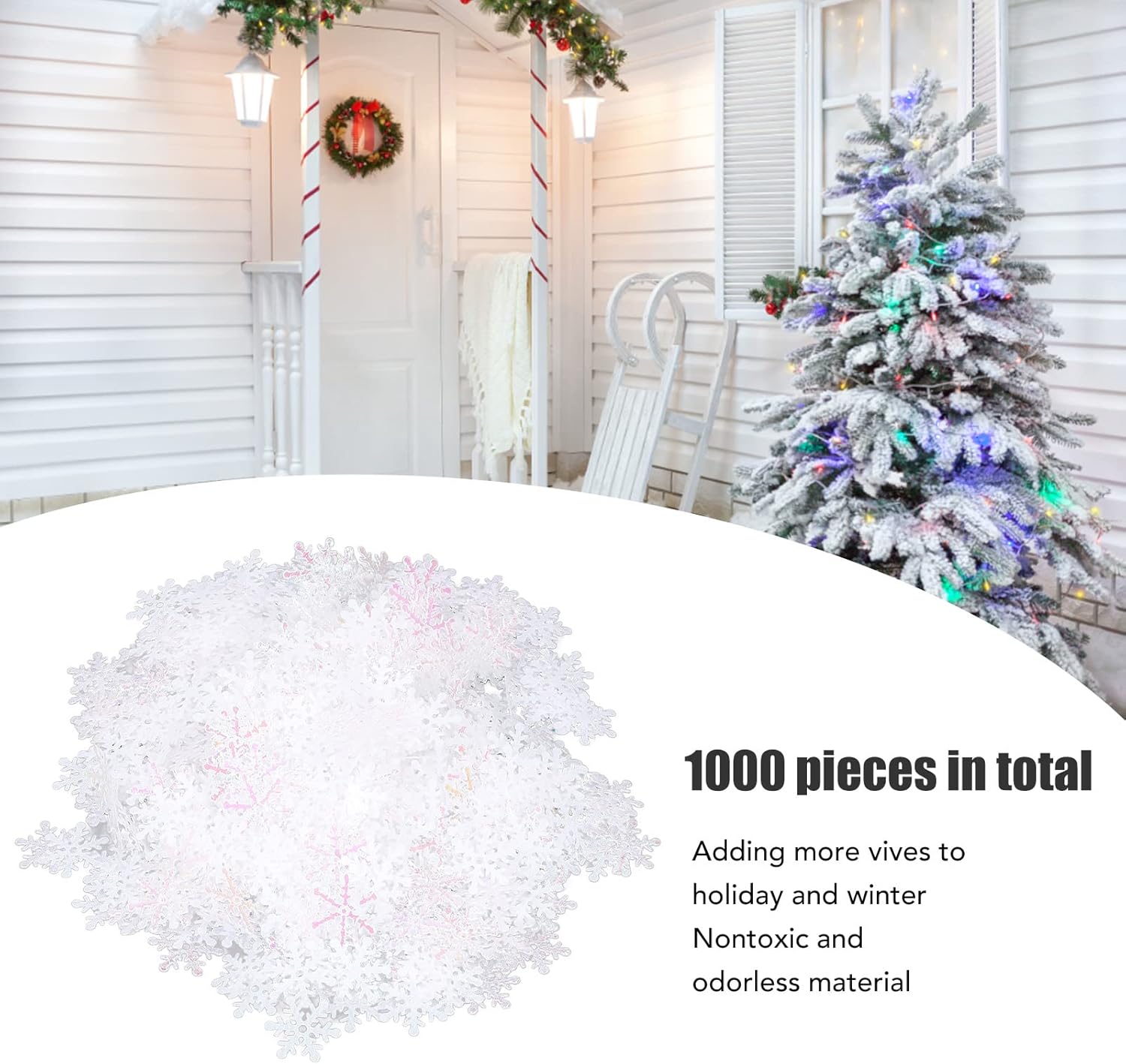 1000 pezzi: coriandoli da tavolo con fiocchi di neve da 1000 pezzi sono confezionati insieme per soddisfare le diverse esigenze di decorazione. Colori vivaci: questi coriandoli di fiocchi di neve sono saturi di colori vivaci e aggiungono brillantezza al tuo umore natalizio. Larghezza 0,9 pollici: questi coriandoli di neve sono larghi circa 0,9 pollici ed sono realizzati in materiale plastico resistente e non tossico. Multiuso: questi coriandoli invernali possono decorare la tua borsa, confezione regalo, albero di Natale, vaso e qualsiasi posto tu voglia. Stile fiocco di neve: questi coriandoli natalizi in stile fiocco di neve, che si adattano al tema natalizio e invernale, ti regaleranno ricordi indimenticabili delle vacanze.