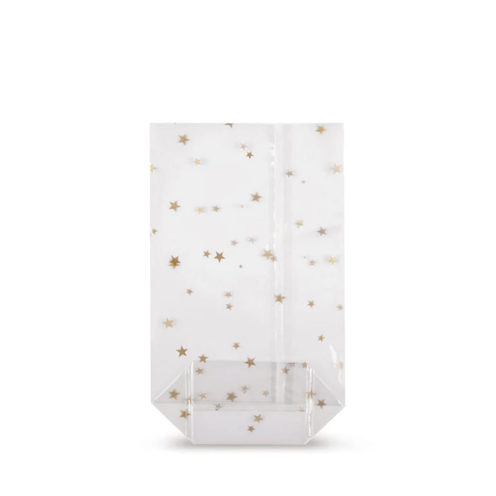 Pratico sacchetto con fondo trasparente per la vendita al dettaglio Con elegante motivo neutro "Stelle d'oro" Ideale per dolci, pan di zenzero, figure di marzapane, regali, ecc. nel settore natalizio Disponibili in vari formati pratici, stampabili anche individualmente Con licenza di imballaggio secondo la legge tedesca sugli imballaggi