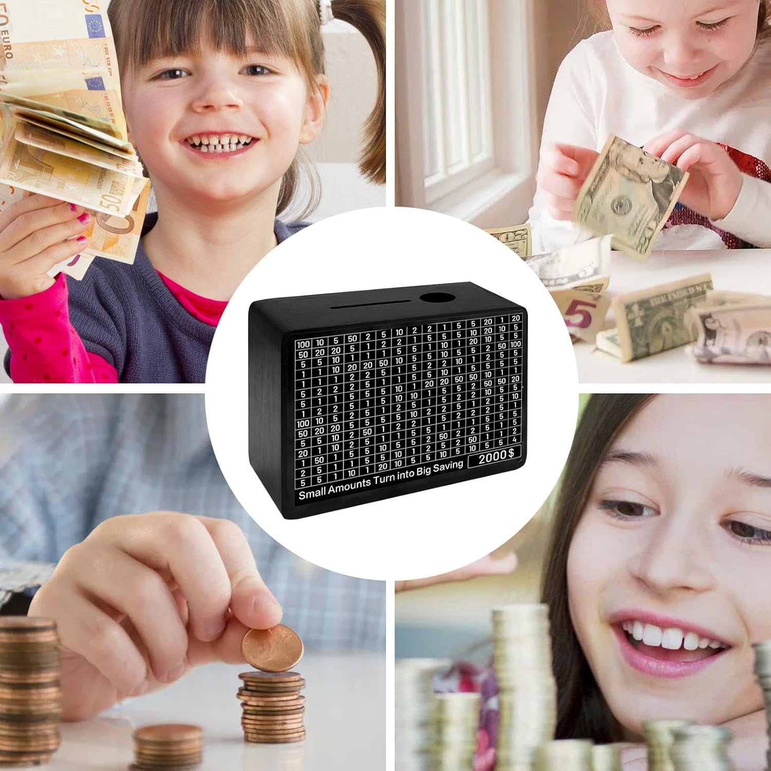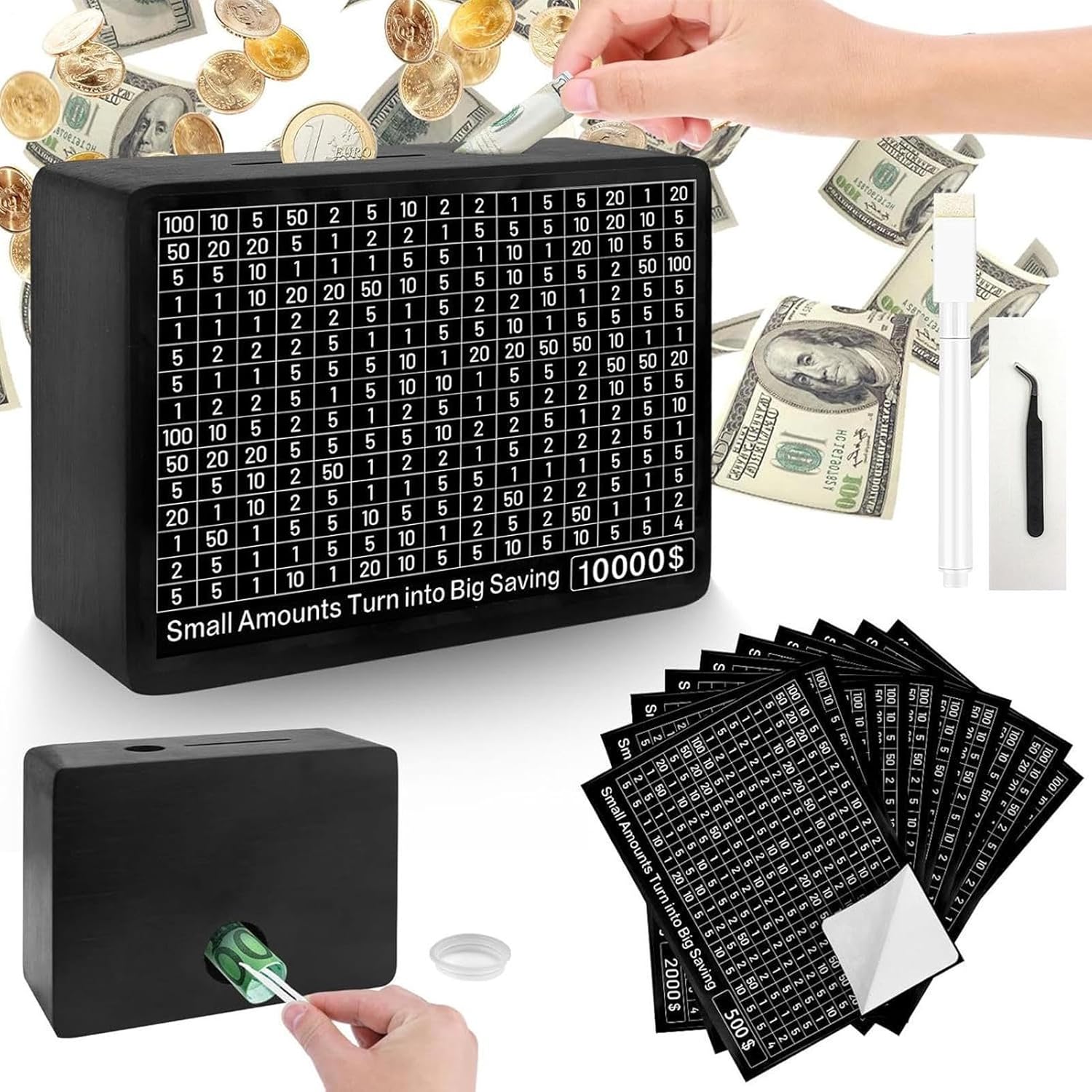 Stabilisci obiettivi e risparmia: sfida del salvadanaioLa sfida di risparmio 10000 è progettata per sviluppare buone abitudini di risparmio e insegnare l'importanza di fissare obiettivi di denaro. Raggiungi ogni traguardo con gli adesivi per obiettivi inclusi di varie quantità e accumula gradualmente piccole quantità di denaro per raggiungere grandi obiettivi di risparmio Permettere ai bambini di risparmiare: scatola degli obiettivi di risparmio La nostra scatola di sfida di risparmio 10000 incoraggia i bambini a partecipare attivamente al processo di risparmio con un design interattivo. Dotato di marcatori speciali ed etichette numeriche verificabili, è conveniente per i bambini registrare e monitorare i progressi migliorando le loro abilità matematiche e il senso di responsabilità Materiale di buona qualità: scatola di risparmio economico La nostra scatola di sfida di risparmio 10000 è realizzata con materiali ecologici di alta qualità e realizzata con legno massello naturale. Tutti gli angoli sono arrotondati per evitare danni ai bambini. Ciò garantisce la fermezza e la sicurezza del prodotto, consentendo ai genitori di usarlo con fiducia Retro ed elegante: sfida da 10000 contanti Aggiungi un tocco di eleganza ai tuoi risparmi con la scatola sfida di risparmio 10000. La squisita lavorazione in legno e il design carino ispirano interesse e orgoglio nel risparmio, rendendolo una decorazione che sarai orgoglioso di mostrare Ottimo regalo: scatola risparmio di denaro Con la nostra scatola di sfida di risparmio 10000, sfida di risparmio in contanti stai dando un regalo pratico ed educativo che promuove l'alfabetizzazione finanziaria e instilla preziose lezioni di vita