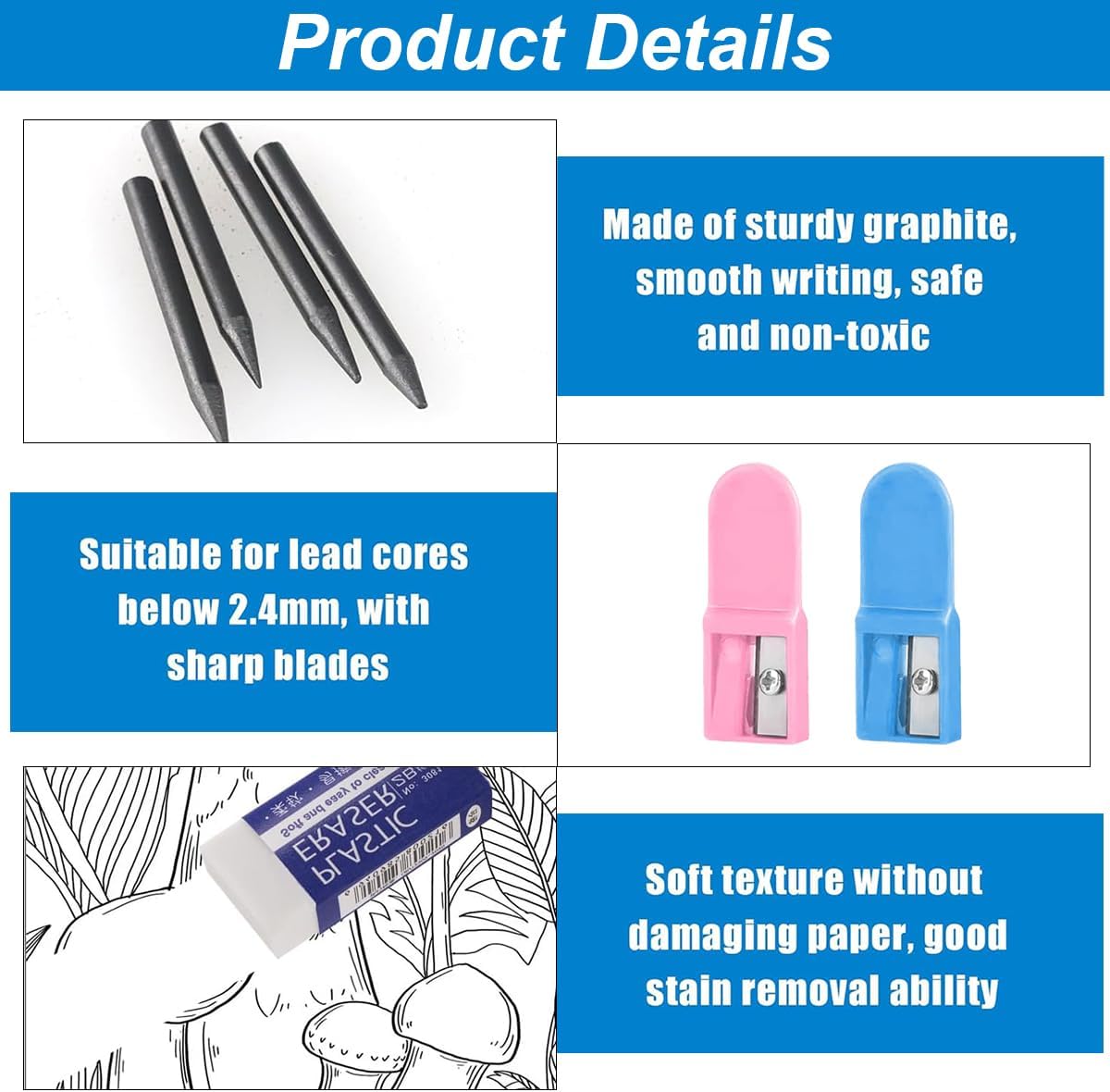 Quantità sufficiente: Il set di mine sostitutive Circle contiene un totale di 100 mine sostitutive Circle, in dieci scatole trasparenti. Viene fornito con due affilatori e una gomma. La quantità è sufficiente per l'uso quotidiano. Puoi anche condividere con i tuoi amici. Dimensioni 2mm: Ogni miniera di bussola è lunga 2 cm e ha un diametro di 2mm Modello 2B, per l'uso con la maggior parte delle bussole intercambiabili e matite, anche per applicazioni generali di scrittura. Con l'affilatore della miniera della bussola, è possibile affilarlo dopo l'uso ripetuto. Forte ma scrive liscio: Le miniere circolari sono fatte di grafite e argilla, che possono aumentare la durezza delle miniere circolari, stabili e non facili da rompere. Sicuro e non tossico, forte e durevole. Le miniere circolari scrivono senza intoppi, il che aiuta a utilizzare le bussole nel modo più semplice e ti dà una buona esperienza di scrittura. Facile da trasportare: le nostre miniere di bussola 2B fornite con 1 scatola di stoccaggio trasparente, la scatola è leggera, ha una grande capacità, può facilmente memorizzare una varietà di strumenti, è facile da trasportare quando si viaggia, viene fornito con due pulsanti, doppia assicurazione, alta sicurezza, non facile da perdere. Applicazione versatile: La miniera circolare da 2mm è perfetta per il disegno matematico, il disegno architettonico e uno strumento pratico per talenti politecnici e falegnami. Le miniere circolari durevoli sono adatte anche come regalo per i vostri bambini, amici e famiglia.