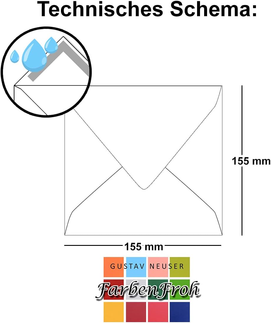 A VOI LA SCELTA: scegliete il vostro colore preferito e la quantità desiderata. CREATIVO: con biglietti personalizzati e decorati, le buste sono una sorpresa speciale per ogni destinatario. Date libero sfogo alla vostra immaginazione! Le buste possono essere inviate per posta o consegnate personalmente. QUALITÀ DEL COLORE: buste verde eucalipto con superficie opaca - carta completamente tinta: nessun sbiadimento, nessuna macchia di colore, colorazione uniforme e piacevole - SERIE FarbenFroh by GUSTAV NEUSER FORMATO: Quadrato - 155 x 155 mm (tolleranza fino a 2 mm) - Con classico lembo a punta e incollaggio a umido - Senza finestra - Alta qualità della carta con 100 g/m² - Molto stabile e robusto! CONTENUTI: 100 CAMBIAMENTI - GUSTAV NEUSER - Il professionista del cartoncino e della carta da oltre 100 anni!