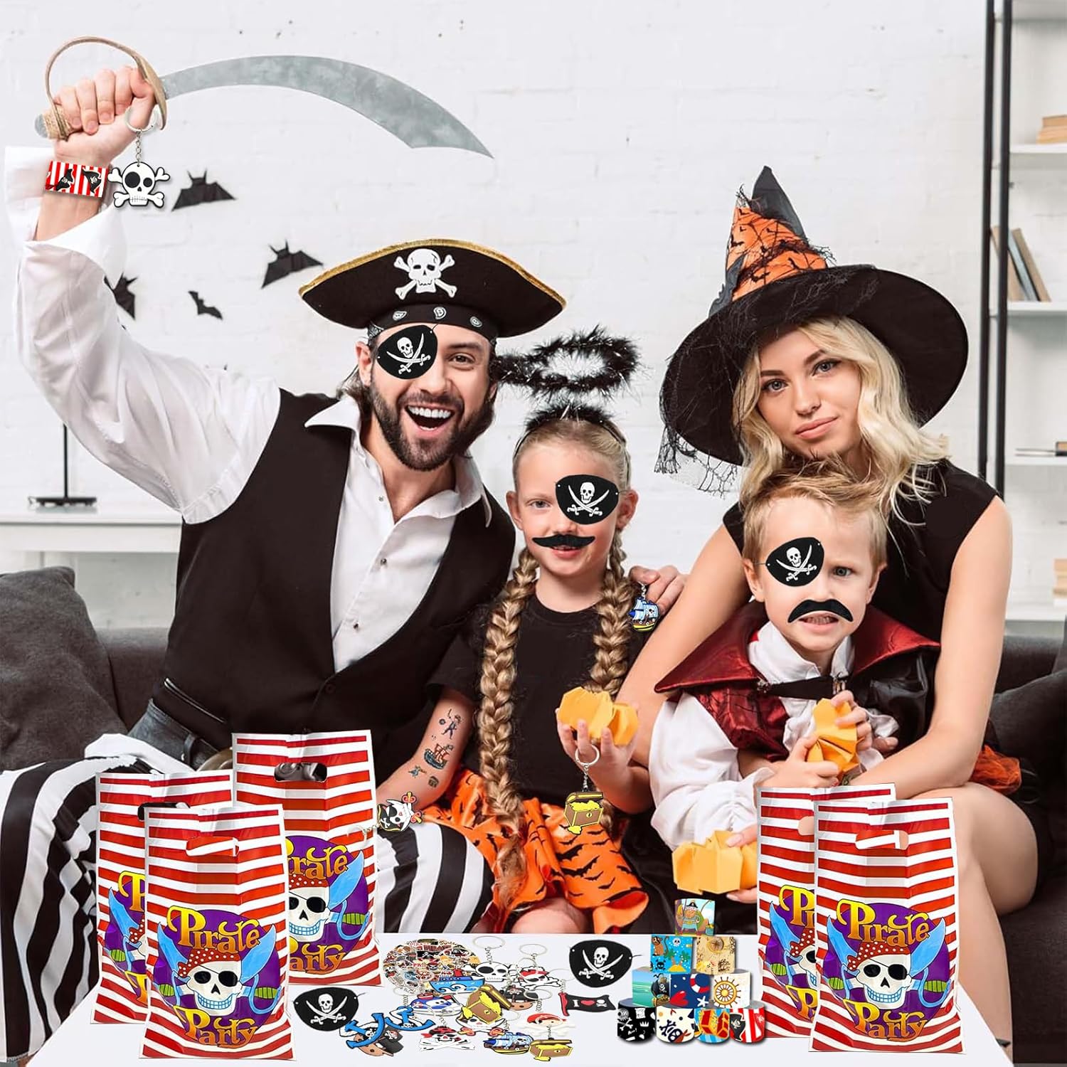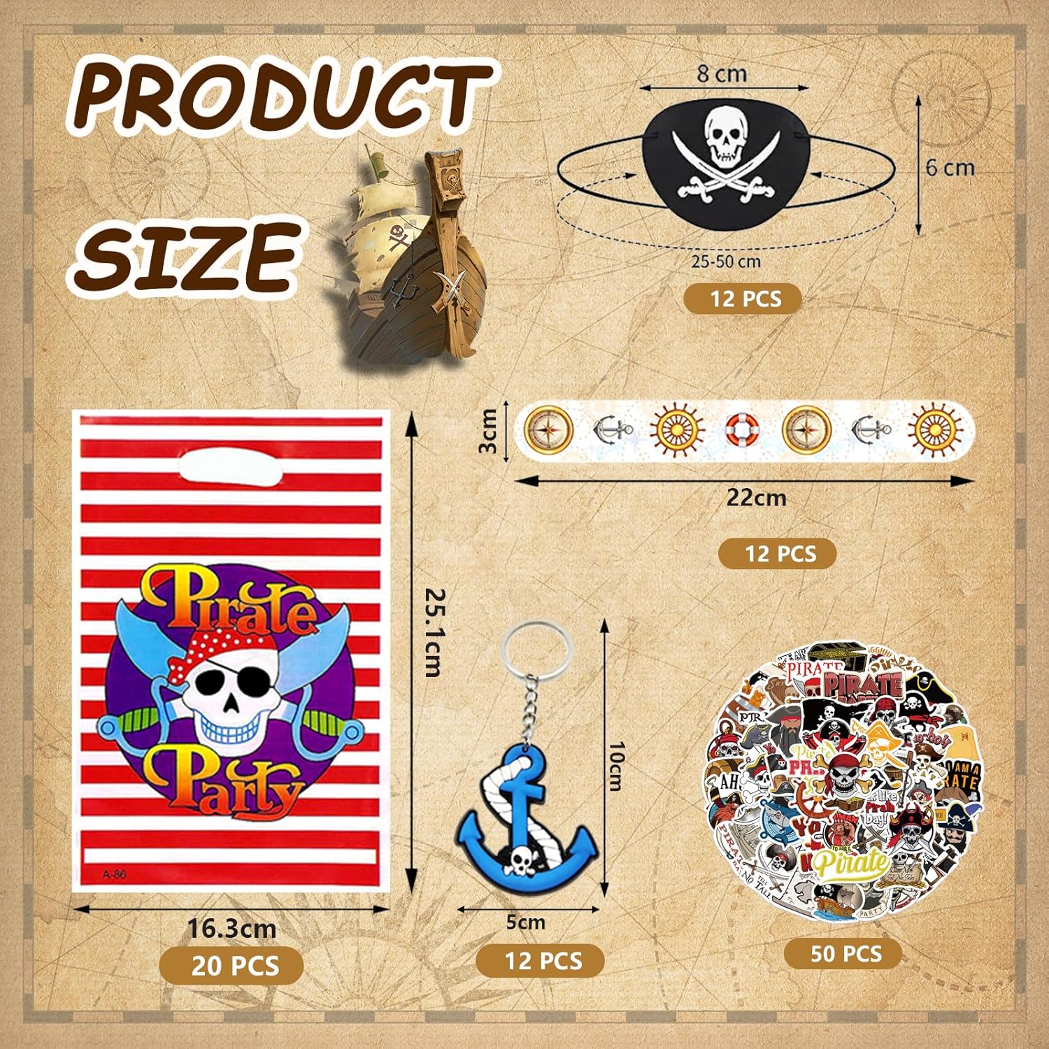 Idea regalo per feste a tema pirata. Contiene 50 adesivi, 20 sacchetti regalo, 12 benda per gli occhi dei pirati, 12 portachiavi, 12 braccialetti a scatto, offre graziose decorazioni e regali squisiti Materiali di alta qualità: la decorazione per portachiavi è realizzata in silicone di alta qualità e ganci in metallo, atossici e innocui, forti e durevoli. Il cinturino a scatto è realizzato in materiale PVC, sicuro da usare per i bambini. Gli accessori sono robusti e allo stesso tempo morbidi, ideali per giocare a lungo senza premere o scivolare. Inoltre possono essere utilizzati più volte Design classico e colori brillanti: gli accessori per feste per bambini a tema pirata contengono ricchi elementi pirati con dettagli squisiti e colori vivaci, affascinanti e brillanti, sono delicati e avventurosi e completano altri tipi di decorazioni con motivi pirati 【Facile da trasportare】 Regalo di compleanno per bambini, grande quantità e stili ricchi, bordi lisci senza sbavature, buona sensazione al tatto, leggero e facile da riporre. Regalo perfetto per ragazze e ragazzi di età compresa tra 3 e 12 anni. Può costruire e rafforzare meglio il rapporto tra te e tuo figlio Sorprendi i regali per le feste: questo è un set regalo di compleanno per bambini, selezionato in base agli hobby dei bambini. Perfetto per la decorazione dei pirati, feste per bambini, premi per feste dei bambini, premi di carnevale, regali di Halloween, regali di Natale