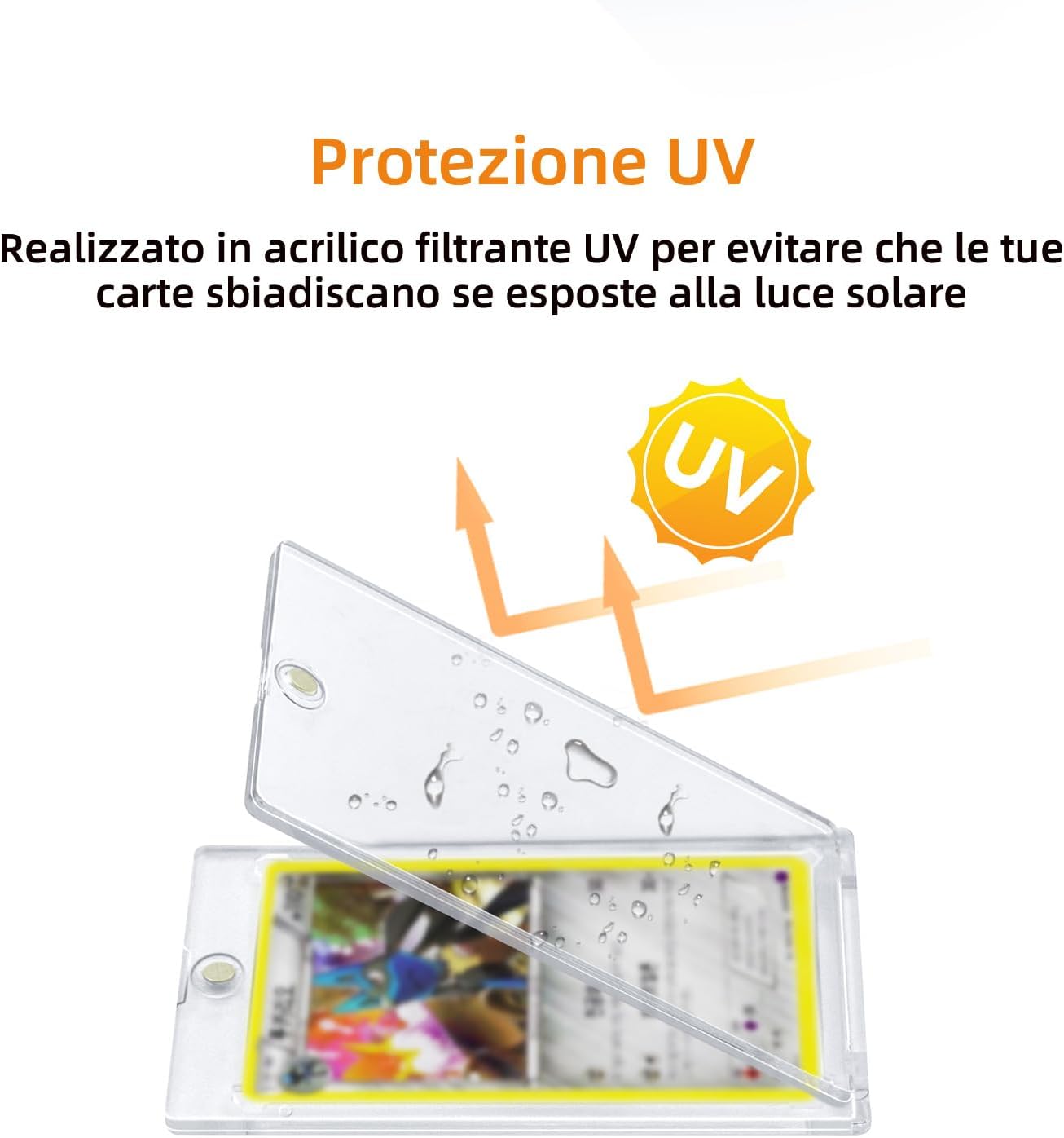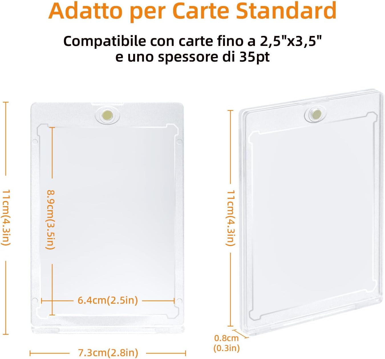 【Contenuto della confezione】 10 pezzi 35PT porta carte magnetiche in totale su un pacchetto. dimensioni: 11 x 7,3 x 0,8 cm. Si adattano alle dimensioni standard (2,5" x 3,5") delle carte sportive o di gioco. 【Apertura e chiusura magnetica】 Il portacarte magnetico ha una chiusura magnetica rotonda sulla parte superiore, che lo rende facile da aprire e chiudere. Mantiene la carta saldamente in posizione, non si stacca facilmente e ha un'elevata tenuta. Protegge efficacemente le carte da acqua, polvere, sudore, impronte digitali, piegature e graffi. 【Protezione UV + angoli a diamante】 I portacarte sportivi sono dotati di protezione UV - Proteggono le carte dallo sbiadimento, non c'è più da preoccuparsi che le carte di valore si sbiadiscano. E il design degli angoli a diamante protegge i quattro angoli delle vostre preziose carte dalla piegatura. 【Trasparente e trasparente】 Trasparente su entrambi i lati. I vostri biglietti saranno visualizzati chiaramente come se non ci fosse la protezione. È possibile vedere ogni dettaglio della carta senza doverla estrarre. I biglietti con codici a barre o codici QR possono essere scansionati senza doverli togliere dalle custodie. 【Ampia applicazione】Questi supporti per carte magnetiche 35PT sono perfettamente compatibili con TCG, MTG, carte Yu-Gi-Oh, carte sportive, carte di calcio, carte di baseball, carte di basket e carte commerciali. Perfetti per i regali di compleanno dei bambini, le ricompense per i compiti a casa o le calze di Natale.