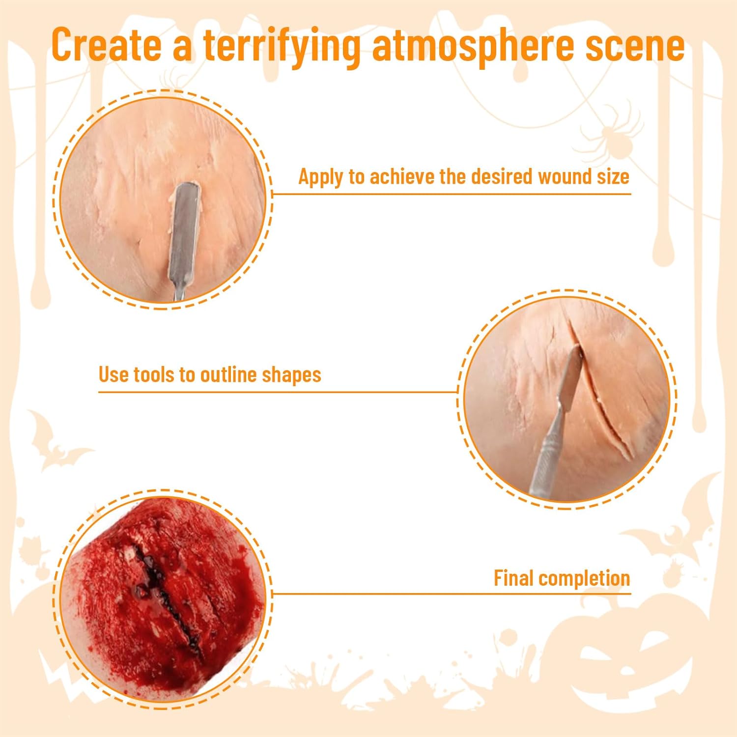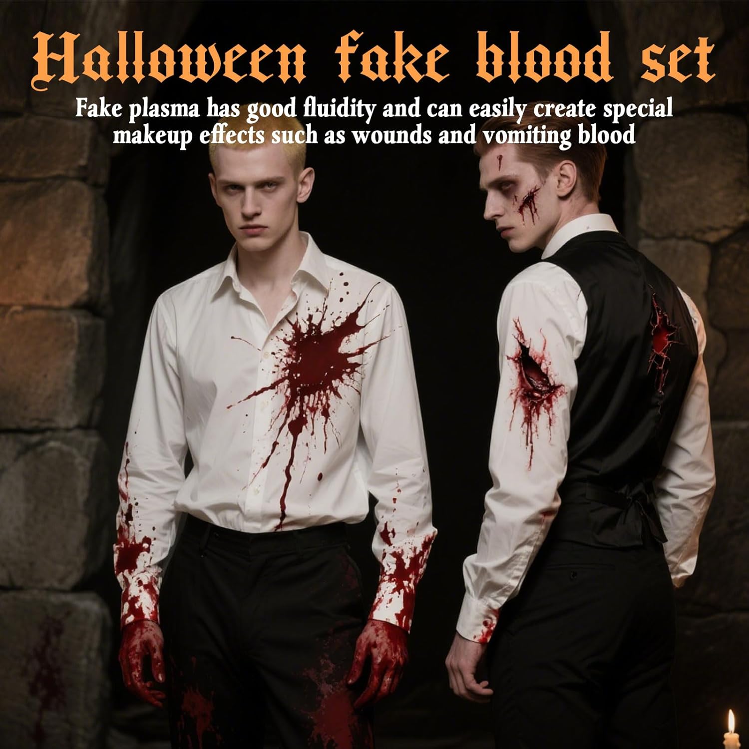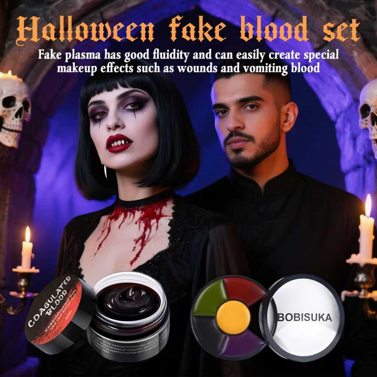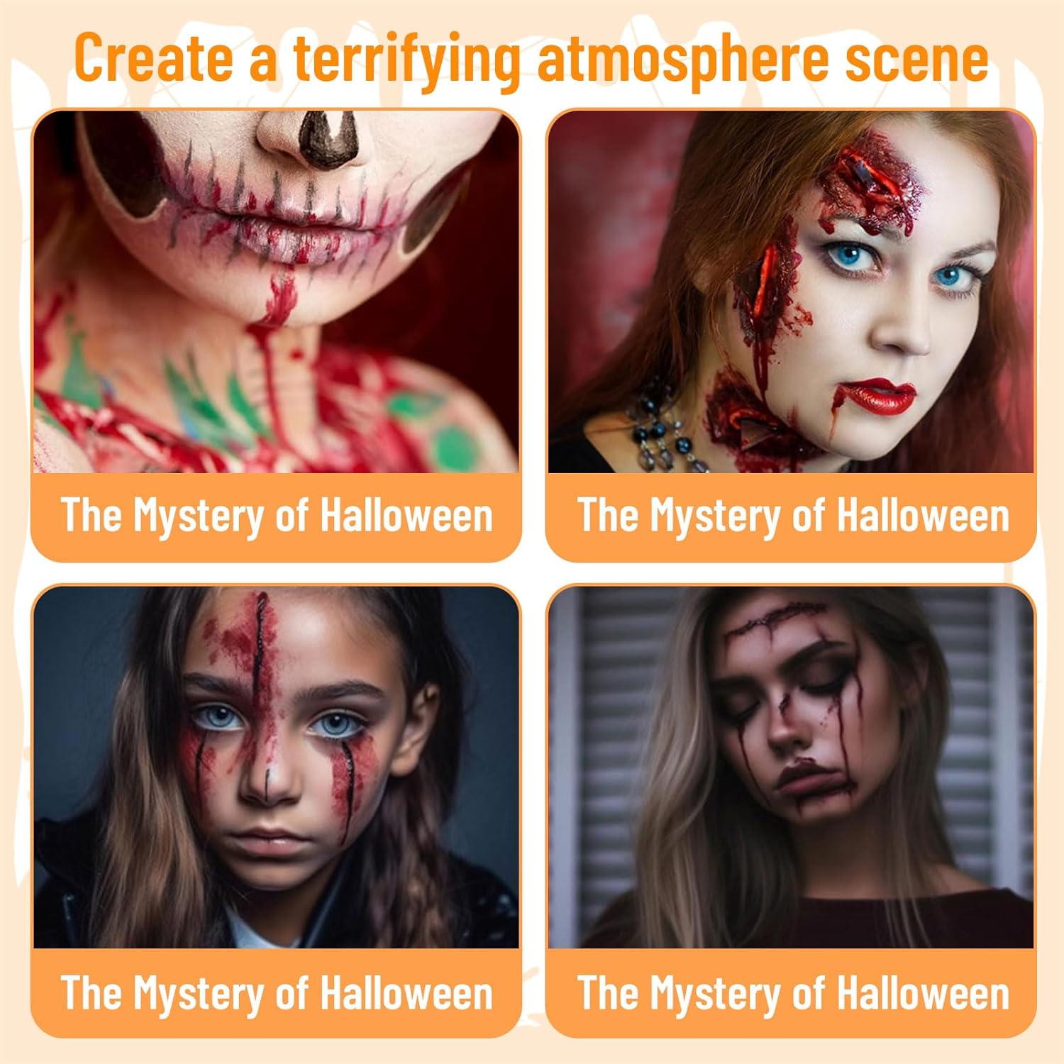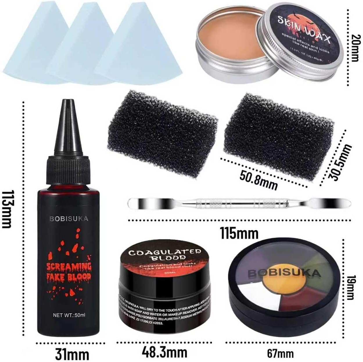 【Set di Trucco per Halloween con Sangue Finto】 questo set di trucco per halloween con sangue finto include plasma + unguento sangue + pittura viso + cera cicatrici finte + 5 spugne + raschietto. crea facilmente effetti spaventosi come ferite lividi sanguinanti dona immediatamente tuo personaggio aspetto terrificante. 【Materiali Sicuri】 Questo set trucco sangue e cicatrici per le allergie cutanee ed è lavabile. Si asciuga rapidamente in 30 secondi e può essere risciacquato accuratamente con acqua tiepida dopo la festa per evitare irritazioni cutanee. È adatto a pelli sensibili ed è adatto sia a bambini che ad adulti. 【Varie Combinazioni Trucco】 set trucco con cicatrici finte con sangue horror include 6 colori a olio impermeabili (nero, bianco, rosso, verde, viola e giallo), pennello lattice abbinato e un pennello anti-sbavature. Crea look classici come teschi vampiri look creativi come fantasmi e stregoneria: perfetto qualsiasi festa Halloween. 【Facile da Applicare】 Questo trucco effetti speciali è facile da applicare. Tuttavia, tieni presente che i nuovi prodotti devono essere testati dietro l'orecchio garantirne sicurezza chi soffre allergie. Per prima cosa, applica del lattice liquido su una spugna e copri l'attaccatura dei capelli. Utilizza una palette colori waterproof. 【Versatile】 Questo halloween makeup set è versatile e adatto a giochi di ruolo e feste a tema. Ti permette di creare rapidamente oltre 20 effetti classici, tra cui trucco da vampiro pallido, trucco da zombie in decomposizione e trucco da clown esagerato, perfetto per le feste.