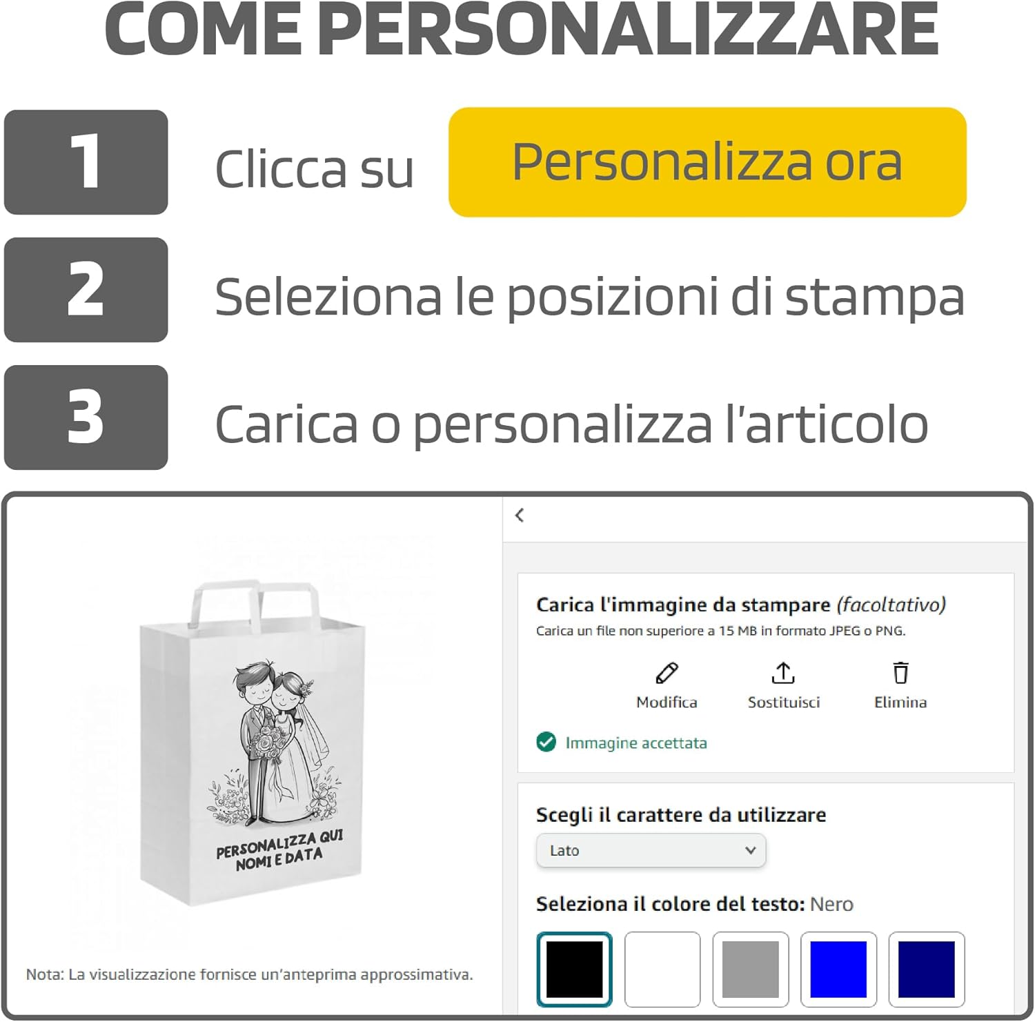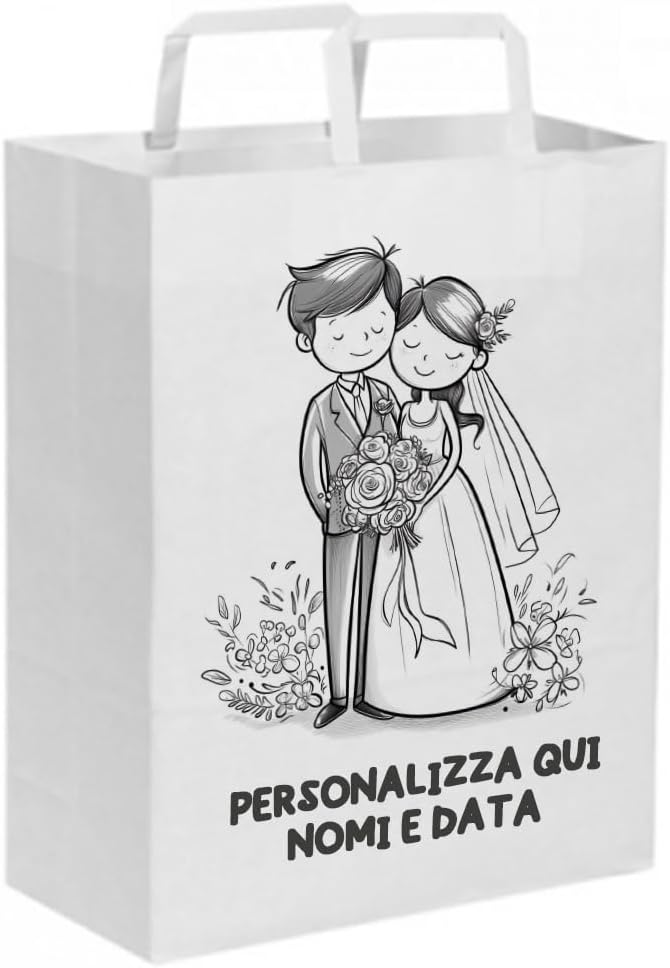 Buste personalizzate: Le buste sono realizzate in carta kraft bianca e personalizzate con il nome degli sposi e la data del matrimonio. Design elegante: Il design è semplice ed elegante con una maniglia piatta in carta che rende la busta facile da trasportare. Dimensioni adatte: Le dimensioni 19x24cm sono perfette per contenere biglietti, confetti o piccoli omaggi per gli invitati. Realizzate a mano: Le buste sono realizzate artigianalmente in Italia con carta e inchiostri atossici e rispettosi dell'ambiente.